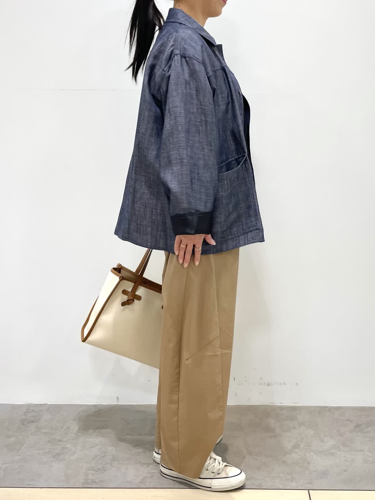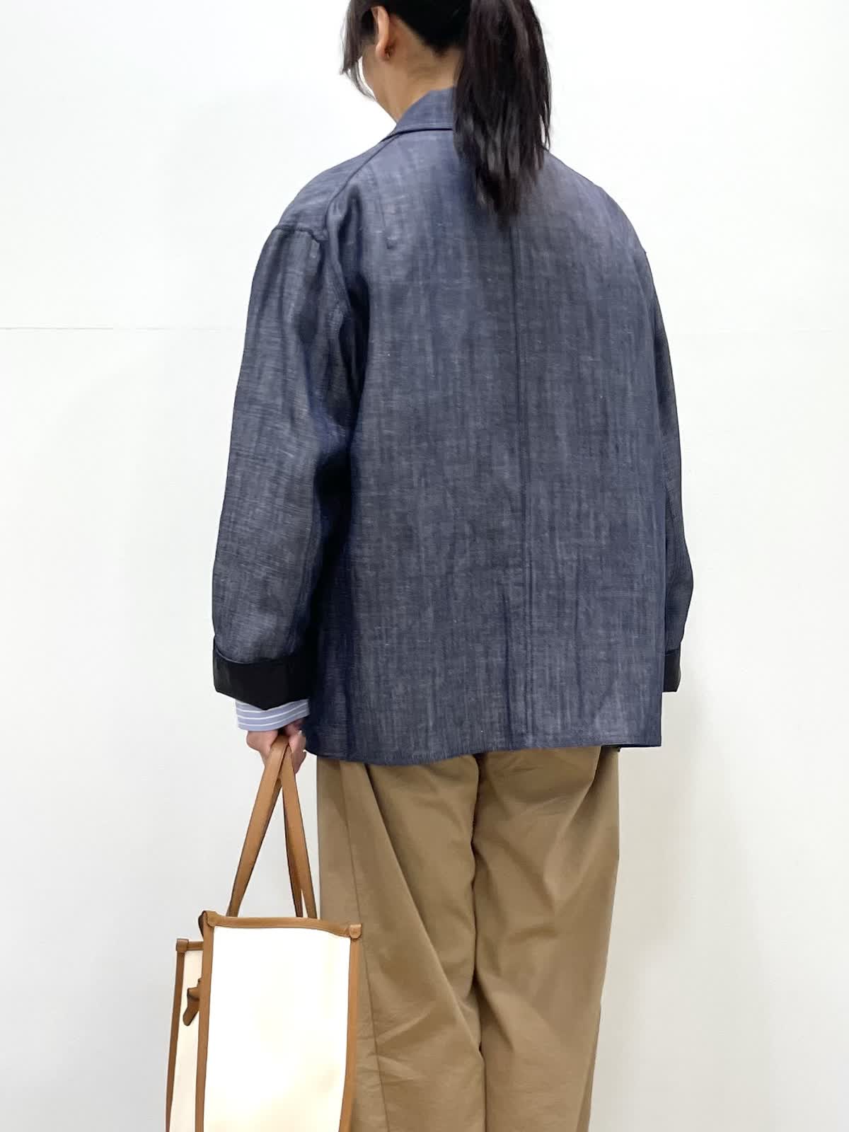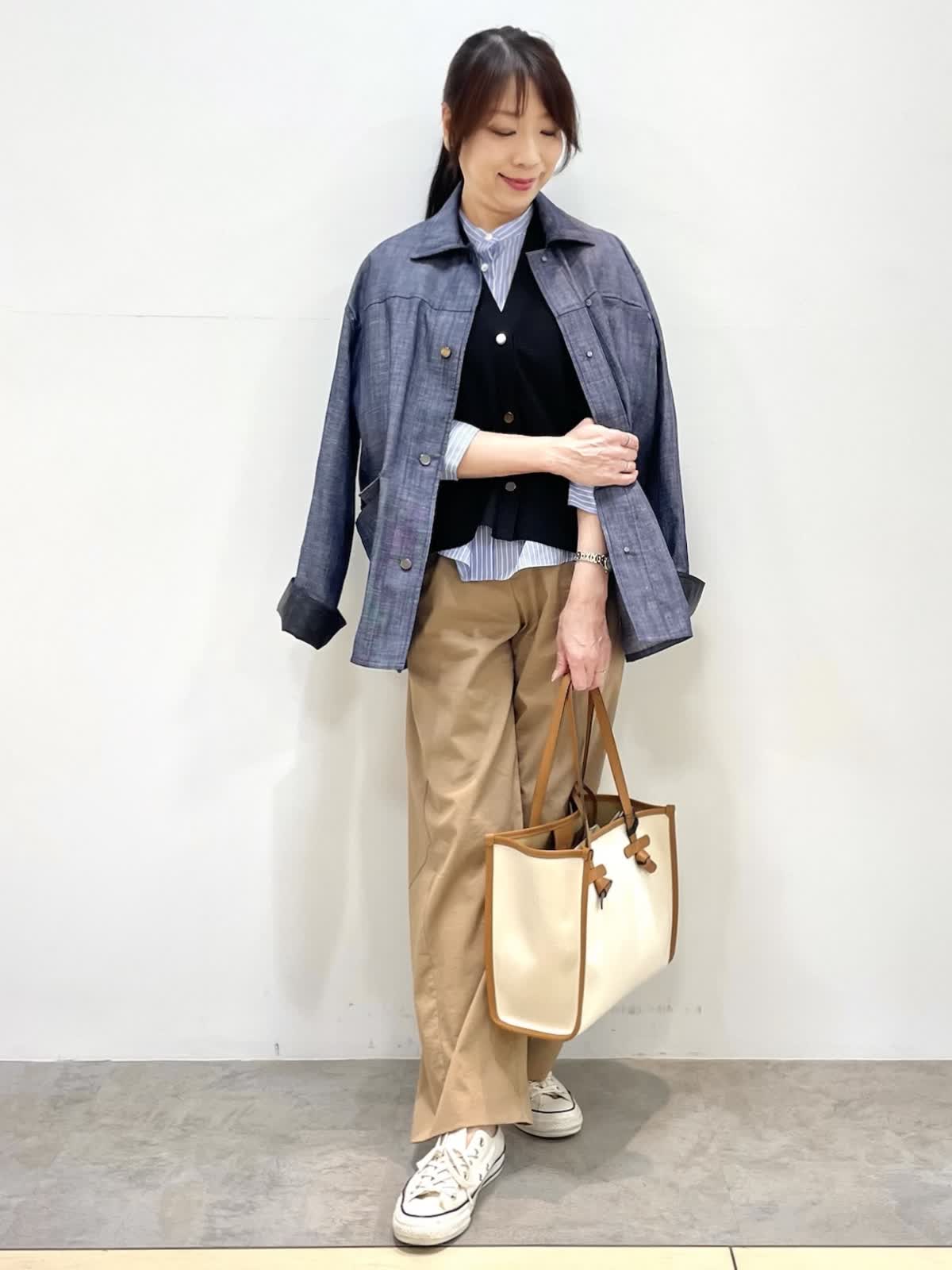【着用サイズ】全て9号 【着用カラー】ジャケット: ネイビー カーディガン:ブラック ブラウス:サックス パンツ:キャメル 休日のお出かけスタイル。オーバーサイズのジャケットはゆるっとした抜け感のあるシルエット。大きめのアウトポケットやメタルのドットボタンがポイントです。カーディガンは袖幅があるので二の腕のラインを拾わずすっきり着用いただけます。パンツはトレンドのバレルシレット。履くだけでおしゃれ見えするお勧めアイテムです。
