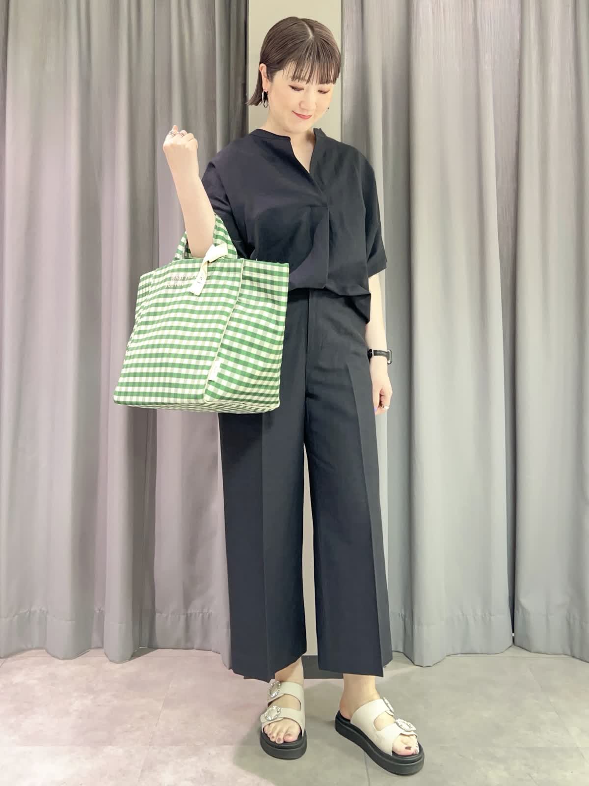 【着用サイズ/カラー】ブラウス:9号/ネイビー パンツ:11号/ネイビー タンクトップ:11号/ホワイト バッグ:キミドリ 『時短オシャレ&着回し抜群セットアップ』 [ブラウス]麻混のナチュラルなデザインブラウスです。オーバーサイズでボディラインを拾わず、涼しく着られます。二の腕カバーの袖丈も嬉しいです。スカートでもパンツでも相性の良いデザインです。 [パンツ]ブラウスと同素材のベーシックなワイドクロップドパンツです。ウエストの後ろがゴムで楽ちんです。セットで着ても単品でも着回し出来ます。 [タンクトップ]DAY by DAYの定番人気インナーです。とても柔らかく、伸縮性があります。 [バッグ]ポリエステル素材で汚れがとれやすい素材です。長い持ち手も付いているので型掛けも出来ます。コーディネートがシンプルな時に差し色になるアイテムです。