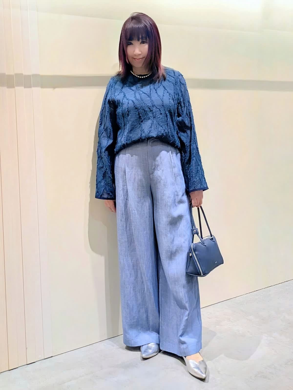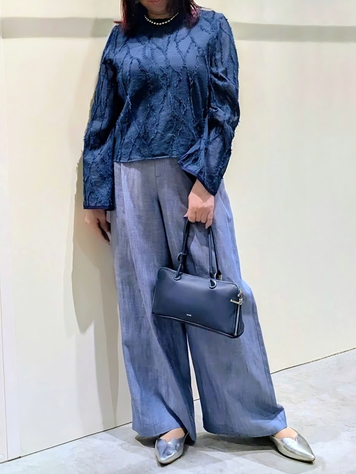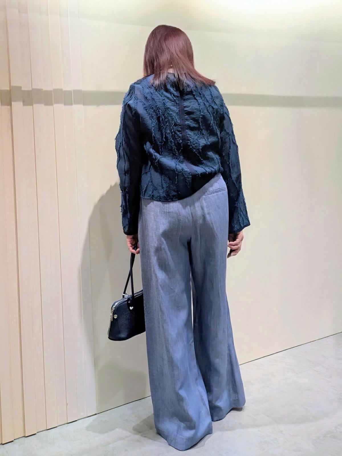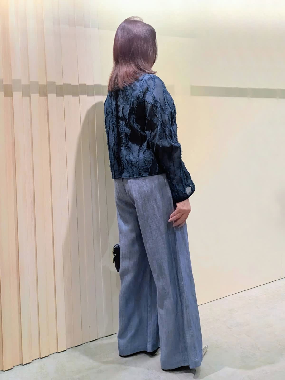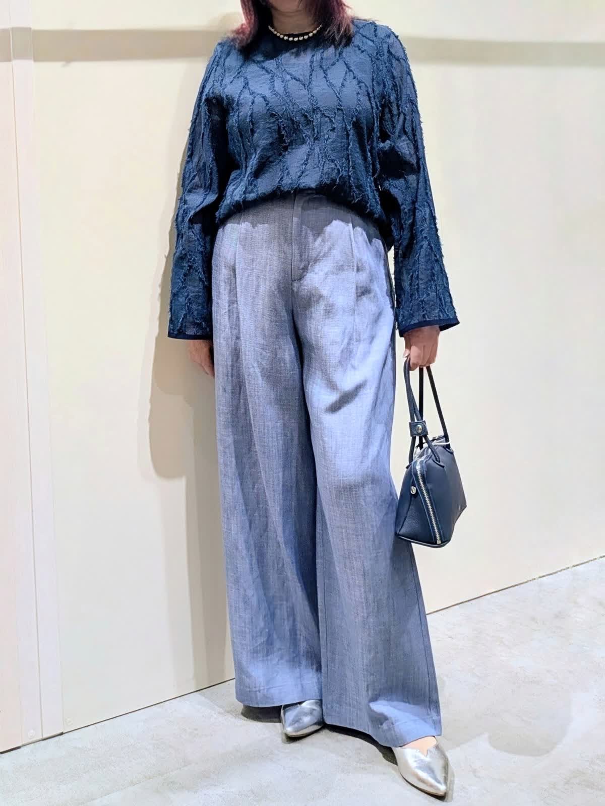 【着用サイズ】ブラウス、パンツ:9号【着用カラー】ブラウス:ブルー パンツ:サックス 春夏のキレイ目コーディネート 毛足のあるカットジャガードのブラウスは、表情豊かな凹凸が高級感を出してくれます。程良いシアー感があり、開放的な袖口がリラックス効果と、グログランテープがアクセントに… デニム風のワイドパンツは、フロントのタックやハイウエストで腰回りもスッキリ見えできれいなシルエットです。ウエスト後ろゴム仕様で、穿き心地も楽ちんです。