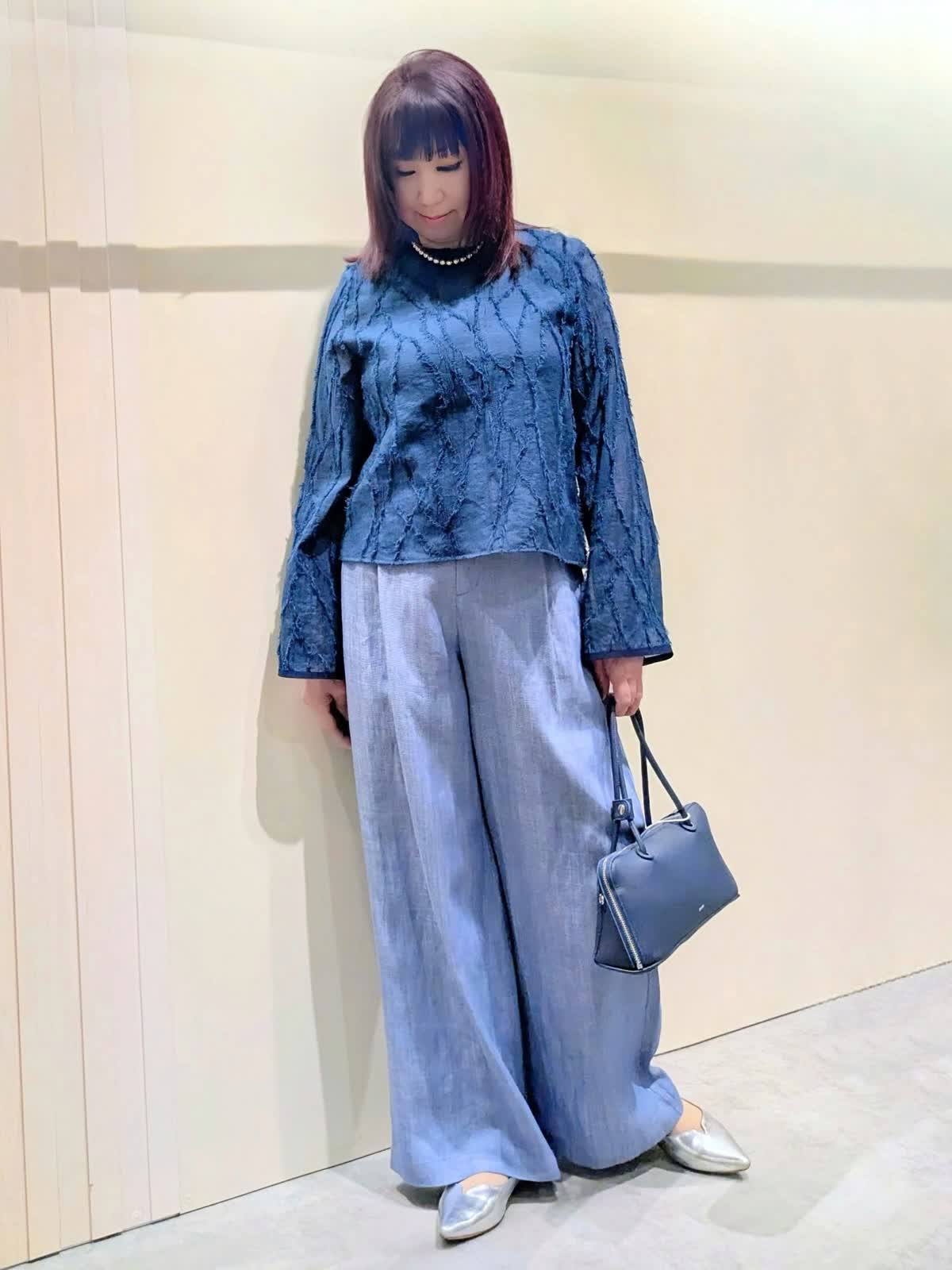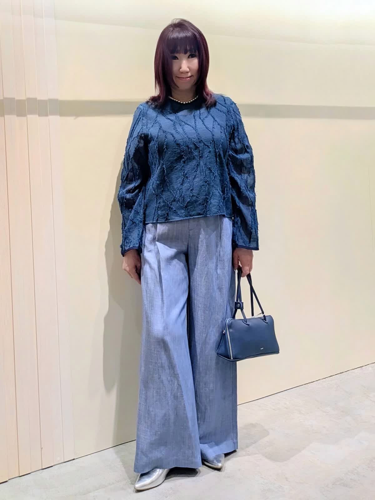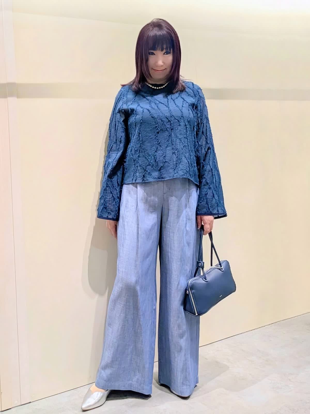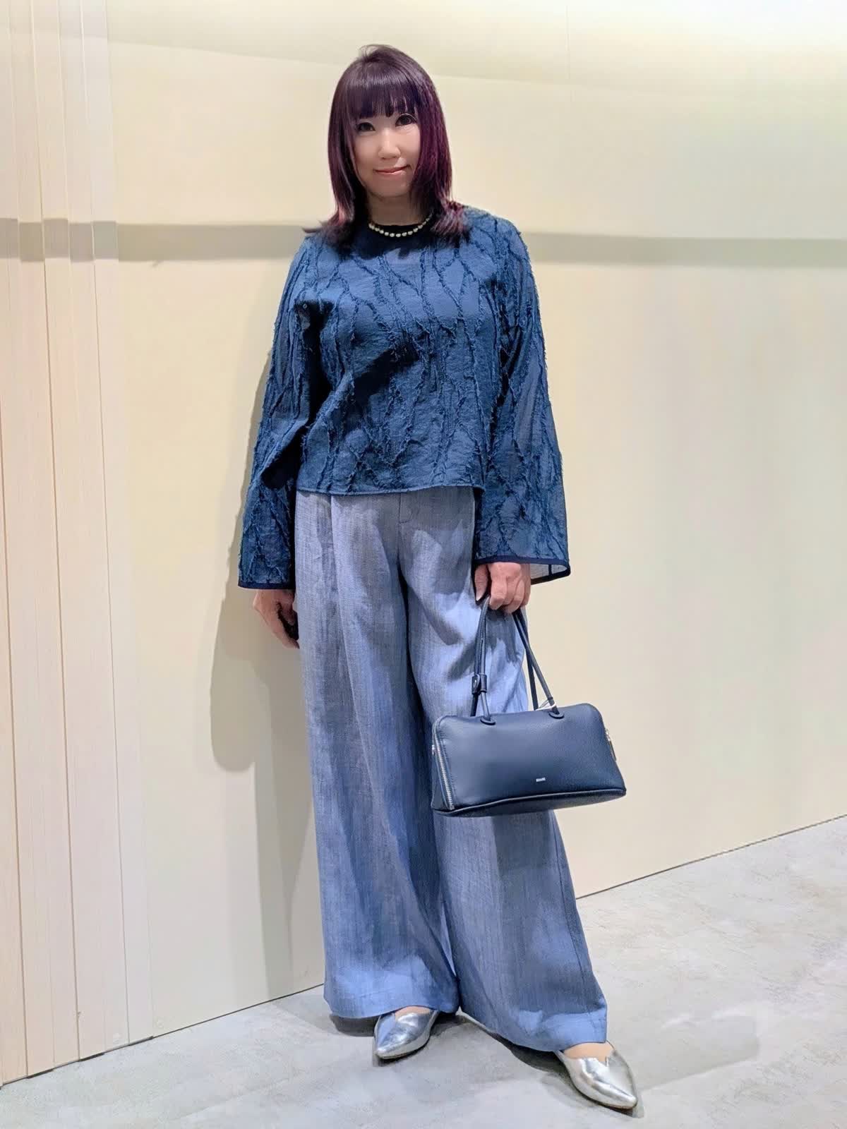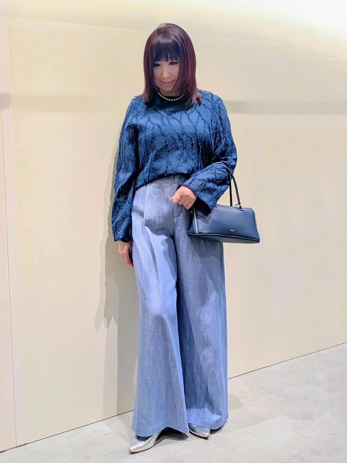 【着用サイズ】ブラウス、パンツ:9号【着用カラー】ブラウス:ブルー パンツ:サックス 春夏のキレイ目コーディネート 毛足のあるカットジャガードのブラウスは、表情豊かな凹凸が高級感を出してくれます。程良いシアー感があり、開放的な袖口がリラックス効果と、グログランテープがアクセントに… デニム風のワイドパンツは、フロントのタックやハイウエストで腰回りもスッキリ見えできれいなシルエットです。ウエスト後ろゴム仕様で、穿き心地も楽ちんです。