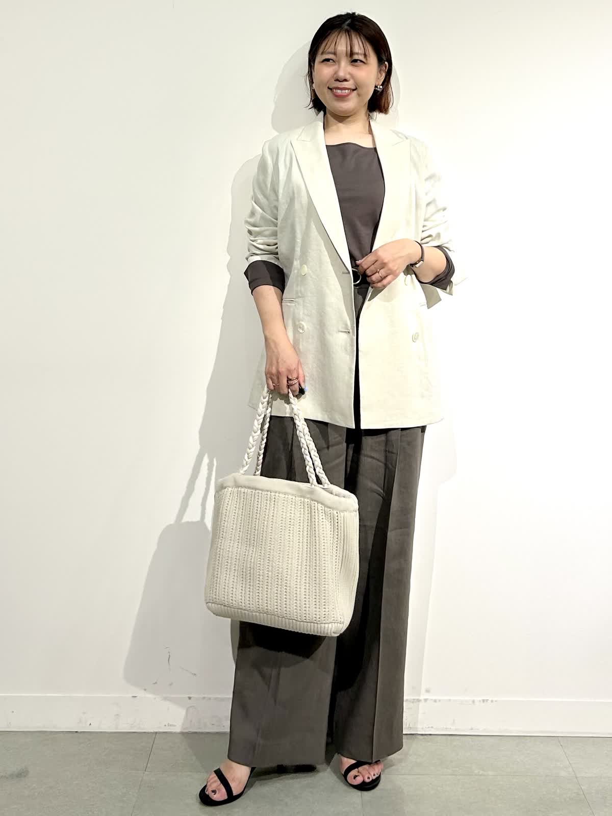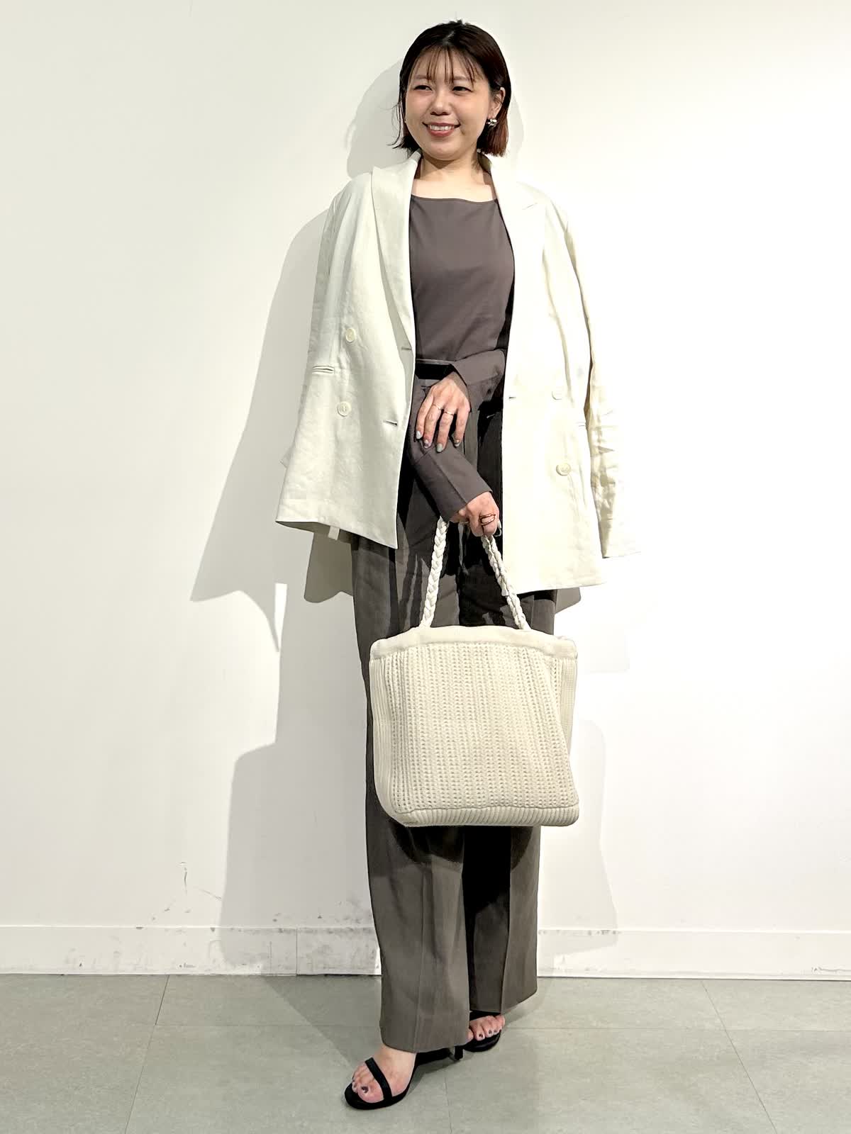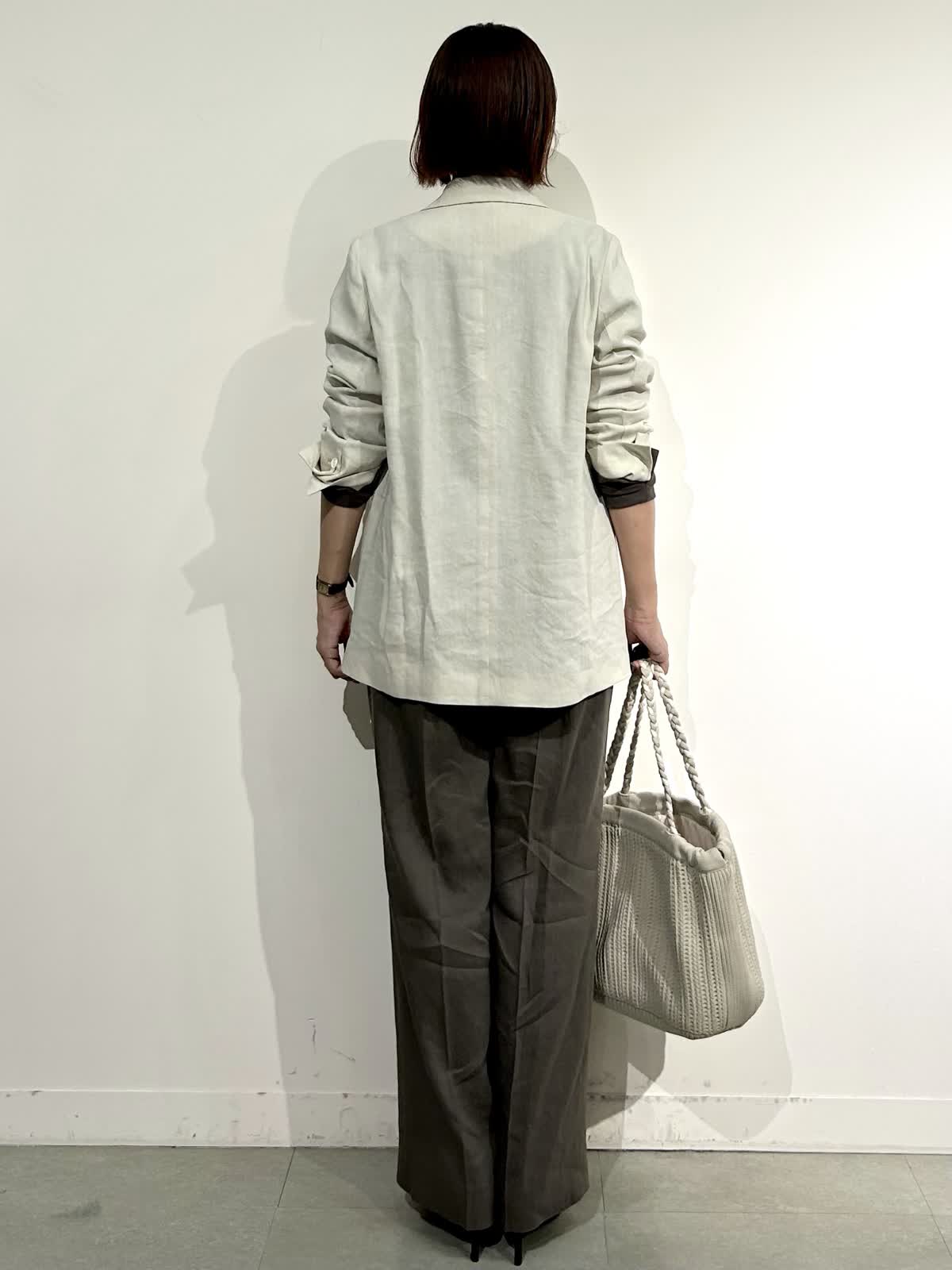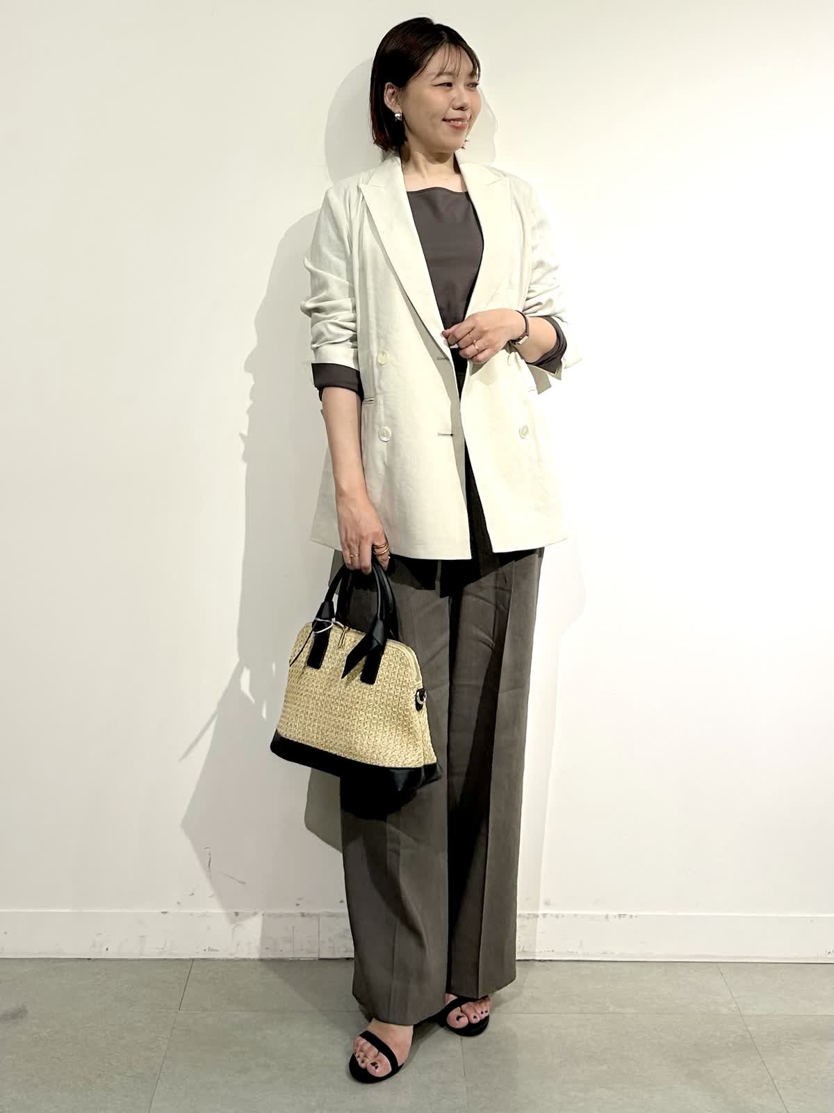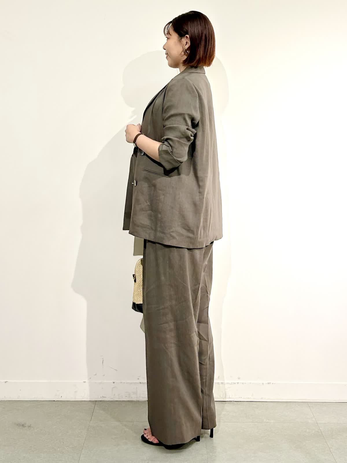 ?パンツのカラーと同じモカ茶のジャケット2種類とジレを合わせたワントーンのセットアップコーデもモード感があって素敵です。