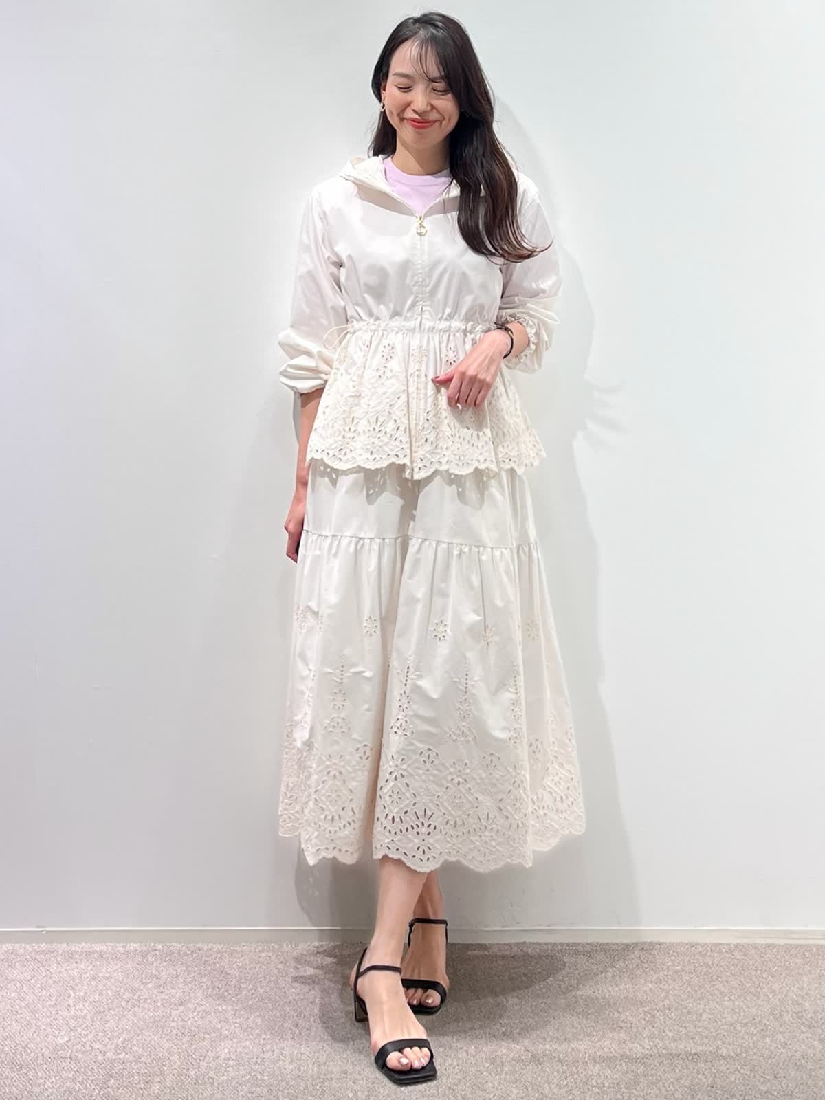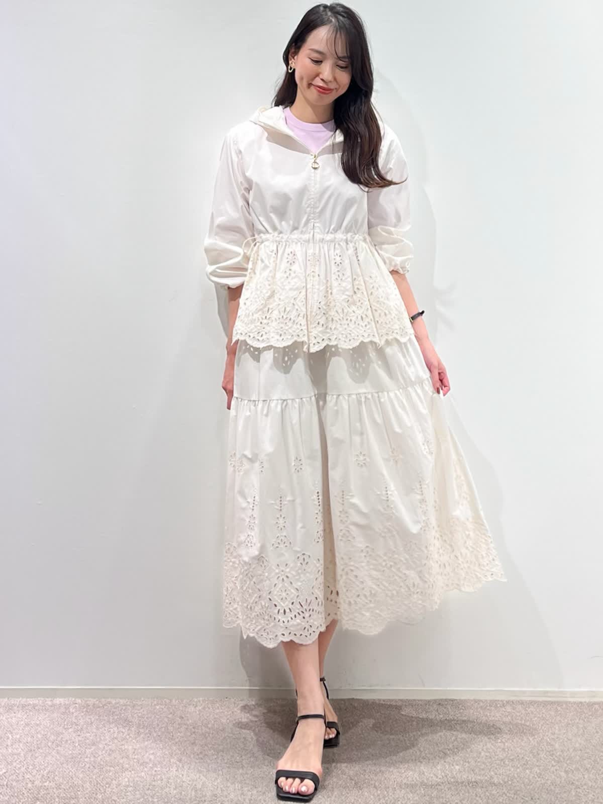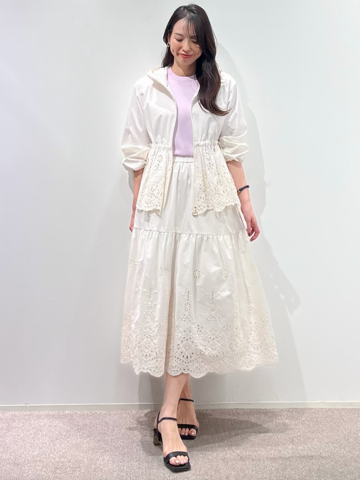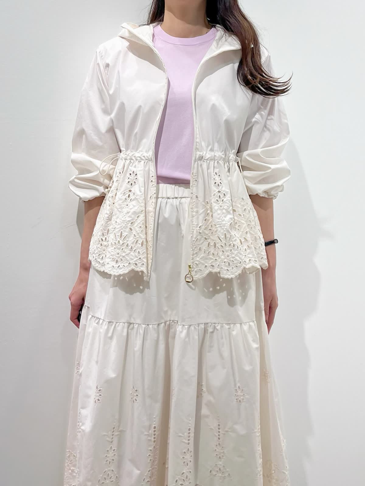 【着用サイズ】ブルゾン:9号 ニット:9号 スカート:9号 【着用カラー】ブルゾン:アイボリー ニット:ラベンダー スカート:アイボリー バッグ:グレー 「透明感&機能性抜群ラッシュガードセットアップコーデ」 お出かけスタイルに華やかさをアップしてくれる繊細なレース刺繍がポイントのラッシュガードブルゾン。機能性も抜群で、UVカット?撥水加工で暑い日差しや急な雨もガード出来ます。驚くほど軽い着心地で、夏の羽織りに万能アイテム。お揃いで、スカートも大人フェミニンなデザインでおすすめ。ウエストゴム仕様で楽な着心地と、スカラップ裾がポイントで、どんなトップスでも華やかに着こなせます。セットアップで着回しや、お出かけスタイルに万能な夏のお出かけにおすすめフェミニンコーデです。