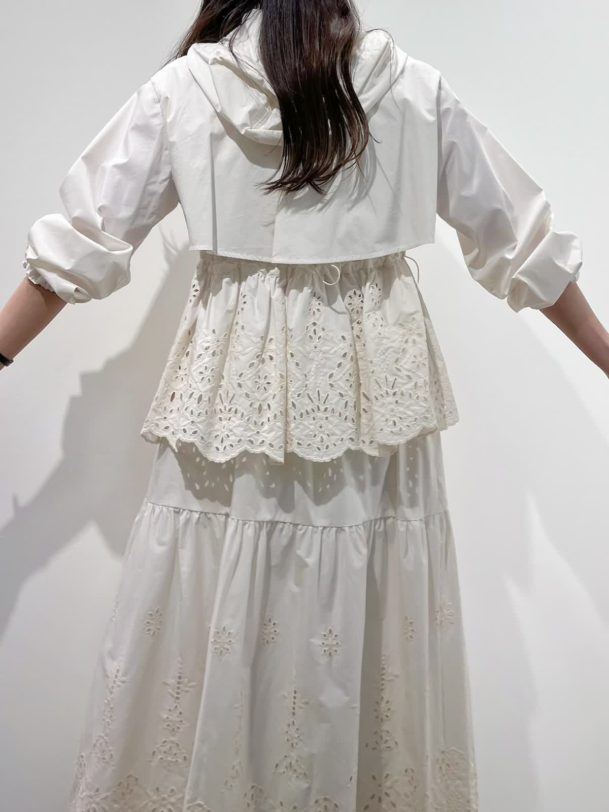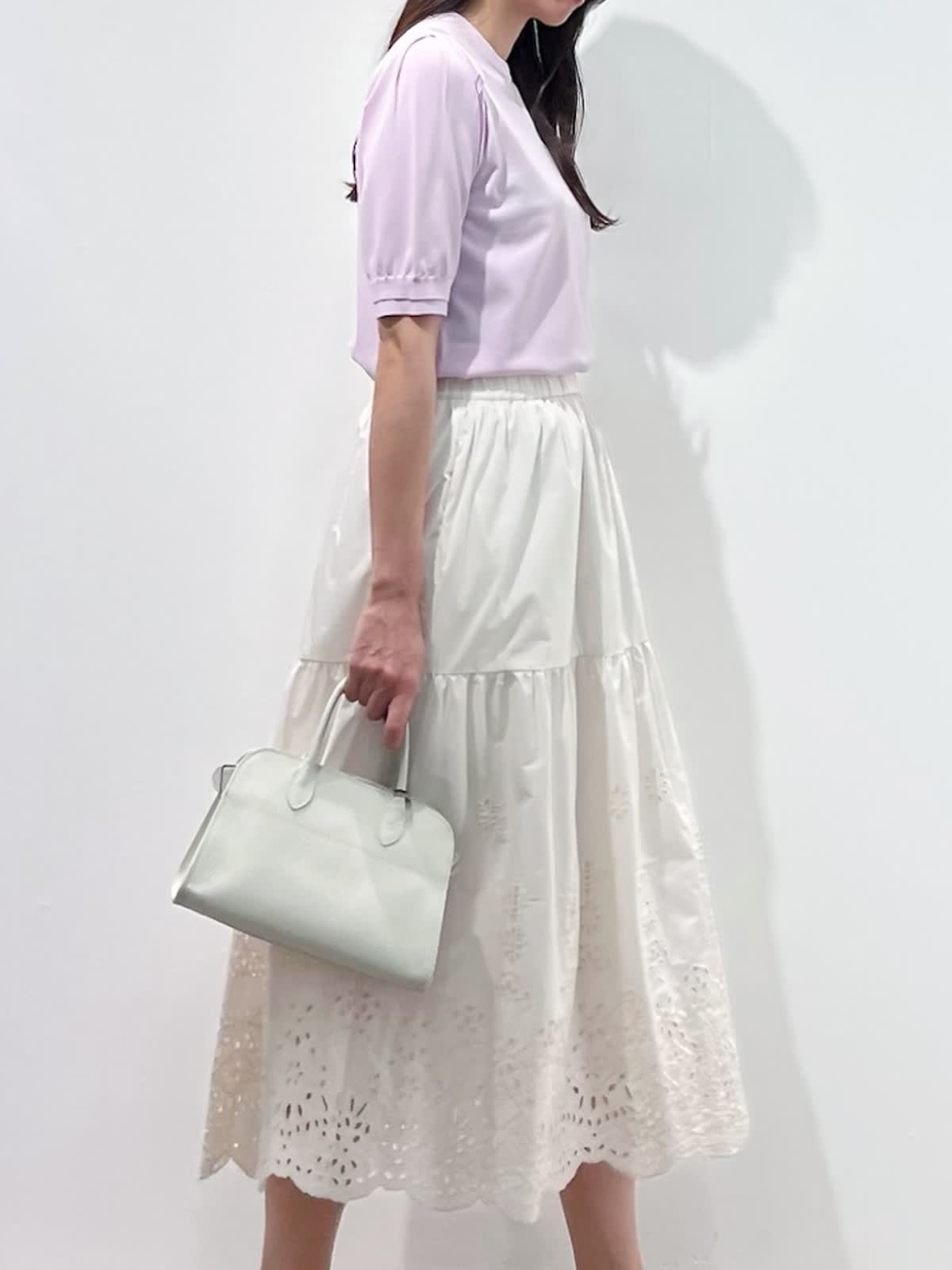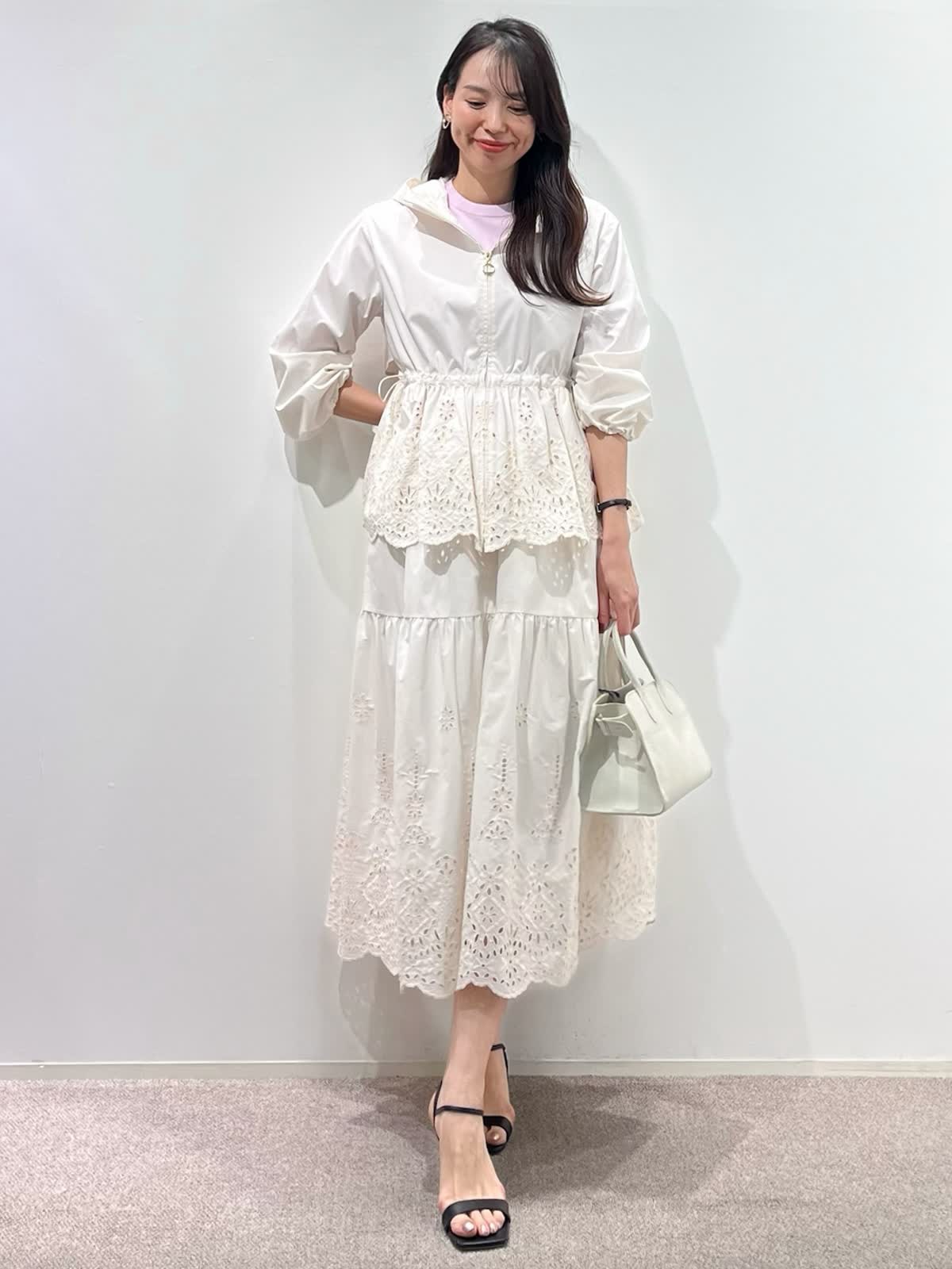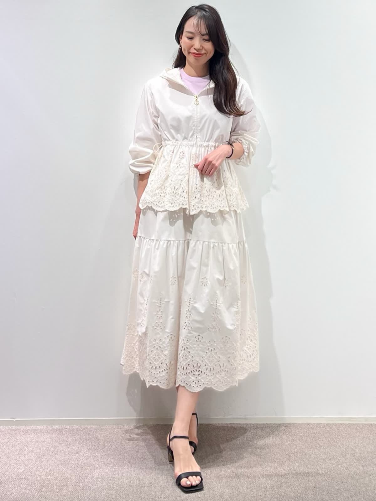 【着用サイズ】ブルゾン:9号 ニット:9号 スカート:9号 【着用カラー】ブルゾン:アイボリー ニット:ラベンダー スカート:アイボリー バッグ:グレー 「透明感&機能性抜群ラッシュガードセットアップコーデ」 お出かけスタイルに華やかさをアップしてくれる繊細なレース刺繍がポイントのラッシュガードブルゾン。機能性も抜群で、UVカット?撥水加工で暑い日差しや急な雨もガード出来ます。驚くほど軽い着心地で、夏の羽織りに万能アイテム。お揃いで、スカートも大人フェミニンなデザインでおすすめ。ウエストゴム仕様で楽な着心地と、スカラップ裾がポイントで、どんなトップスでも華やかに着こなせます。セットアップで着回しや、お出かけスタイルに万能な夏のお出かけにおすすめフェミニンコーデです。