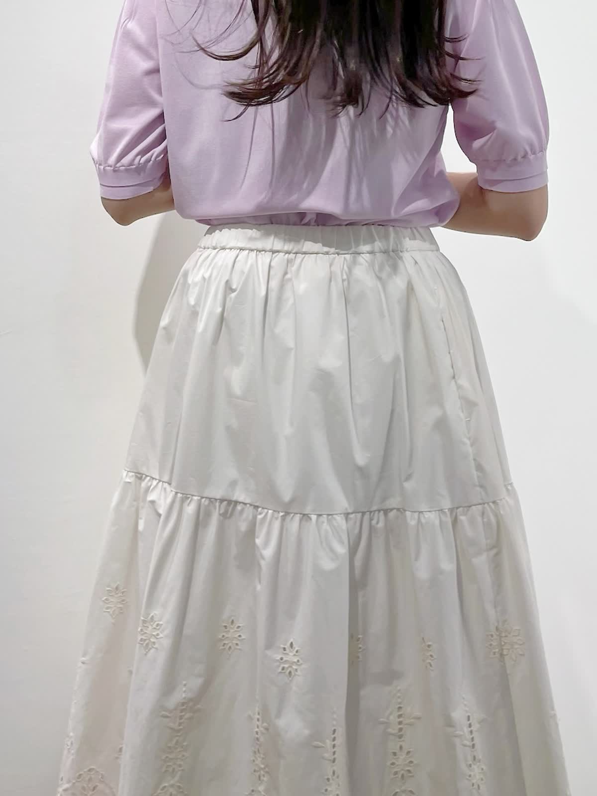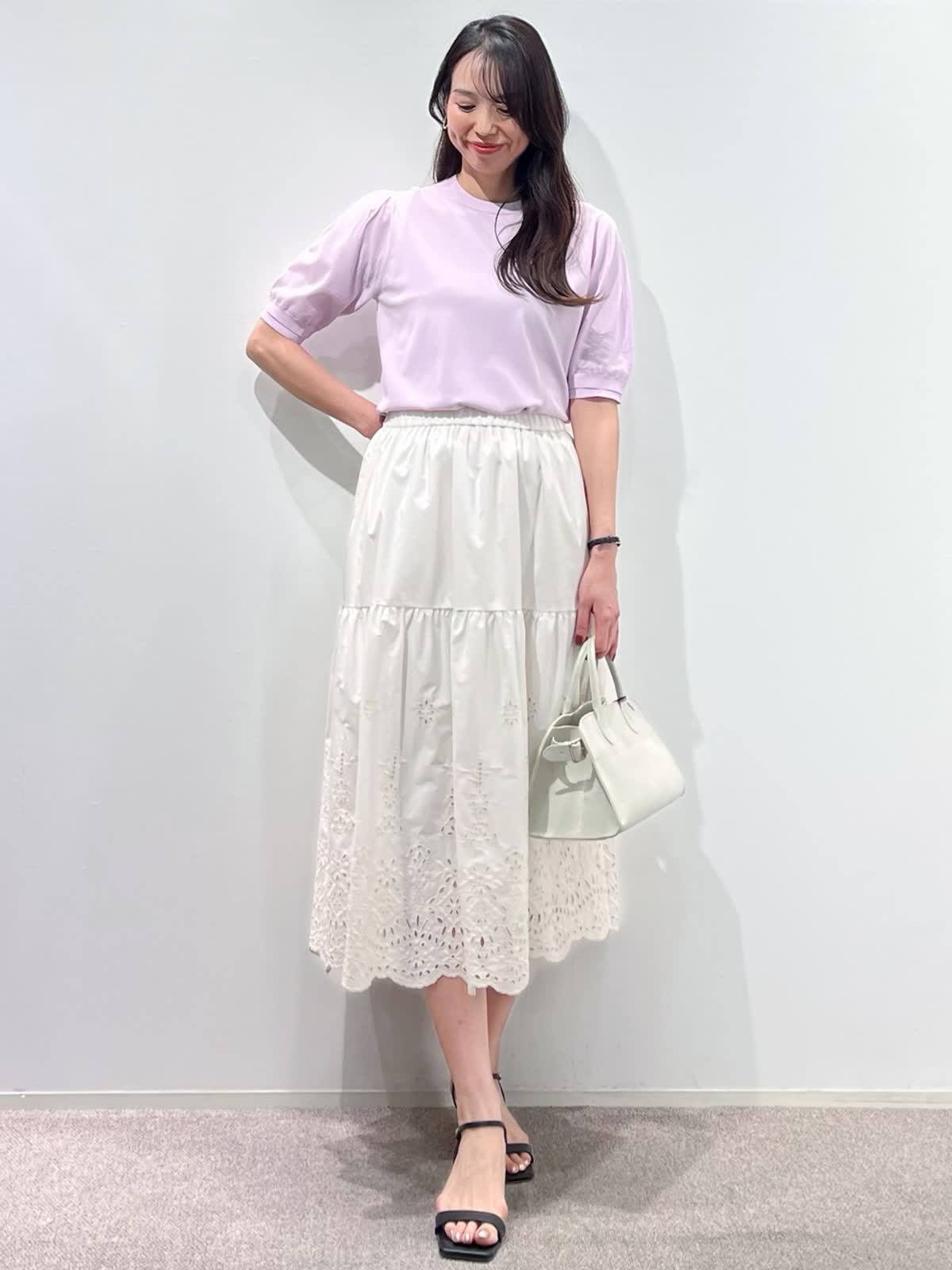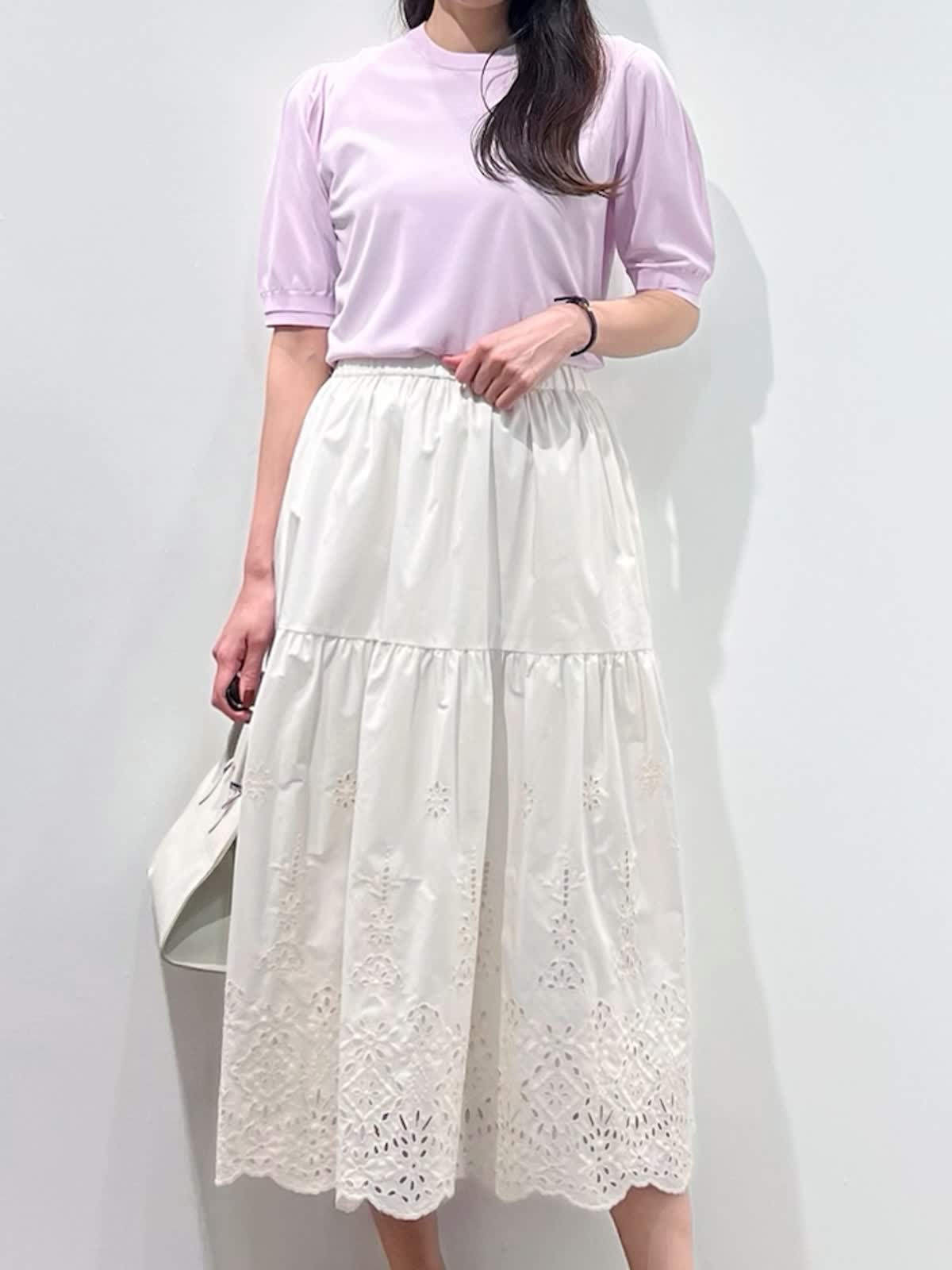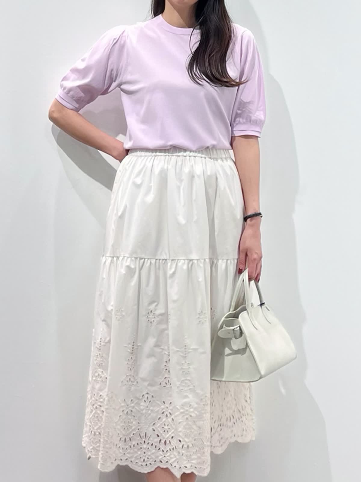 【着用サイズ】ブルゾン:9号 ニット:9号 スカート:9号 【着用カラー】ブルゾン:アイボリー ニット:ラベンダー スカート:アイボリー バッグ:グレー 「透明感&機能性抜群ラッシュガードセットアップコーデ」 お出かけスタイルに華やかさをアップしてくれる繊細なレース刺繍がポイントのラッシュガードブルゾン。機能性も抜群で、UVカット?撥水加工で暑い日差しや急な雨もガード出来ます。驚くほど軽い着心地で、夏の羽織りに万能アイテム。お揃いで、スカートも大人フェミニンなデザインでおすすめ。ウエストゴム仕様で楽な着心地と、スカラップ裾がポイントで、どんなトップスでも華やかに着こなせます。セットアップで着回しや、お出かけスタイルに万能な夏のお出かけにおすすめフェミニンコーデです。