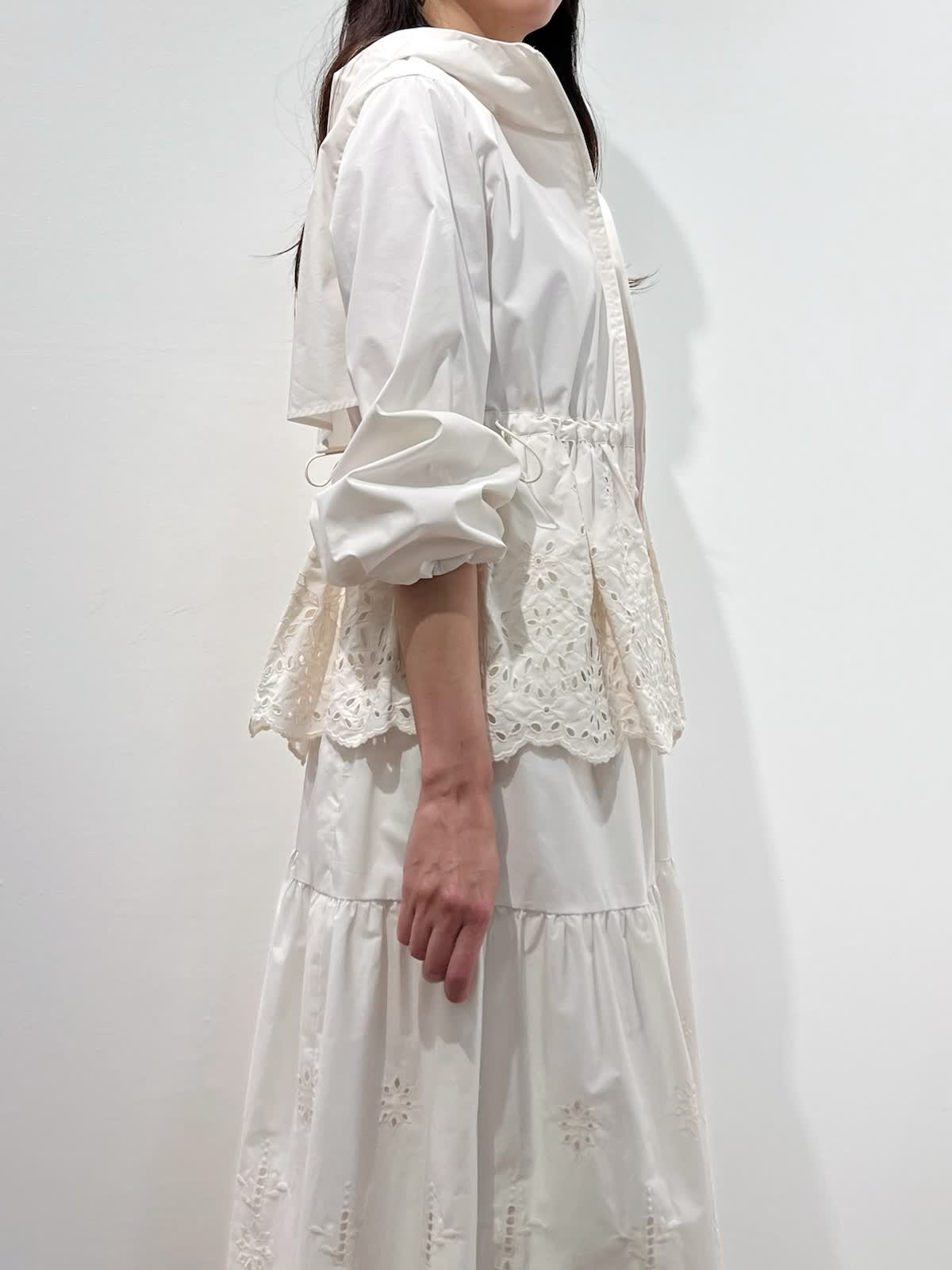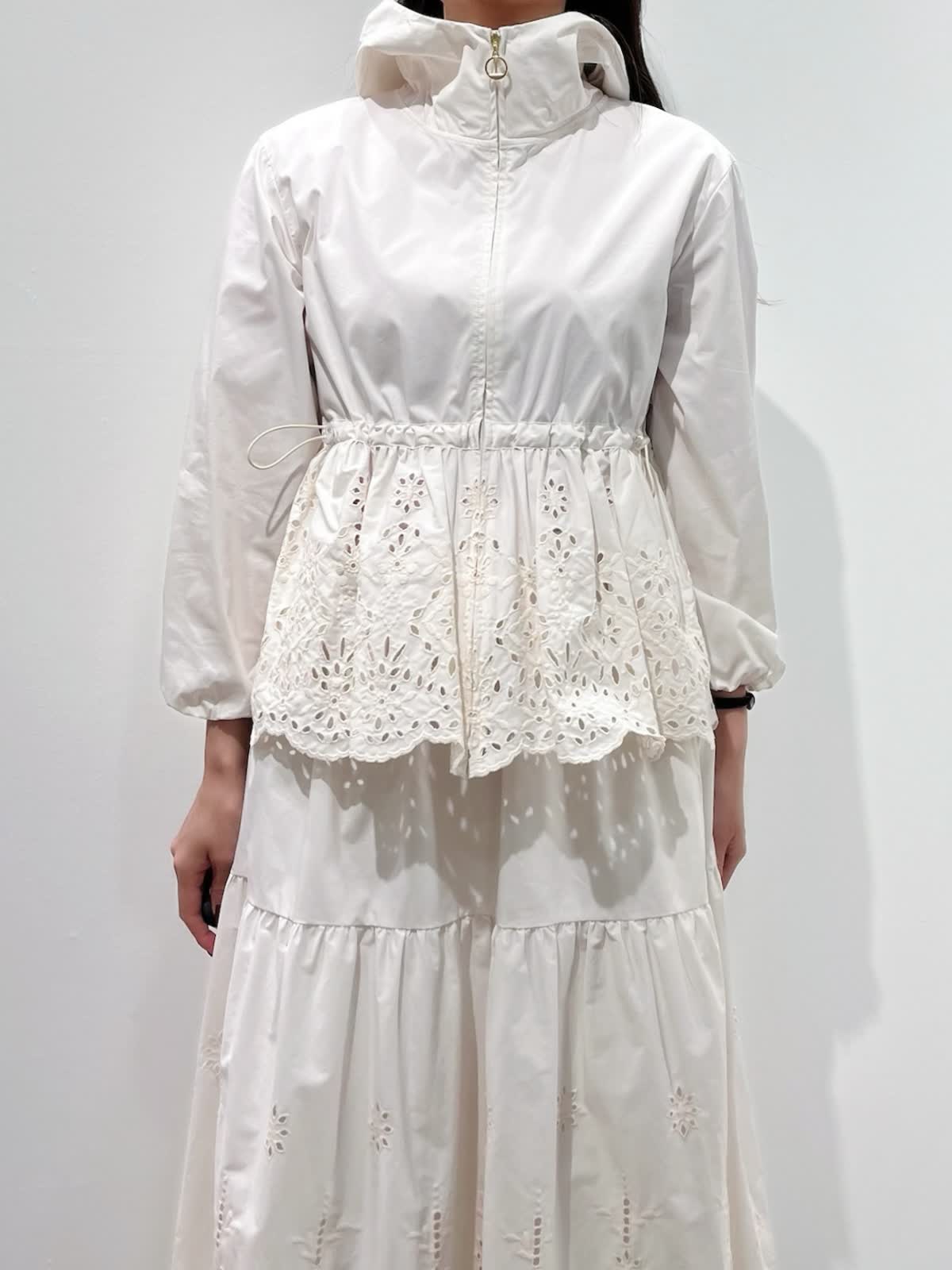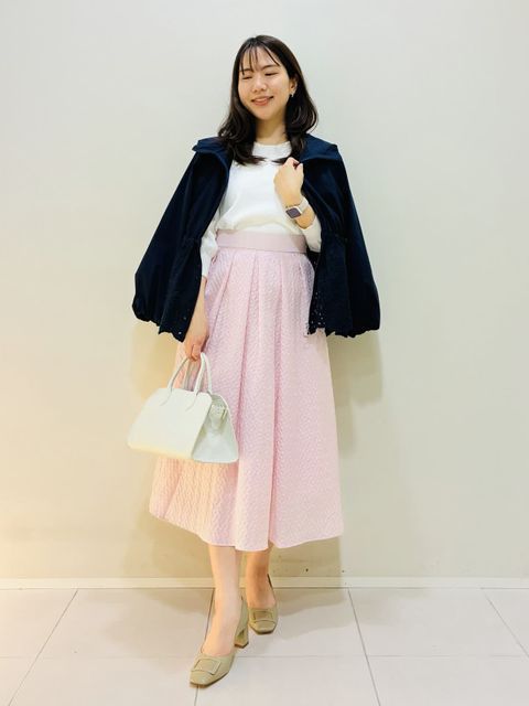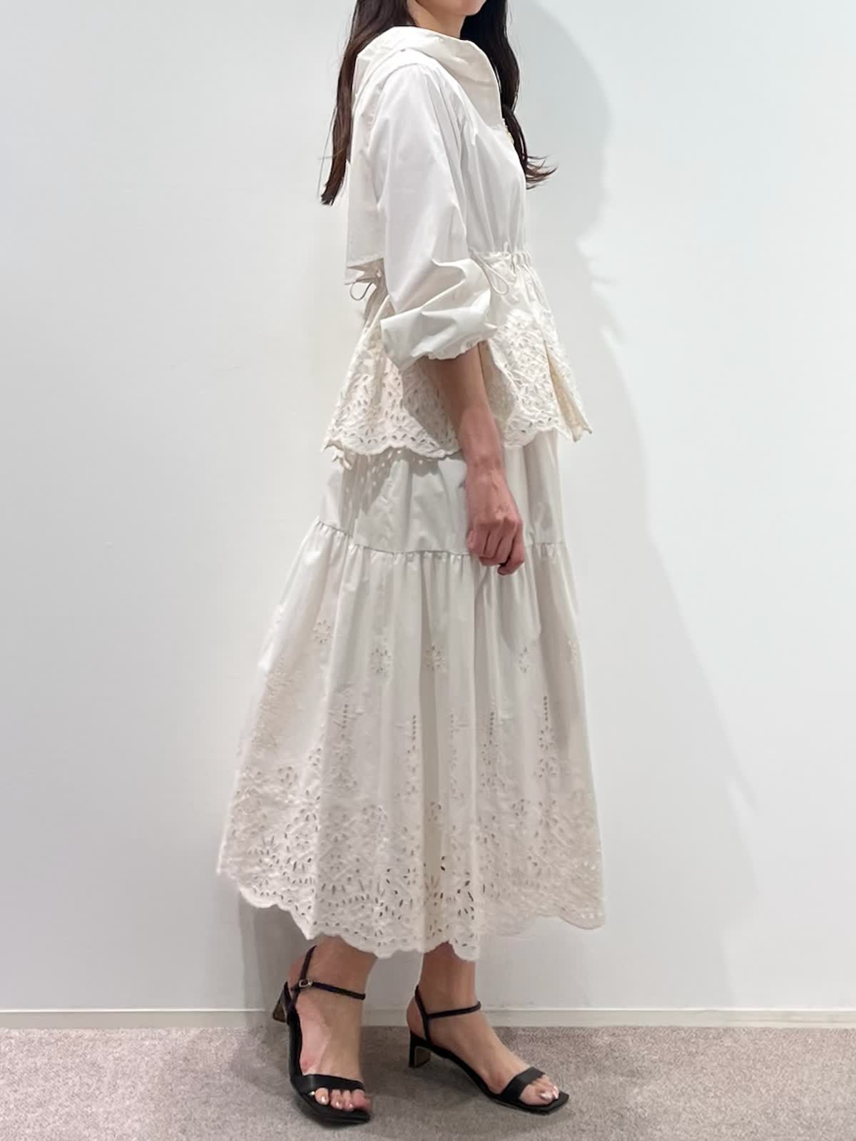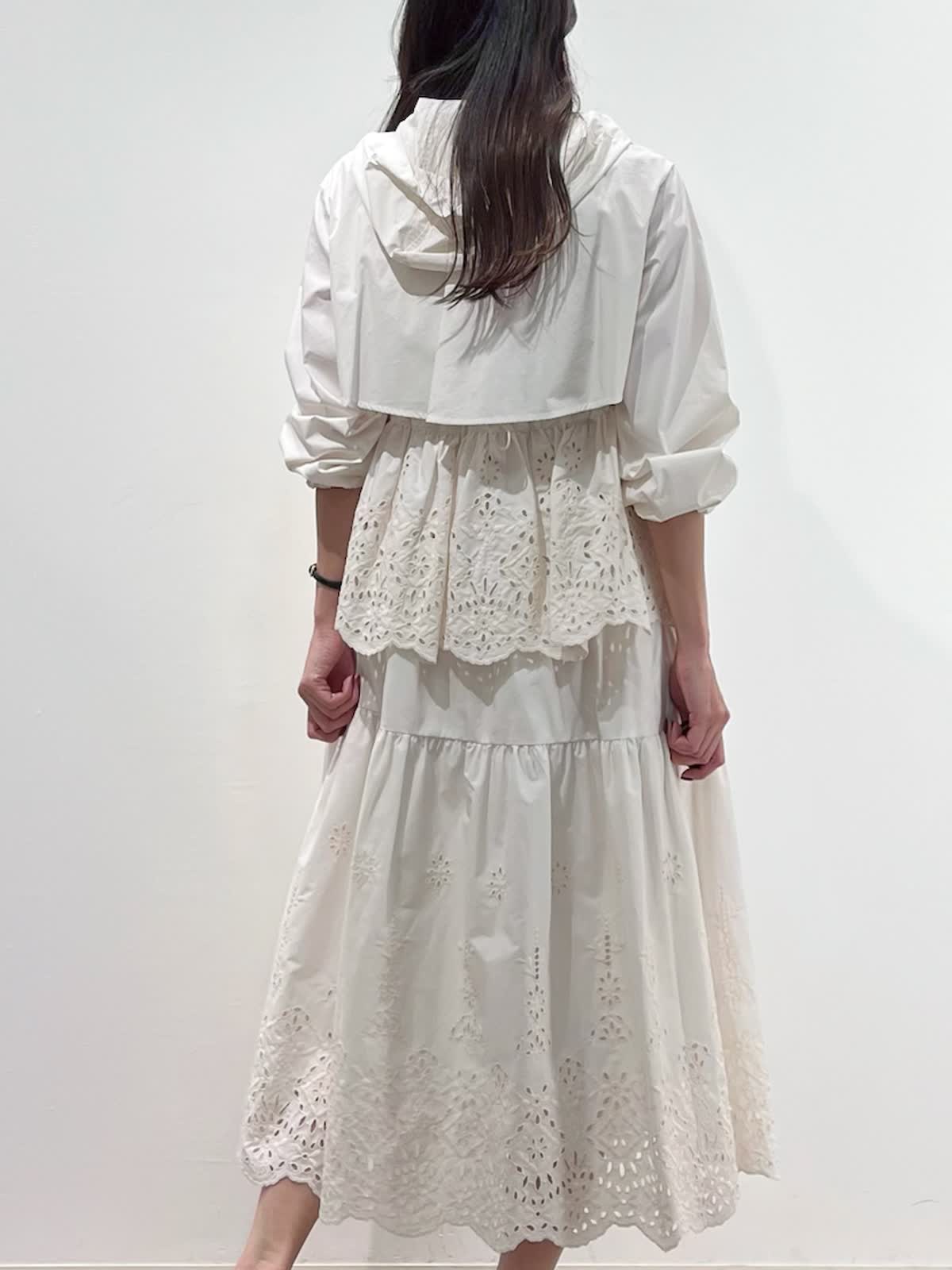 【着用サイズ】ブルゾン:9号 ニット:9号 スカート:9号 【着用カラー】ブルゾン:アイボリー ニット:ラベンダー スカート:アイボリー バッグ:グレー 「透明感&機能性抜群ラッシュガードセットアップコーデ」 お出かけスタイルに華やかさをアップしてくれる繊細なレース刺繍がポイントのラッシュガードブルゾン。機能性も抜群で、UVカット?撥水加工で暑い日差しや急な雨もガード出来ます。驚くほど軽い着心地で、夏の羽織りに万能アイテム。お揃いで、スカートも大人フェミニンなデザインでおすすめ。ウエストゴム仕様で楽な着心地と、スカラップ裾がポイントで、どんなトップスでも華やかに着こなせます。セットアップで着回しや、お出かけスタイルに万能な夏のお出かけにおすすめフェミニンコーデです。