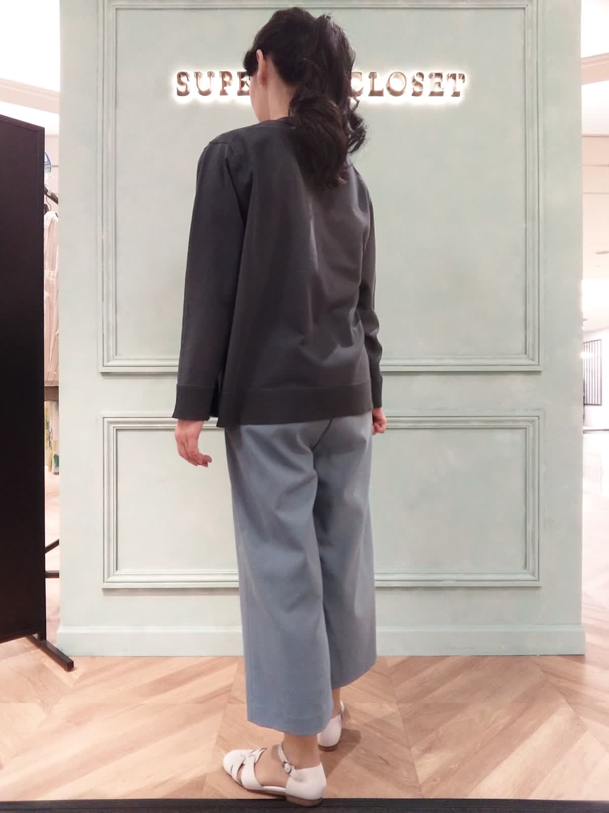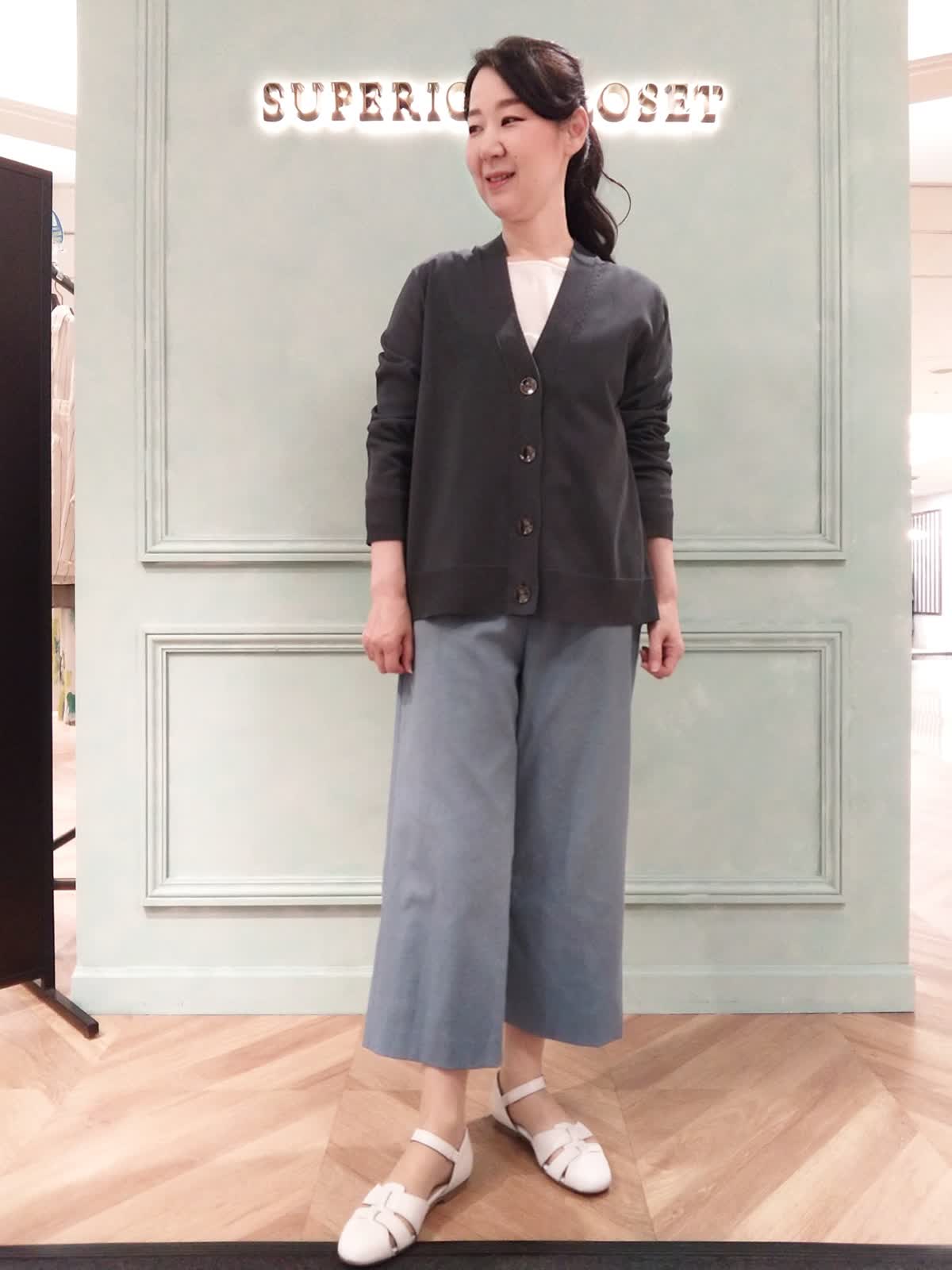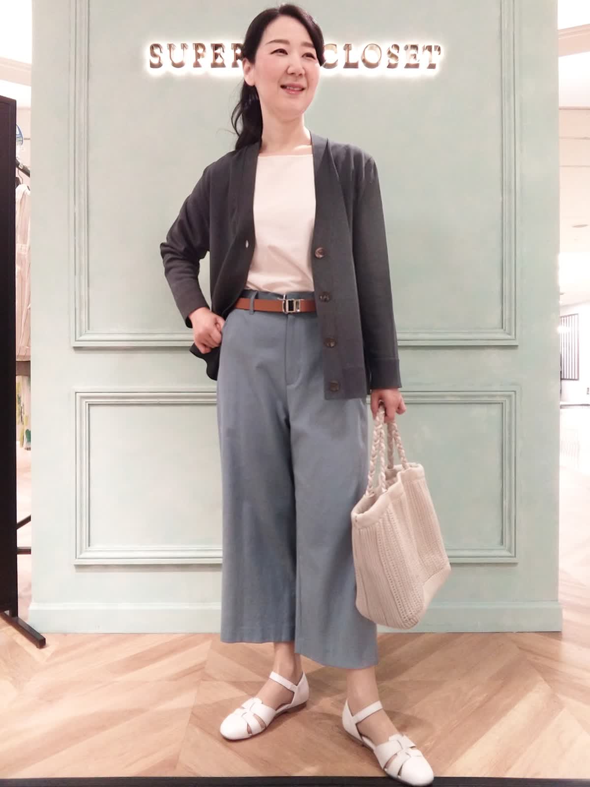 【着用サイズ】カーディガン:フリー、カットソー:9号、パンツ:9号 【着用カラー】カーディガン:スミクロ、カットソー:オフホワイト、パンツ:ブルー さらっとした着心地、クロップトパンツで楽チンおでかけコーディネート。 さらっとシャリ感のあるVネックカーディガンとぺたんこ靴が良く合うクロップト丈のワイドパンツでシンプルにコーディネート。グレーイッシュなブルーはカラーを取り入れやすくオシャレを楽しめます。カットソーは袖口スリットがあり、折り返して使えます。