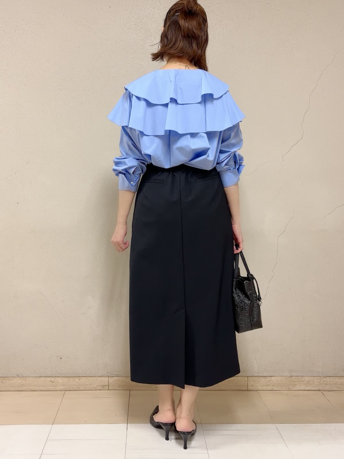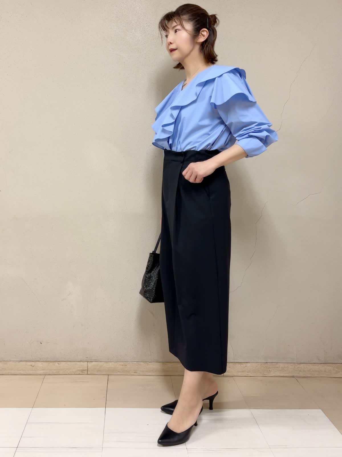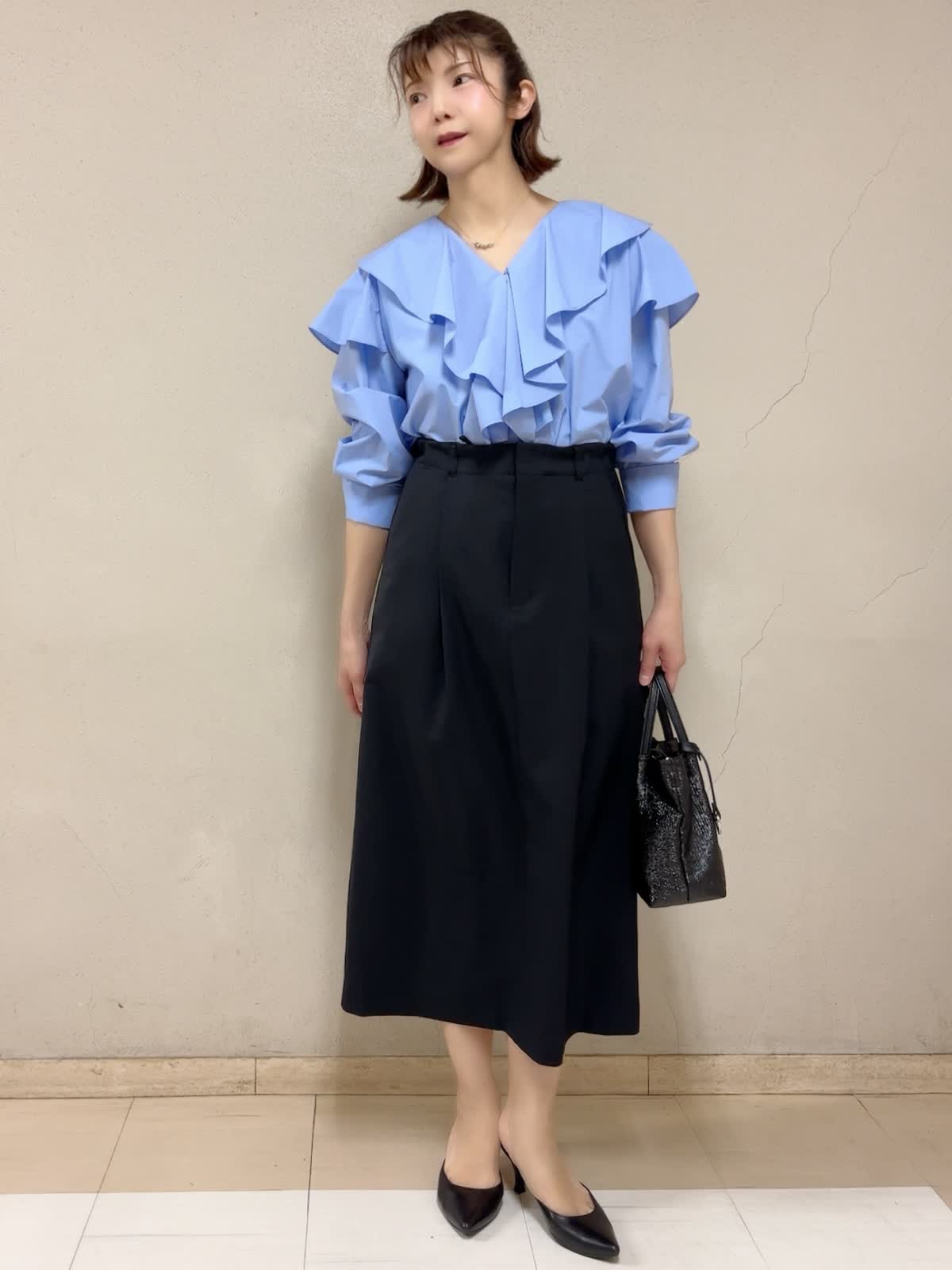 【着用サイズ】ブラウス:フリー スカート:11号 【着用カラー】ブラウス:ブルー スカート:ブラック お食事会コーデ 顔周りにフリルがヒラリと華やかに。でもVネックの開きで甘くならず、大人っぽく。ボトムはブラックでシックに。