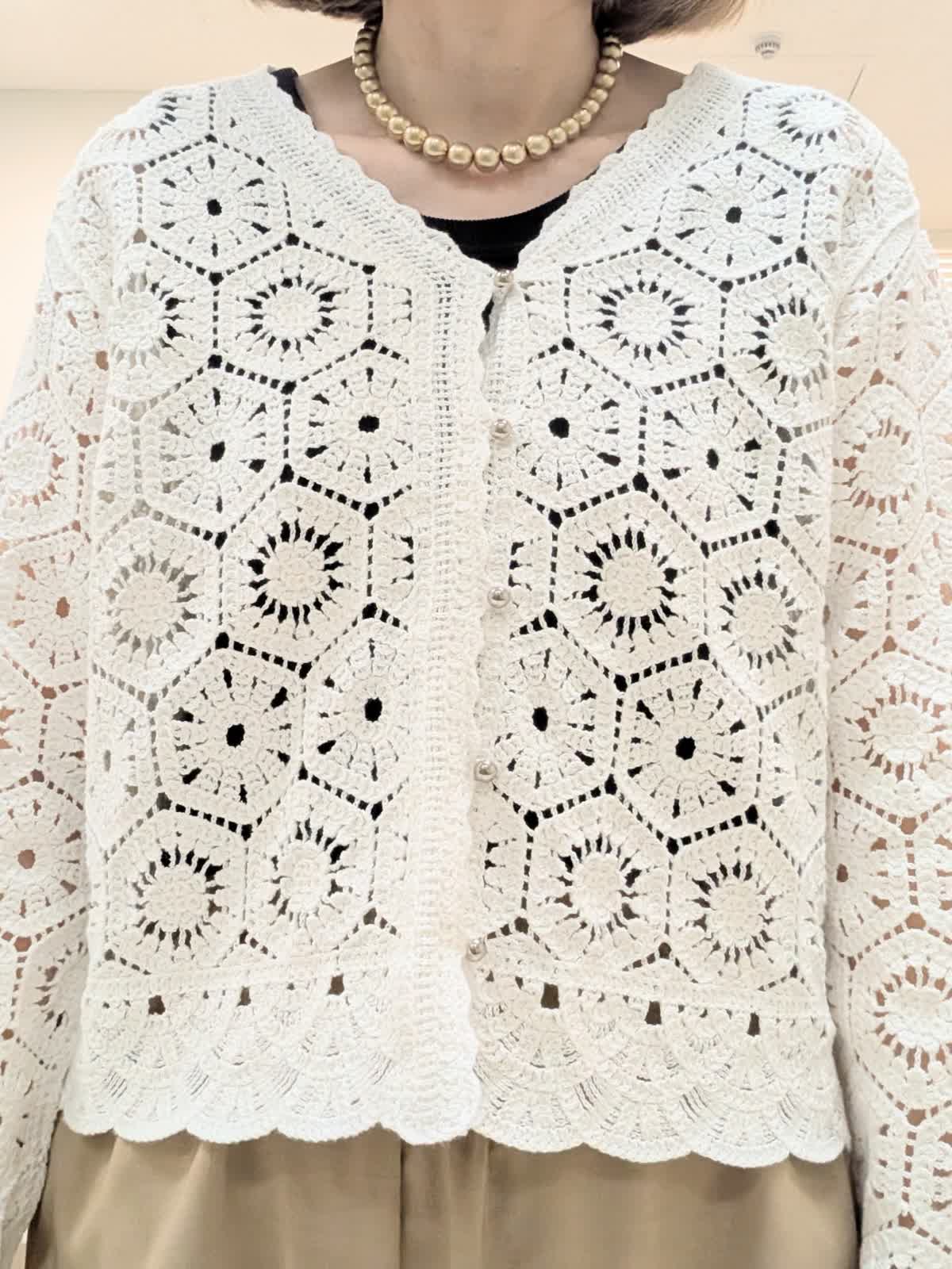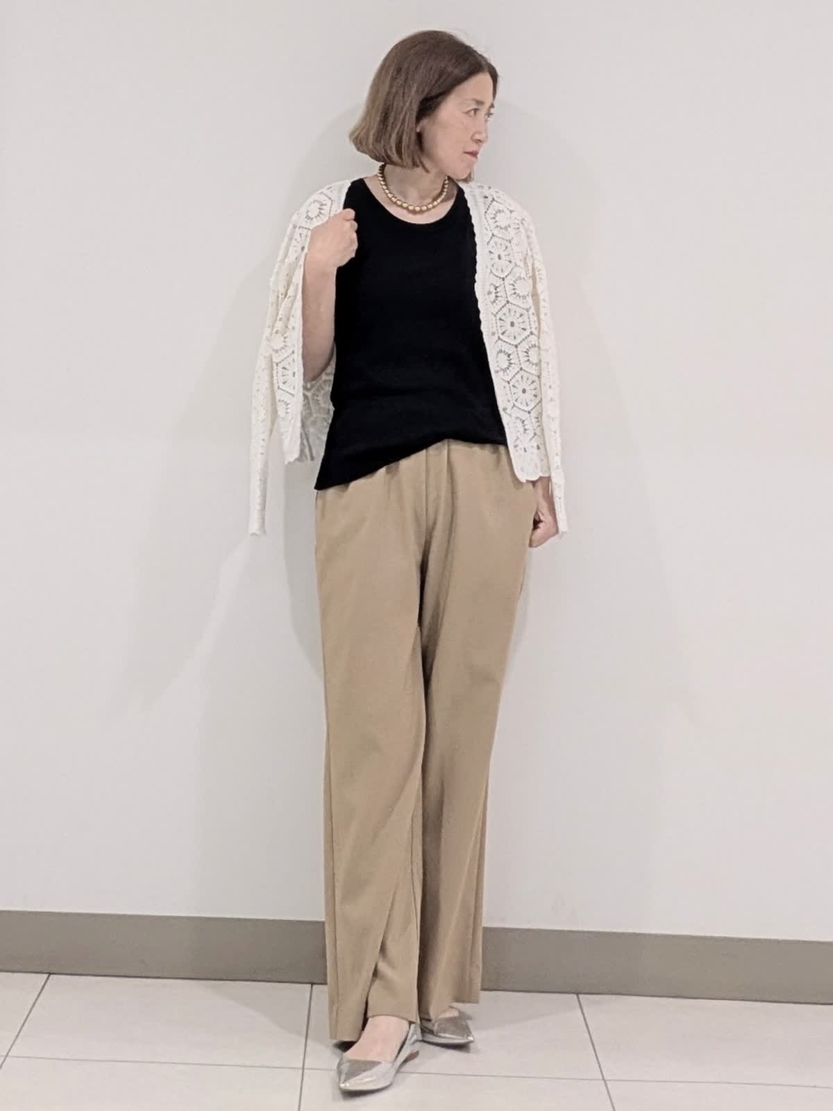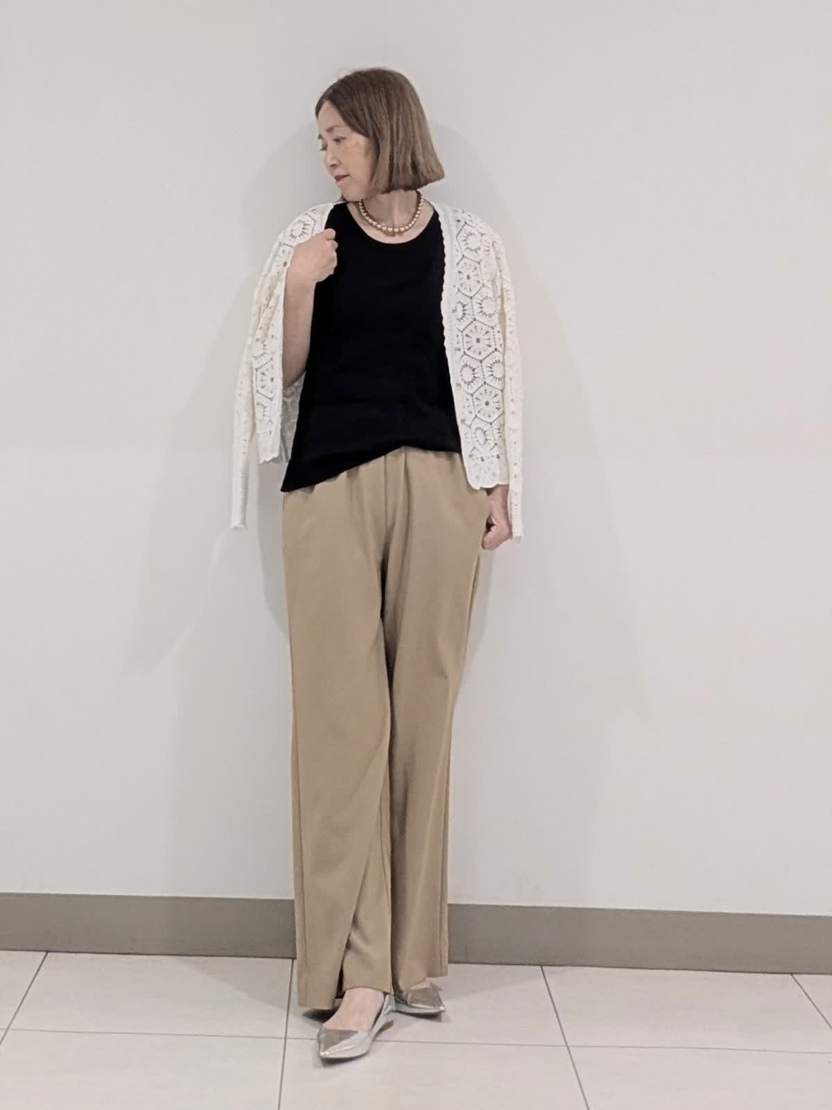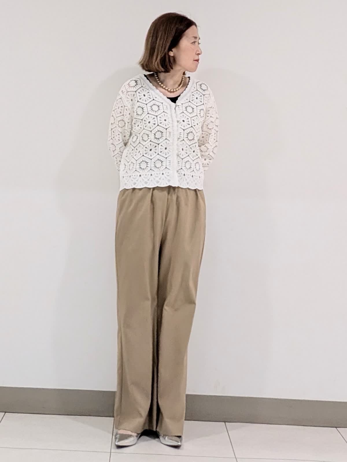 【着用サイズ9号】 コットン刺繍で表現したクロシェ編みのニットカーディガン。浅めのVネックにメタルボタンのアクセントあり。短めの着丈で、バランスが取りやすくワンピースの上から羽織るのもステキです。 合わせたパンツは、ゴム仕様のイージーパンツ。 ウエスト内側はドロストで調整可能。 膝上はすっきりと裾に向けて分量を持たせたスタイルアップに拘ったシルエット◎ インナーには、程よいフィット感で着心地バツグンなリブタンクトップを。