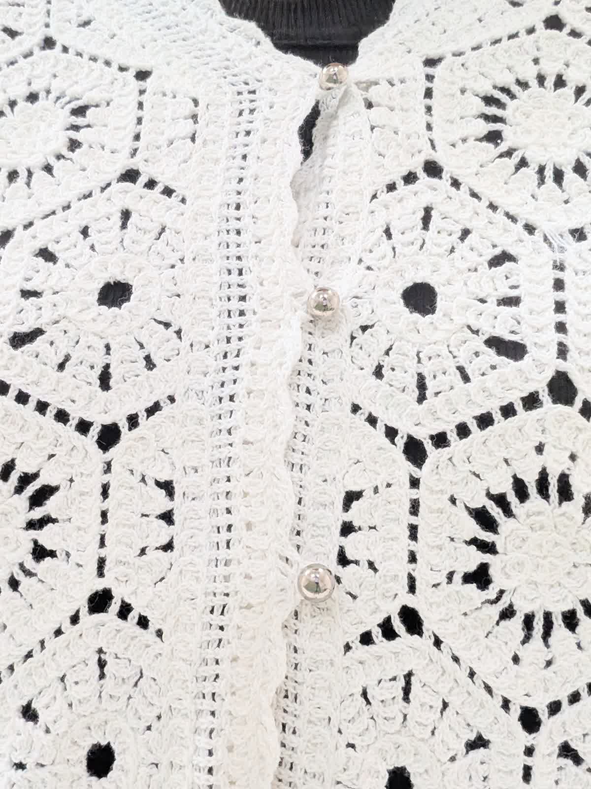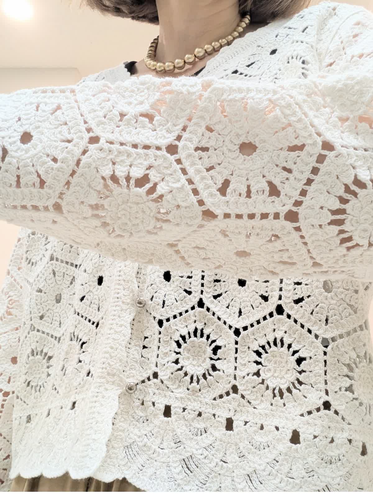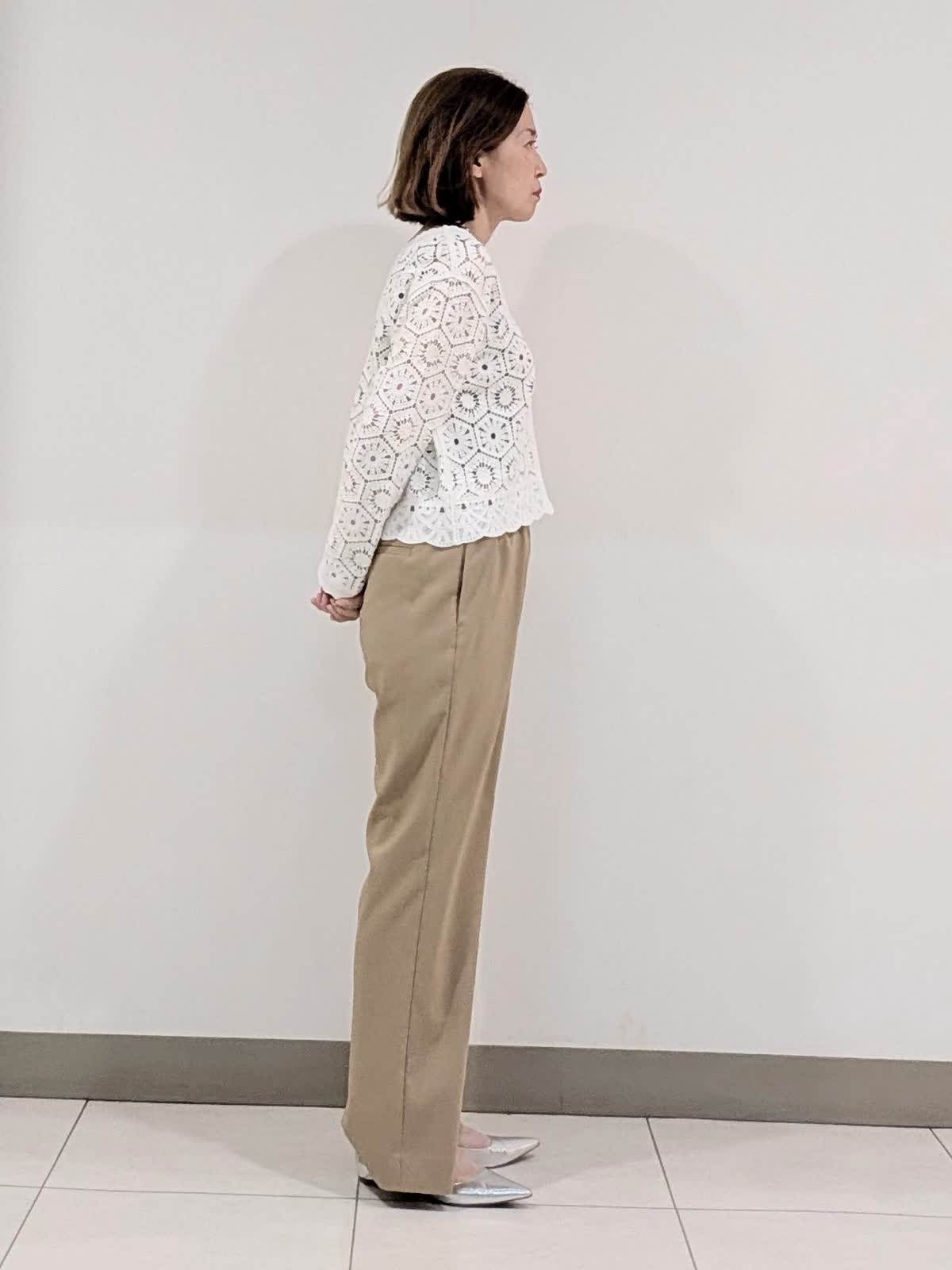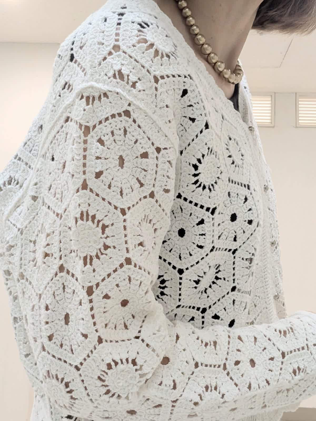 【着用サイズ9号】 コットン刺繍で表現したクロシェ編みのニットカーディガン。浅めのVネックにメタルボタンのアクセントあり。短めの着丈で、バランスが取りやすくワンピースの上から羽織るのもステキです。 合わせたパンツは、ゴム仕様のイージーパンツ。 ウエスト内側はドロストで調整可能。 膝上はすっきりと裾に向けて分量を持たせたスタイルアップに拘ったシルエット◎ インナーには、程よいフィット感で着心地バツグンなリブタンクトップを。