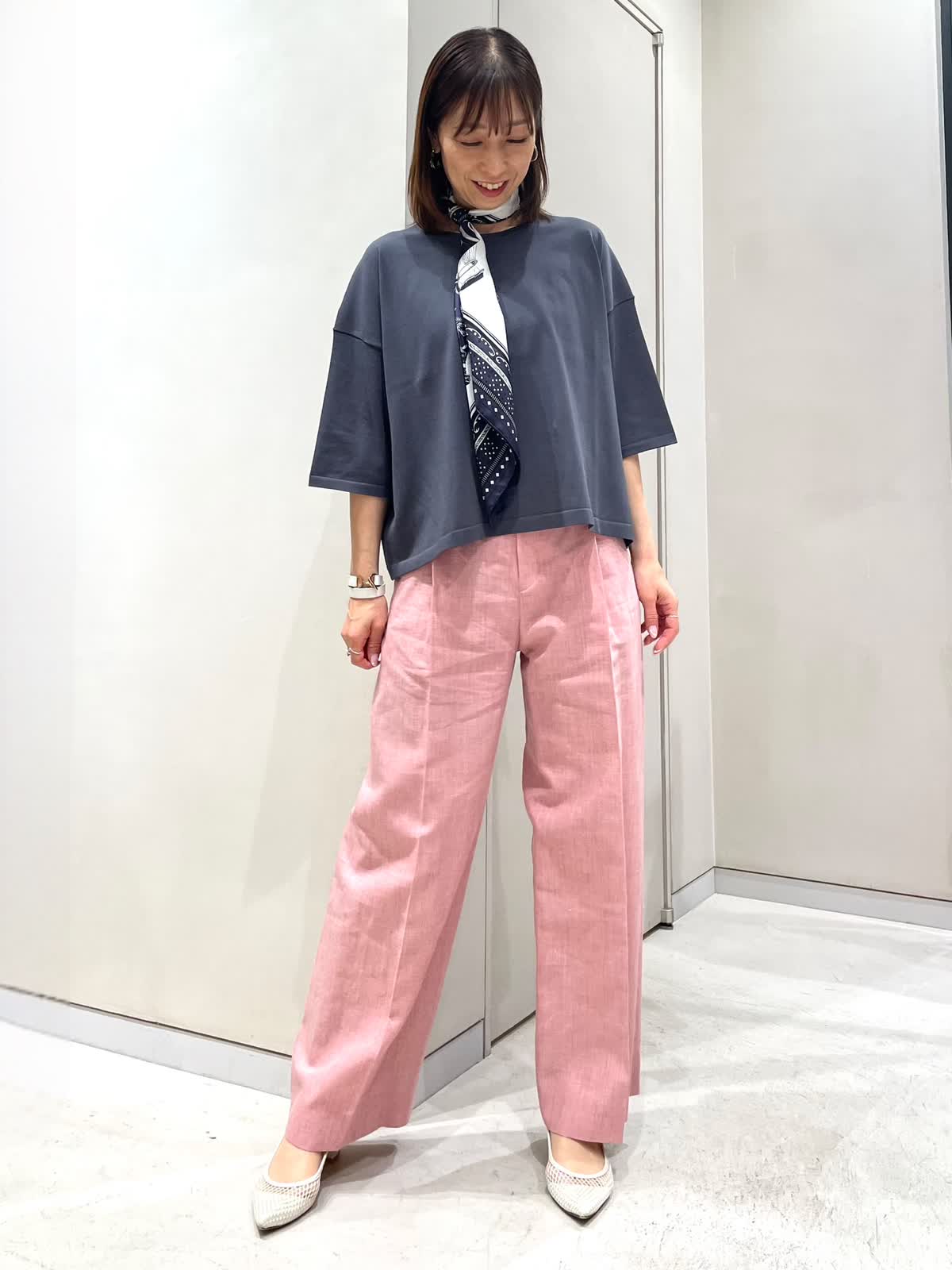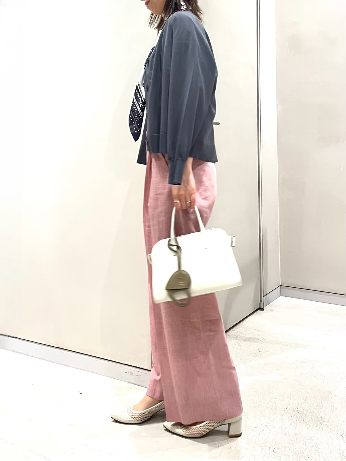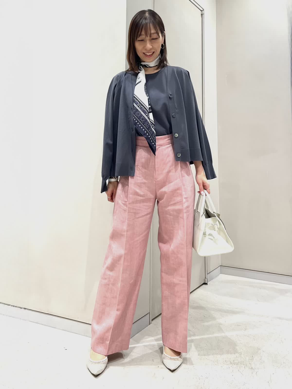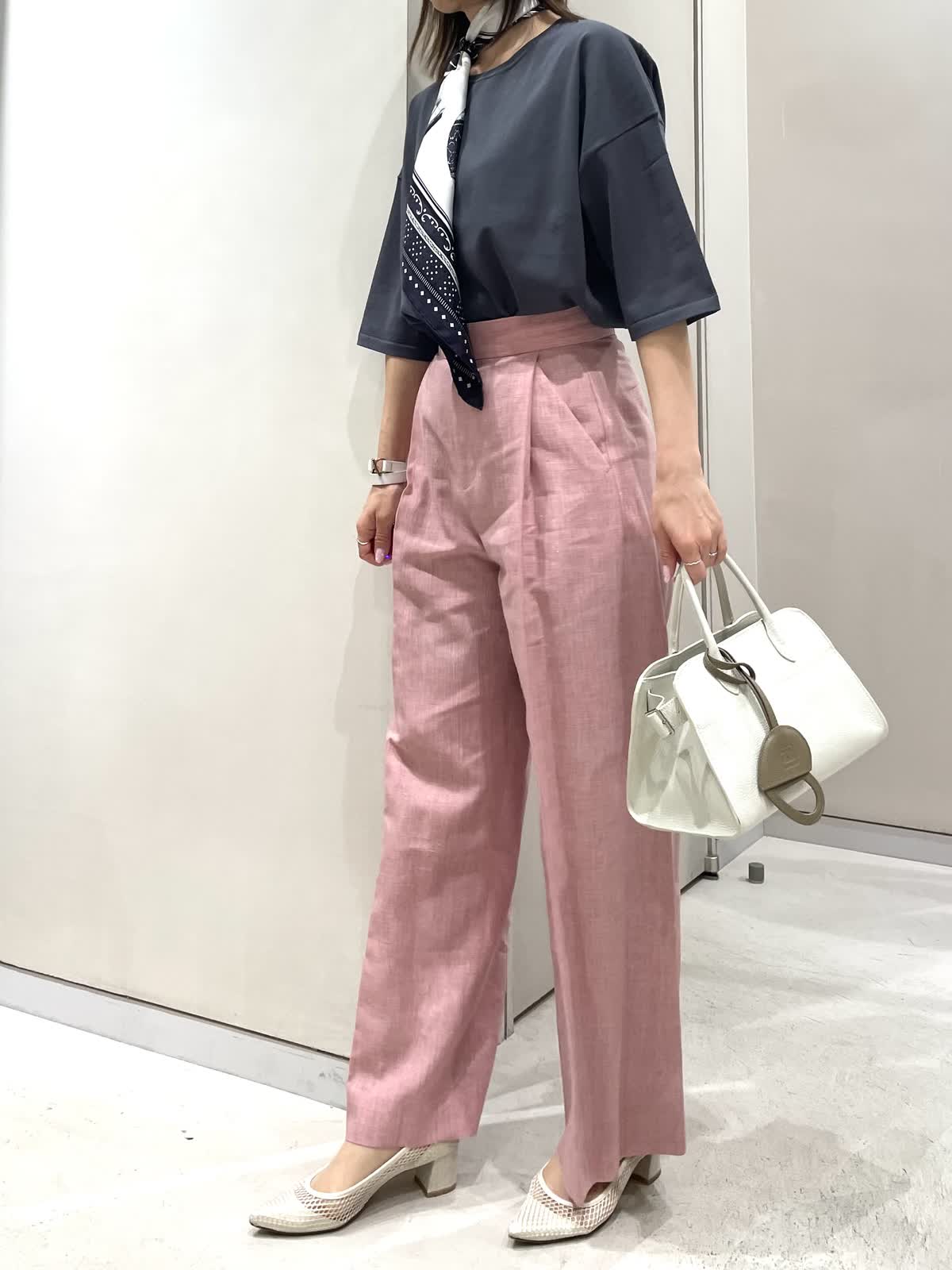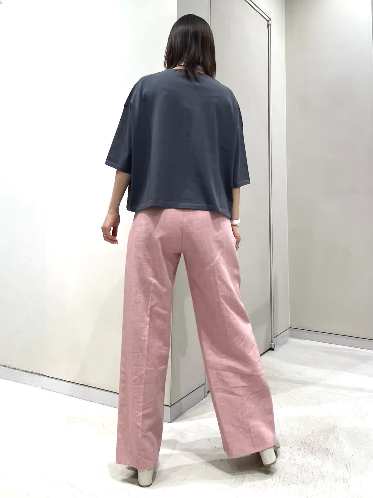 【着用サイズ・カラー】ニット・カーディガン : 9号 チャコールグレー パンツ : 7号 ピンク タック入りのワイドパンツで、存在感のある一着です。リネンの適度な張り感とドライタッチな風合いがとても心地よく軽くてはきやすいです。カラーパンツは、トップスにベーシックなカラーを合わせると、スタイリングがまとまって挑戦しやすいです。天気の良い日にサラリと着たいスタイリングです。