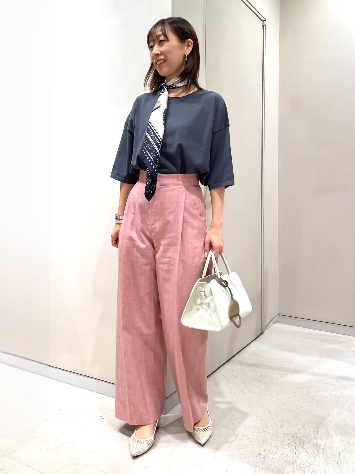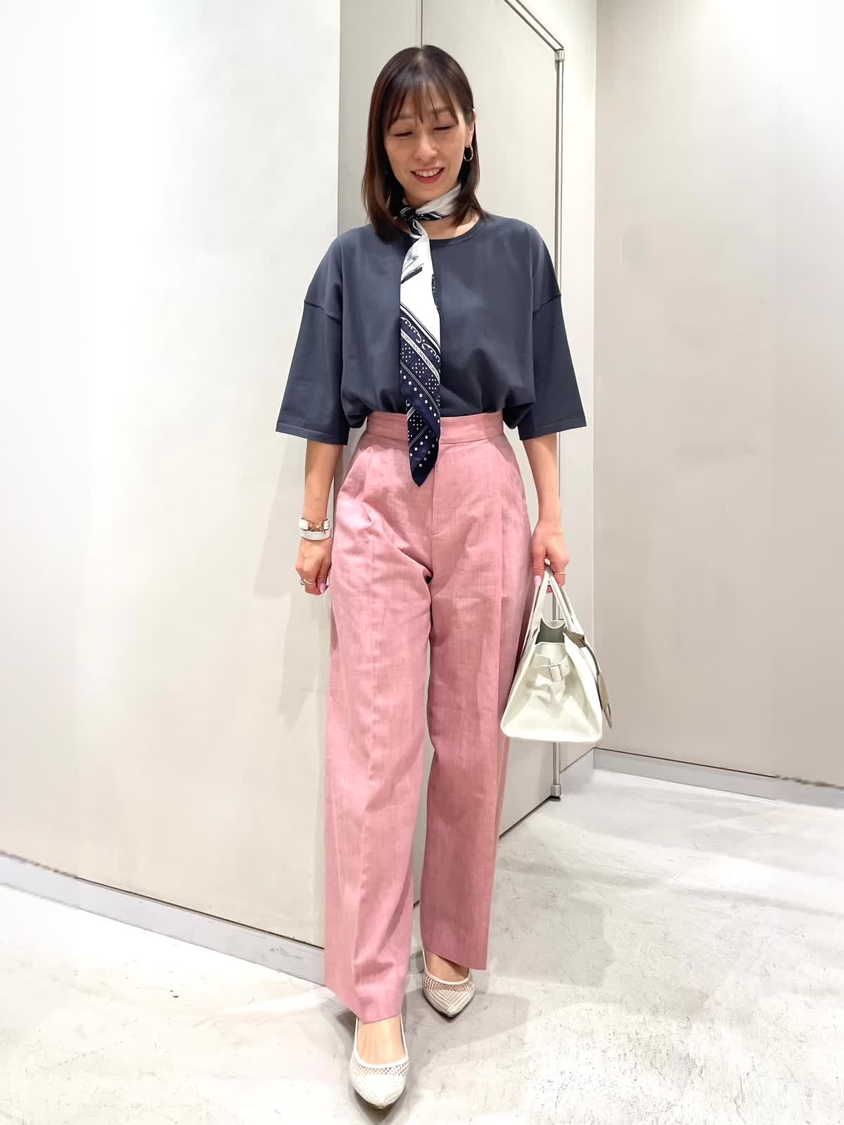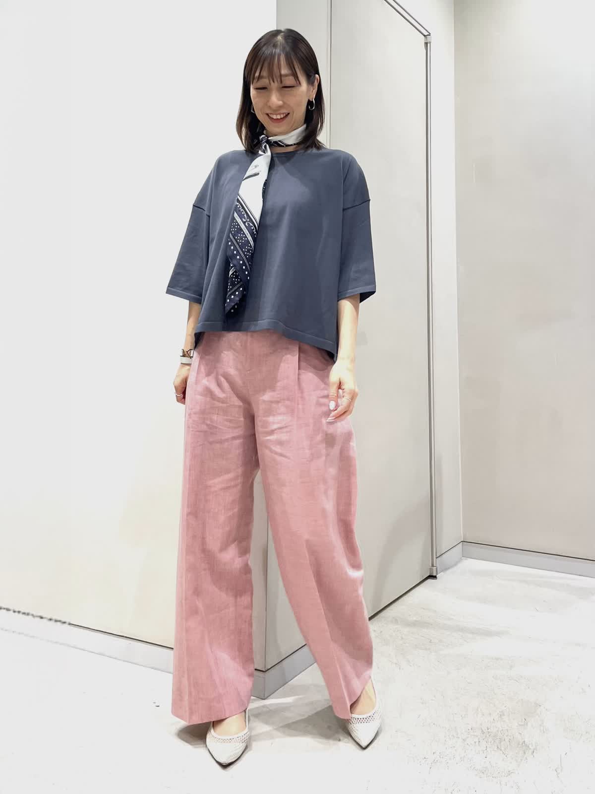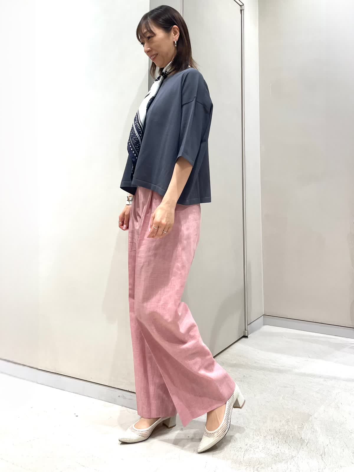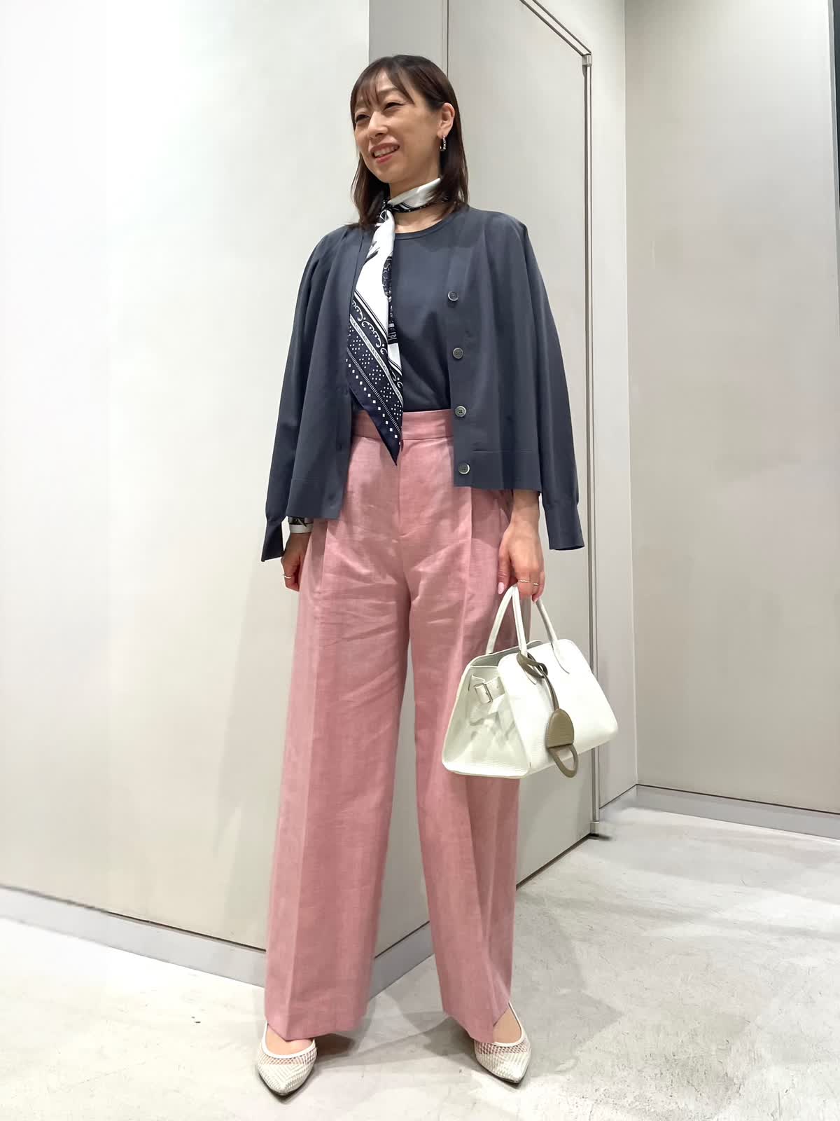 【着用サイズ・カラー】ニット・カーディガン : 9号 チャコールグレー パンツ : 7号 ピンク タック入りのワイドパンツで、存在感のある一着です。リネンの適度な張り感とドライタッチな風合いがとても心地よく軽くてはきやすいです。カラーパンツは、トップスにベーシックなカラーを合わせると、スタイリングがまとまって挑戦しやすいです。天気の良い日にサラリと着たいスタイリングです。