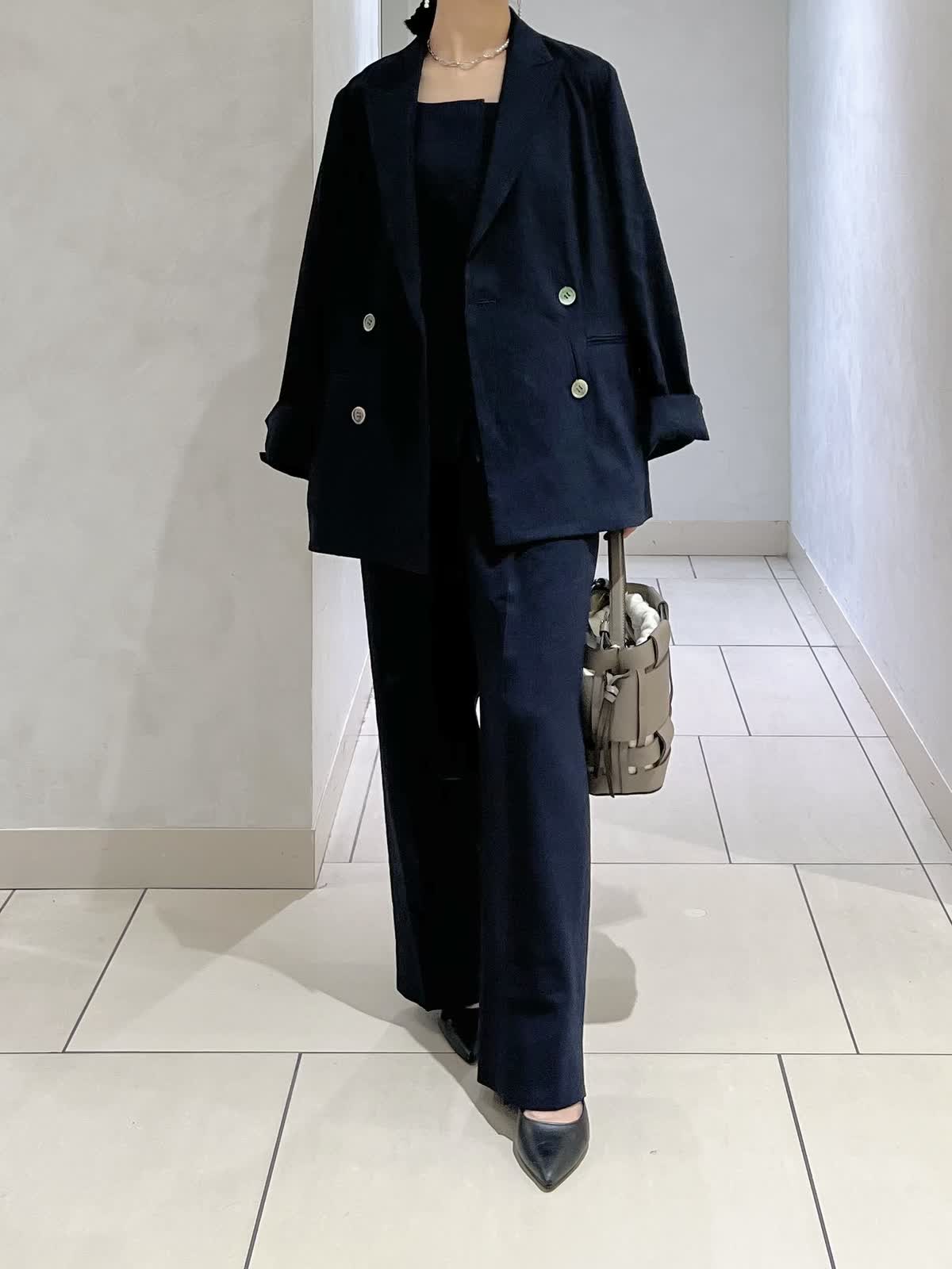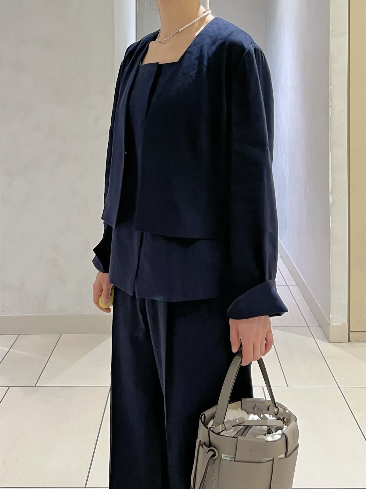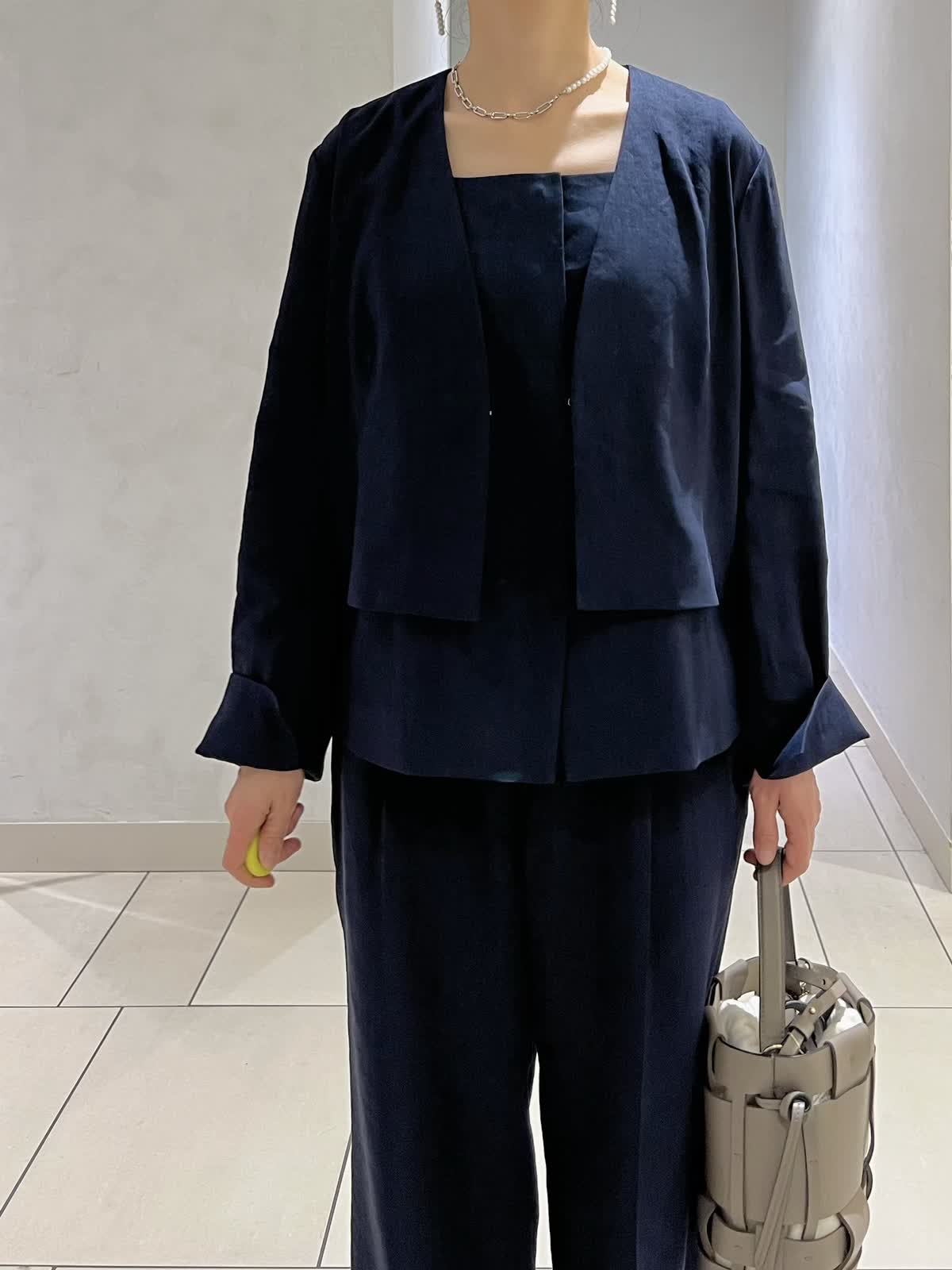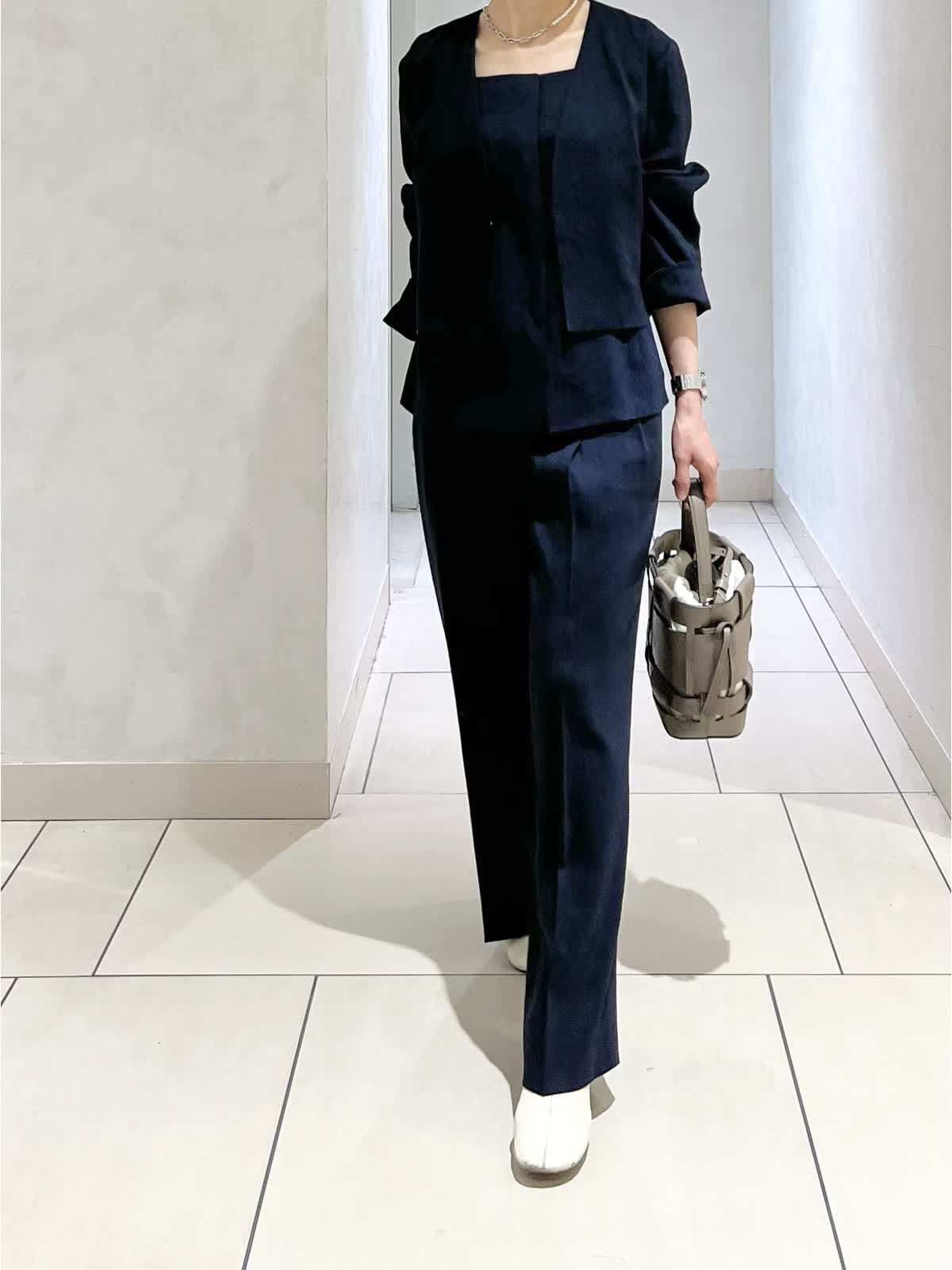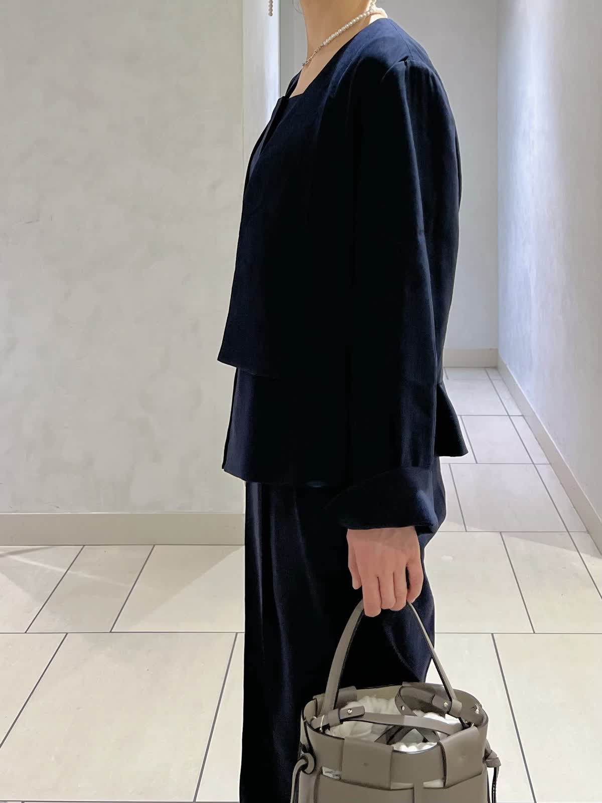 【カラー・サイズ】ジャケット:ネイビー・9号 ジレ:ネイビー・9号 パンツ:ネイビー・5号 トレンド感のあるスペンサージャケットのセットアップスタイル。Vネックとコンパクトな丈感で、すっきりとした印象に仕上げています。ワイドパンツと合わせることで、上品で抜け感のあるバランスに。シンプルながら洗練された、大人のモードスタイルが完成します。