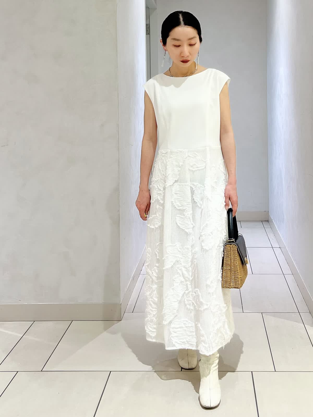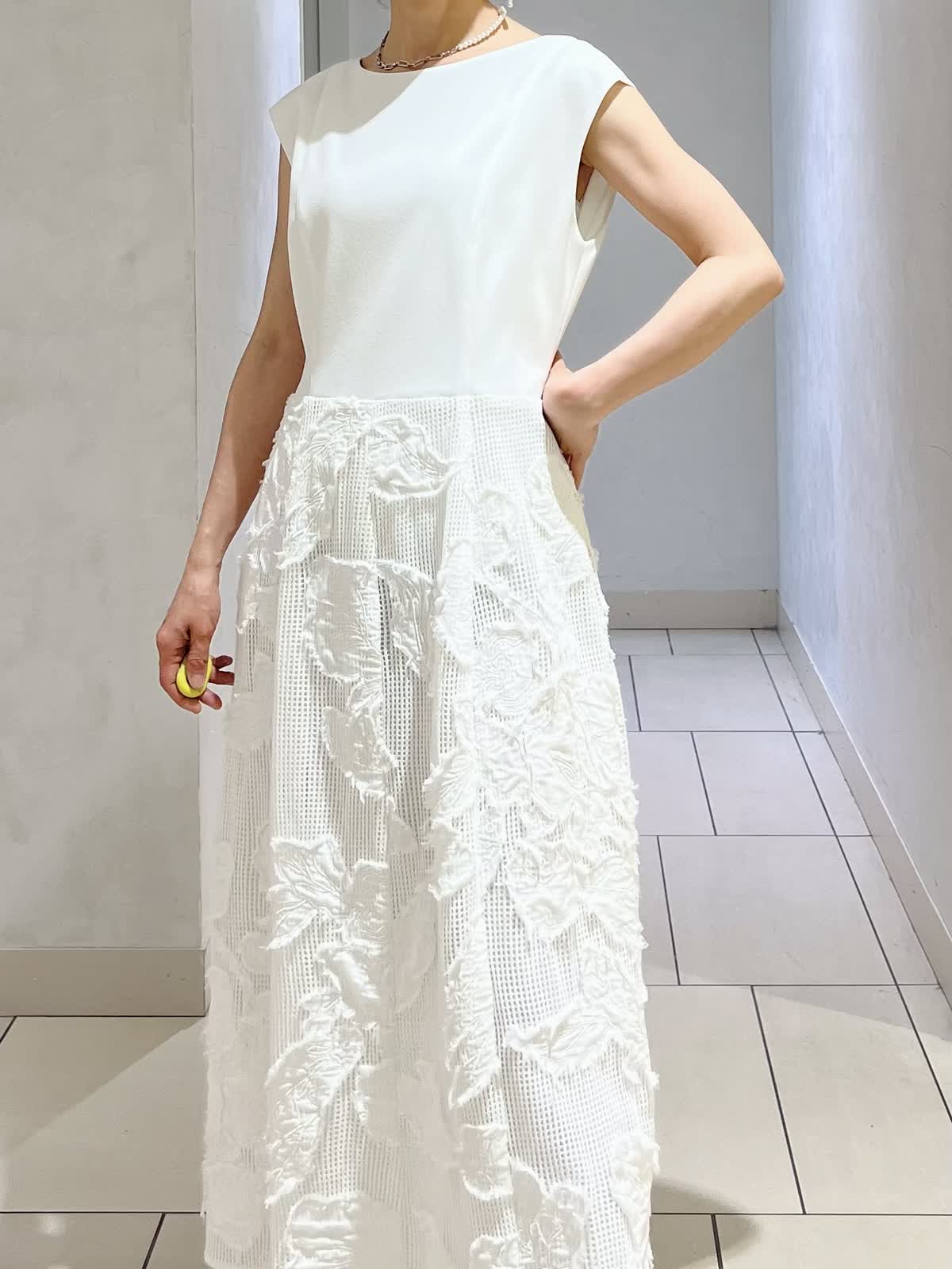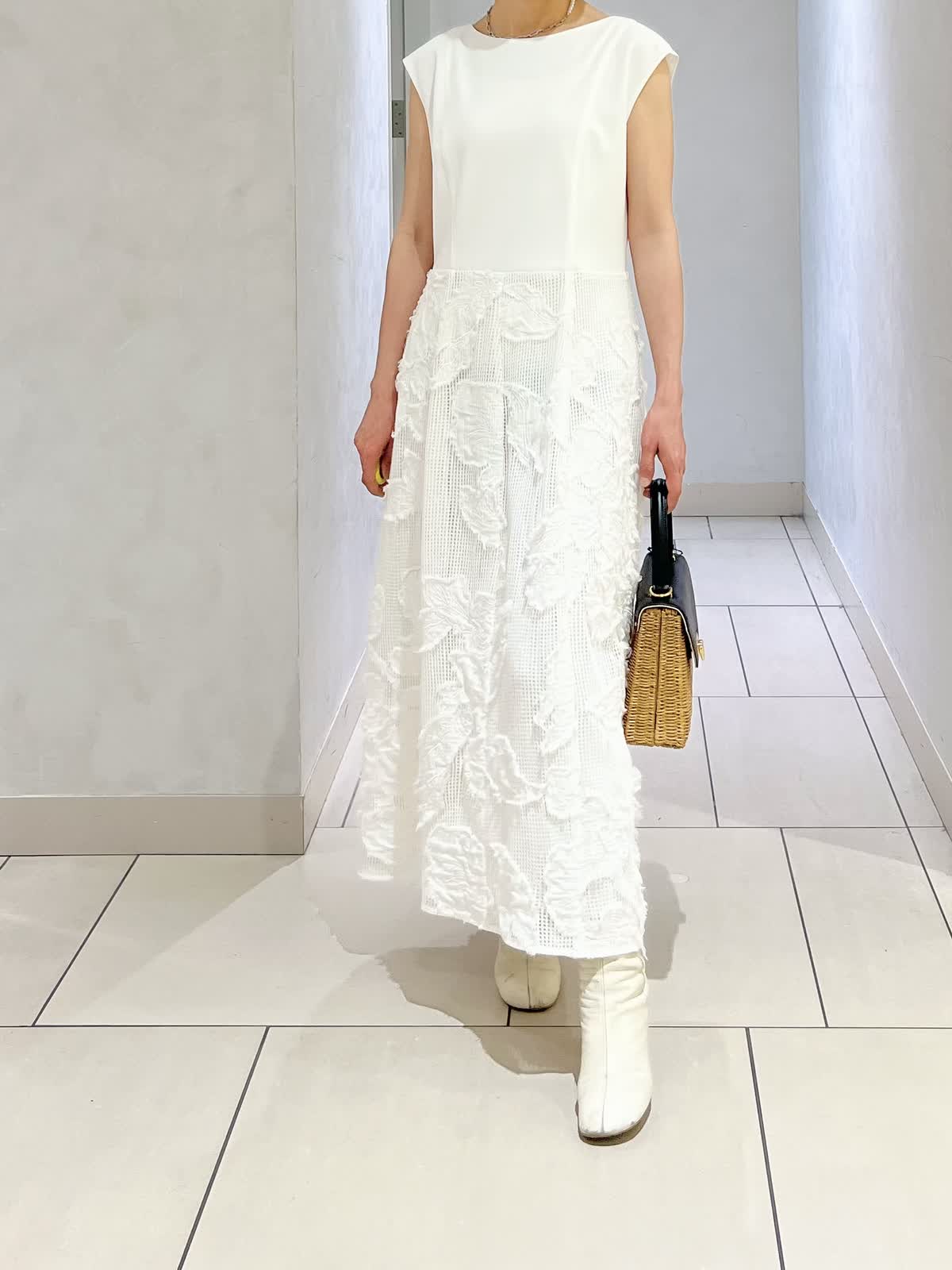 【カラー・サイズ】ワンピース:アイボリー・9号 着るだけでコーディネートが決まる、1枚で主役になるワンピース。上半身はやわらかくて着心地の良いカットソー素材、スカート部分は立体感のある生地で、シンプルながら華やかな印象に仕上げています。普段使いはもちろん、お出かけにも活躍する一着です。