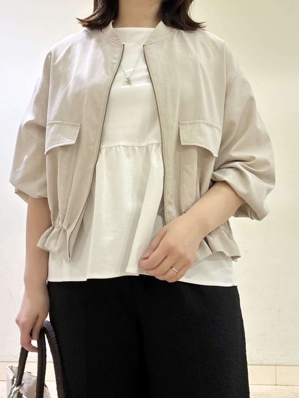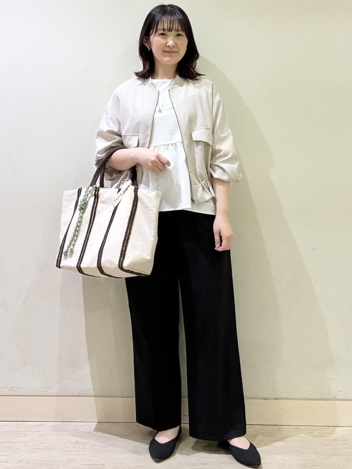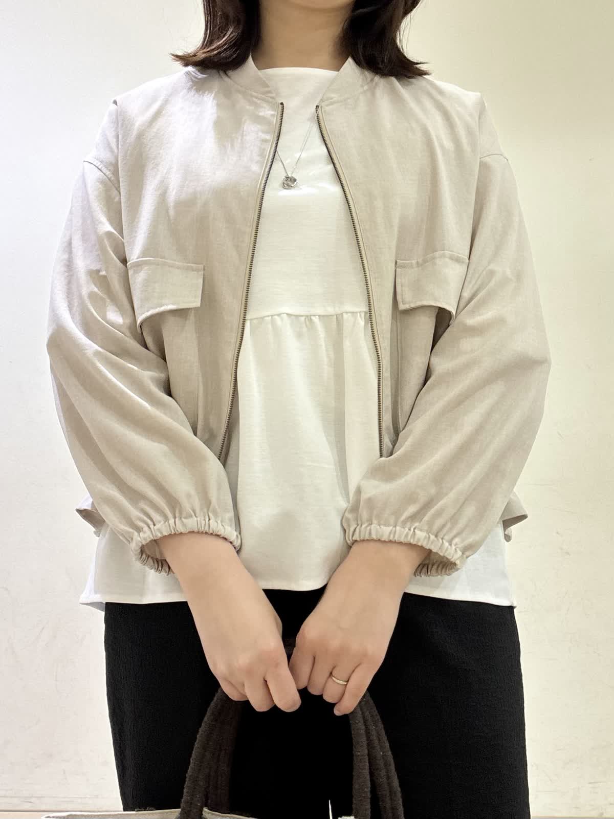 【着用カラー/サイズ】ブルゾン:ベージュ/フリー カットソー:ホワイト/ フリー パンツ :ブラック/11号 初夏の旅行コーデ リネンライクブルゾンを羽織れば、気温の変化に対応できて便利です。さらっとした薄手の素材でシワも気にならないので、旅行にぴったりです。カットソーとパンツは、伸縮性のある動きやすい素材でコーディネート。