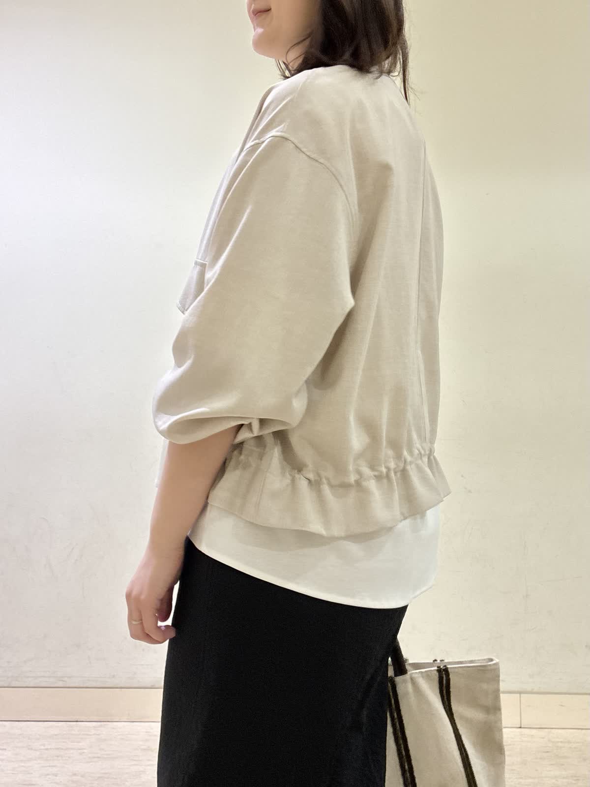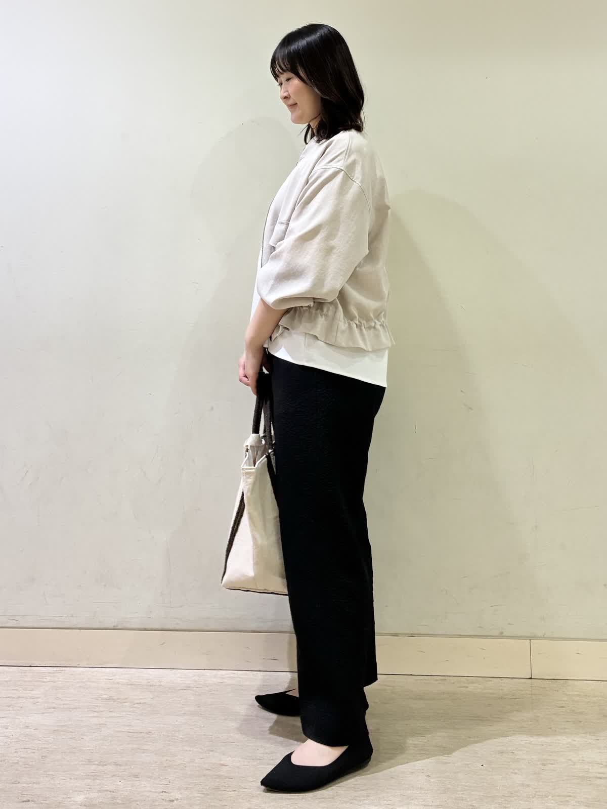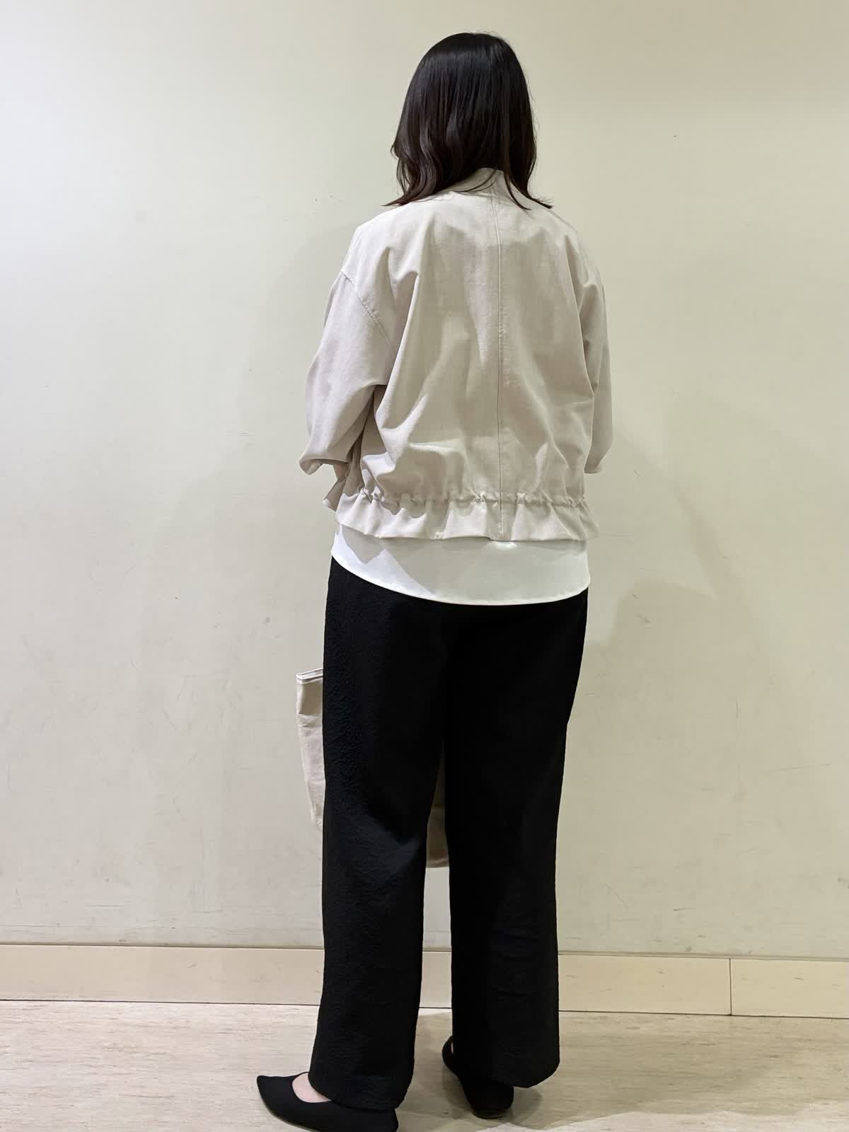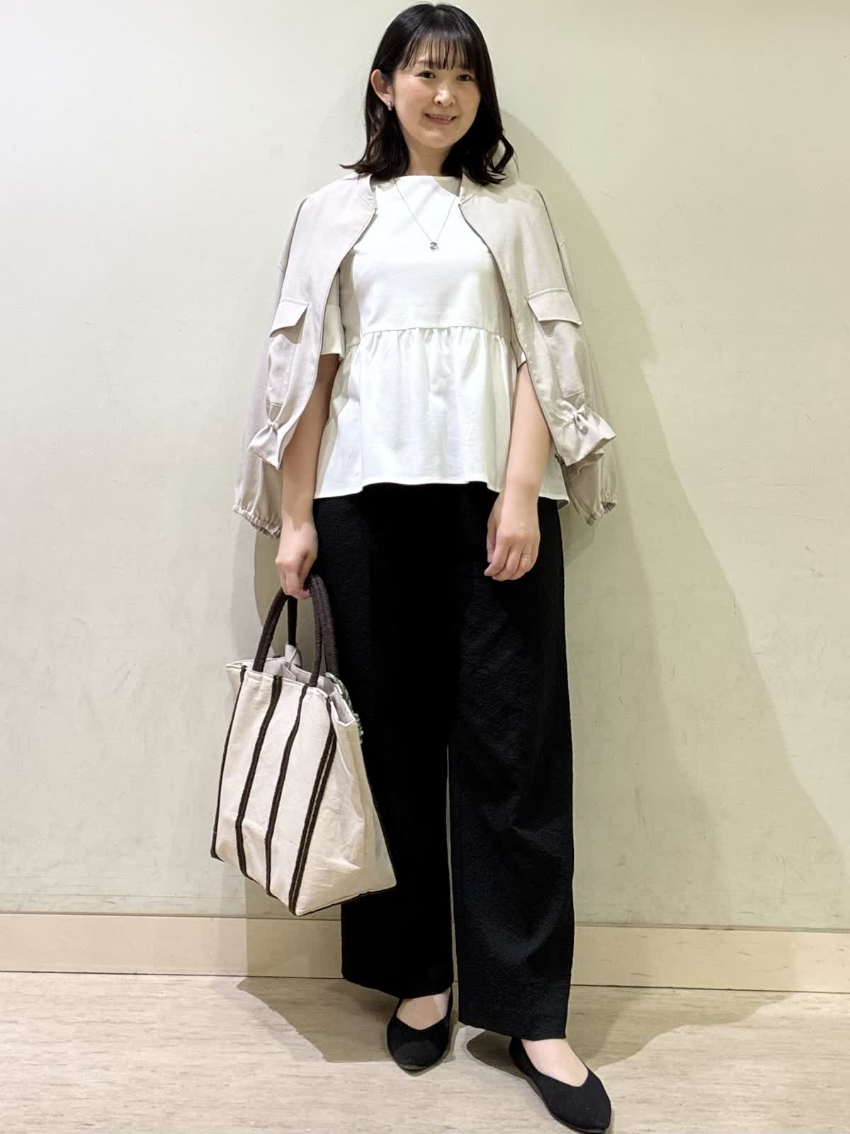 【着用カラー/サイズ】ブルゾン:ベージュ/フリー カットソー:ホワイト/ フリー パンツ :ブラック/11号 初夏の旅行コーデ リネンライクブルゾンを羽織れば、気温の変化に対応できて便利です。さらっとした薄手の素材でシワも気にならないので、旅行にぴったりです。カットソーとパンツは、伸縮性のある動きやすい素材でコーディネート。