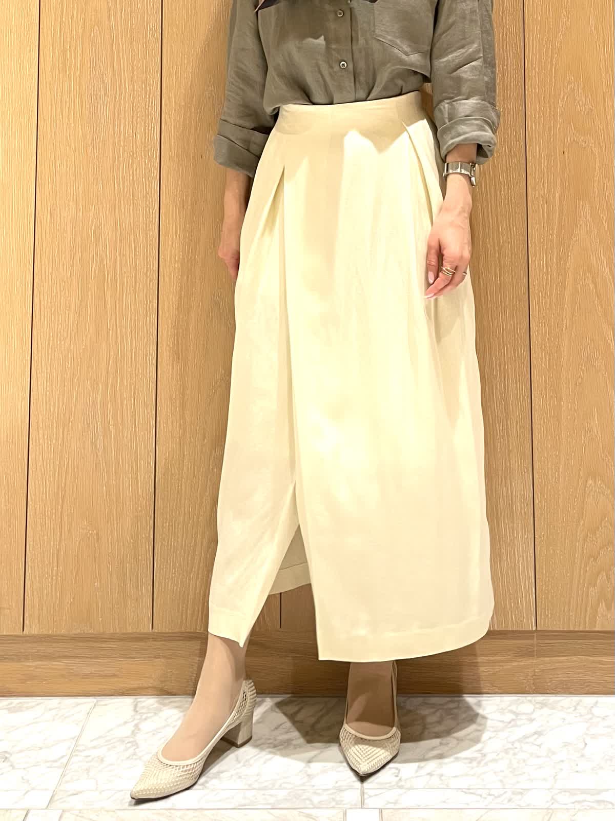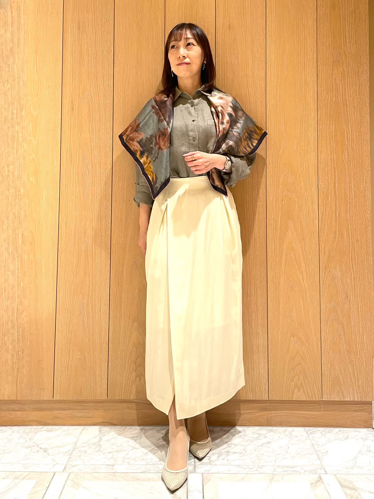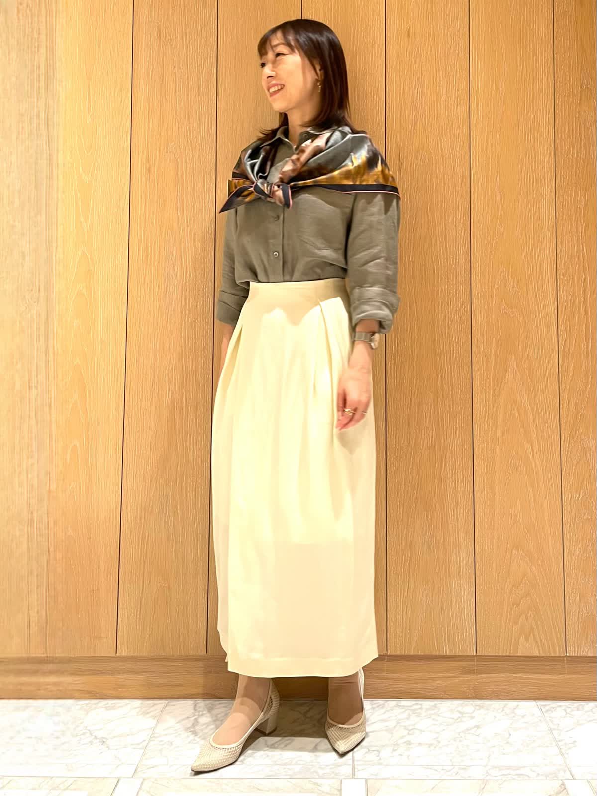 【着用サイズ・カラー】ブラウス : 9号 カーキ スカート : 7号 アイボリー ゴールデンウィークから秋口まで着られるオフィススタイルです。今年も暑い時期が長そうなので、カーキのリネンシャツは活躍しそうです。リネンシャツはラフに着崩すのも良いですが、スカートにインしてきちんと着るのも素敵です。お洋服が無地なので、スカーフで柄を足すのもオシャレです。スカートはコクーンっぽいシルエットなので、腰回りが気にならないデザインです。ウエストの後ろがゴム仕様なのも嬉しいです。