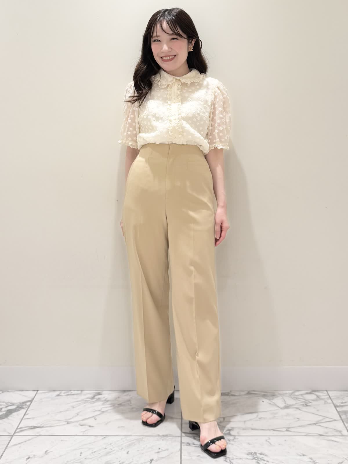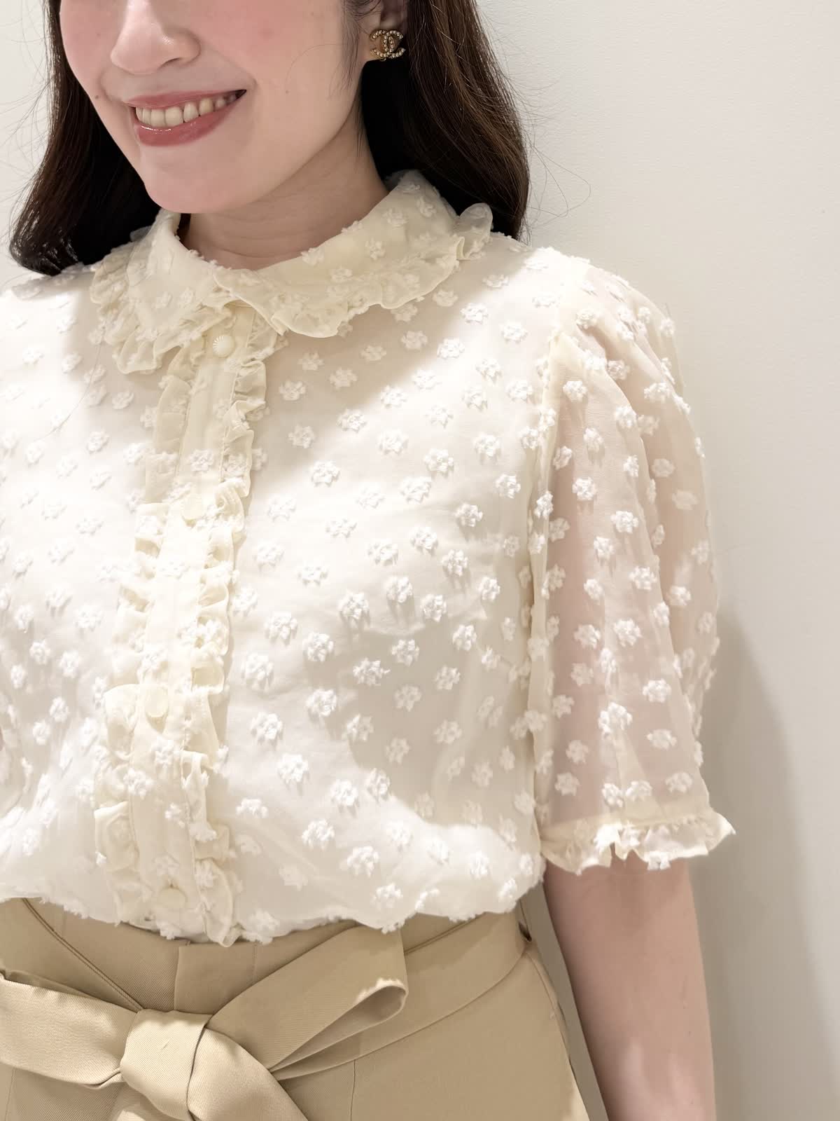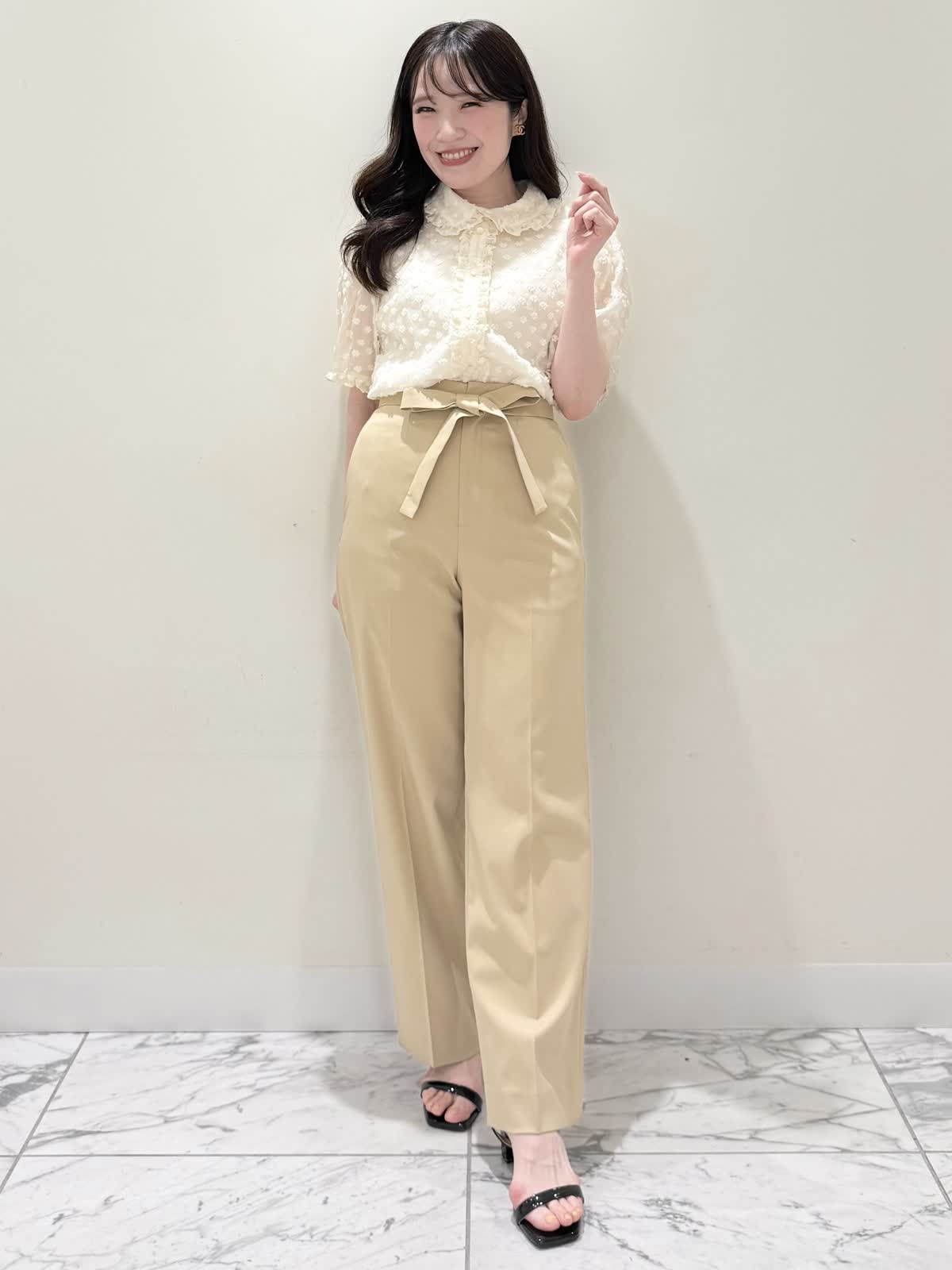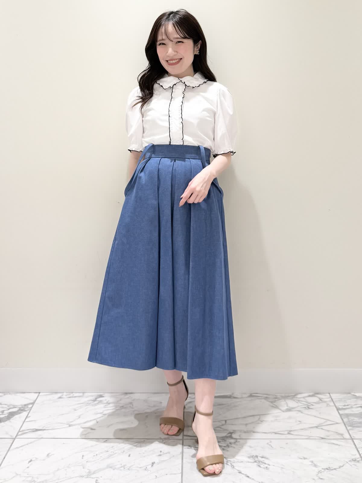【着用サイズ/カラー】ブラウス:7号/オフホワイト・ホワイト・サックス・チェリーピンク スカート:5号/サックス パンツ:5号/ブラック・ベージュ コラボブラウスの着回しコーディネート♪ ドットジャガードのブラウスはふわっと軽いシアー生地。薄い生地なのでキャミソールを着るのをおすすめします。素材違いのブラウスはハリ感がありますが、ゴワゴワとした感じではなくコットンのツヤッとした質感もあるのでサラッとした着心地。メロウの配色は色味ごとに変えてるのがポイント。1つ目の合わせはデニムスカート。タック入りで広がりすぎないスッキリと着られるフレアシルエット。サスペンダーは取り外し可能なので、その日の気分で楽しめます。サスペンダーは長さ調節ができるボタンホールが後ろに2箇所あります。後ろゴムの伸び感は少なめなので程よい余裕が欲しい方は1サイズ大きめでも◯2つ目の合わせはパンツ。サラサラとした生地に薄手の裏地付きで透け感防止。脚が綺麗に見えるストレートシルエット。後ろゴムで履き心地良く、ベルトは取り外し可能。ベルトなしだと、スッキリとした印象で着られます。その日の気分で楽しめます。いつものサイズで大丈夫です。