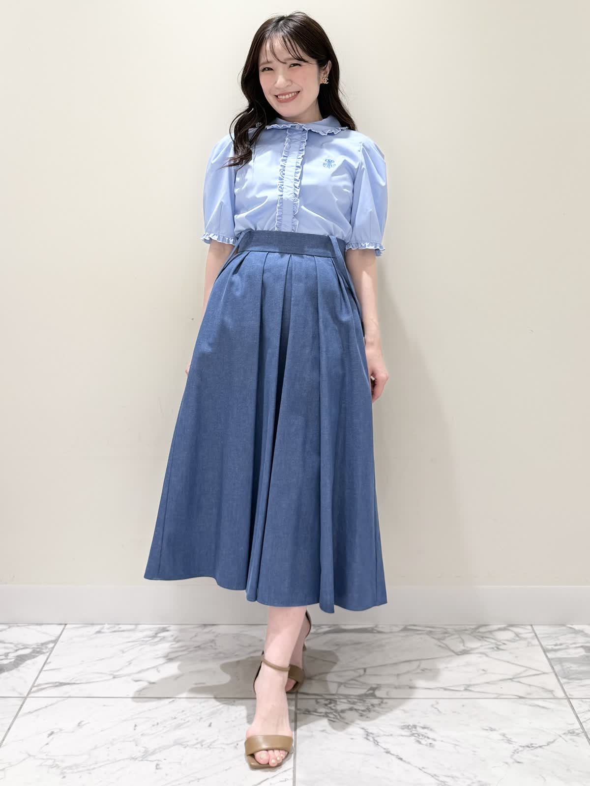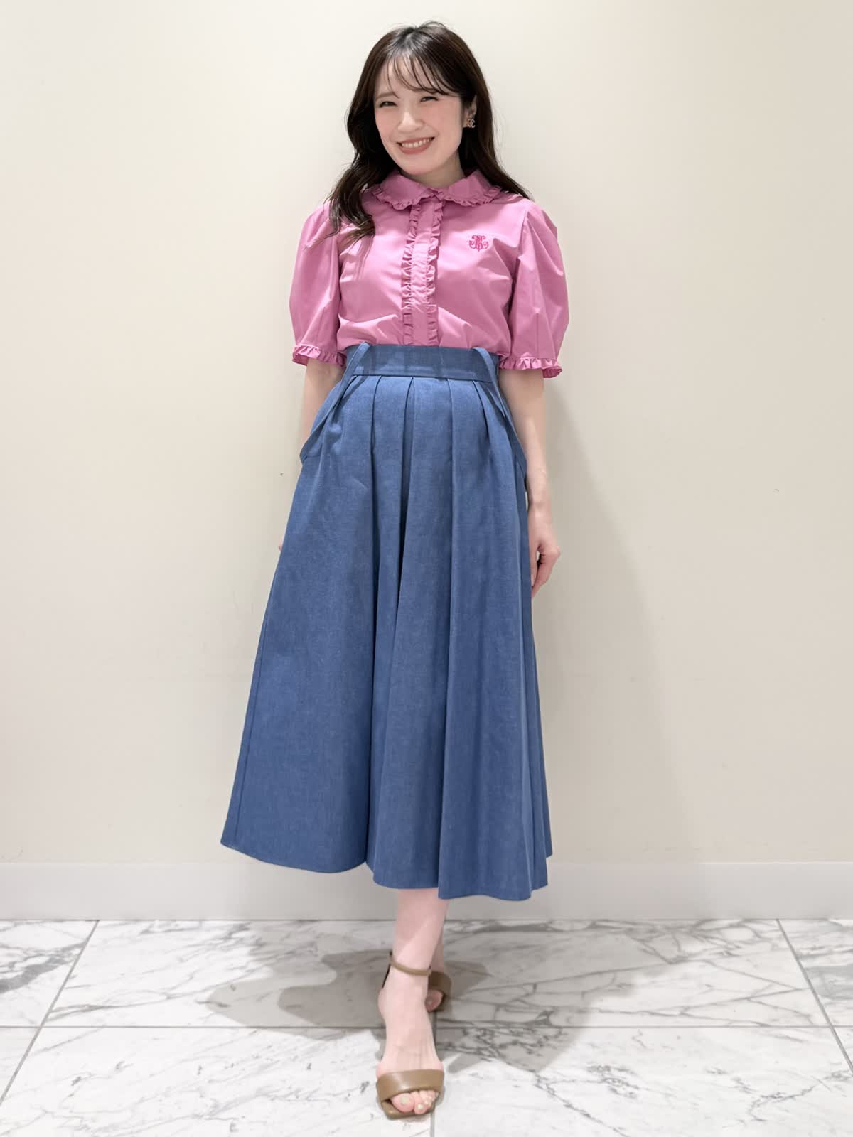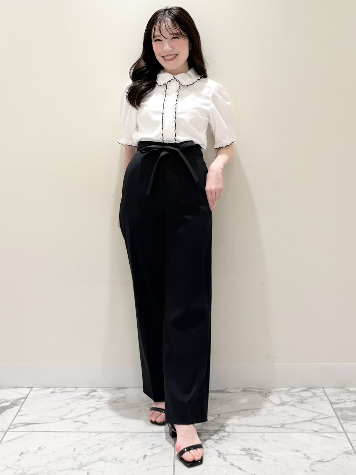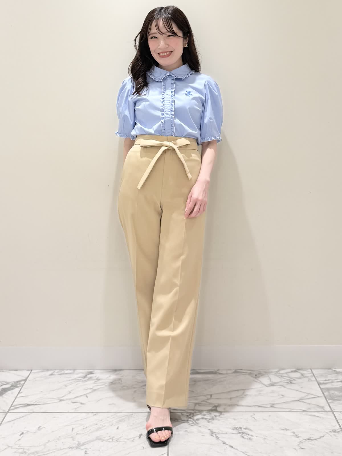 【着用サイズ/カラー】ブラウス:7号/オフホワイト・ホワイト・サックス・チェリーピンク スカート:5号/サックス パンツ:5号/ブラック・ベージュ コラボブラウスの着回しコーディネート♪ ドットジャガードのブラウスはふわっと軽いシアー生地。薄い生地なのでキャミソールを着るのをおすすめします。素材違いのブラウスはハリ感がありますが、ゴワゴワとした感じではなくコットンのツヤッとした質感もあるのでサラッとした着心地。メロウの配色は色味ごとに変えてるのがポイント。1つ目の合わせはデニムスカート。タック入りで広がりすぎないスッキリと着られるフレアシルエット。サスペンダーは取り外し可能なので、その日の気分で楽しめます。サスペンダーは長さ調節ができるボタンホールが後ろに2箇所あります。後ろゴムの伸び感は少なめなので程よい余裕が欲しい方は1サイズ大きめでも◯2つ目の合わせはパンツ。サラサラとした生地に薄手の裏地付きで透け感防止。脚が綺麗に見えるストレートシルエット。後ろゴムで履き心地良く、ベルトは取り外し可能。ベルトなしだと、スッキリとした印象で着られます。その日の気分で楽しめます。いつものサイズで大丈夫です。