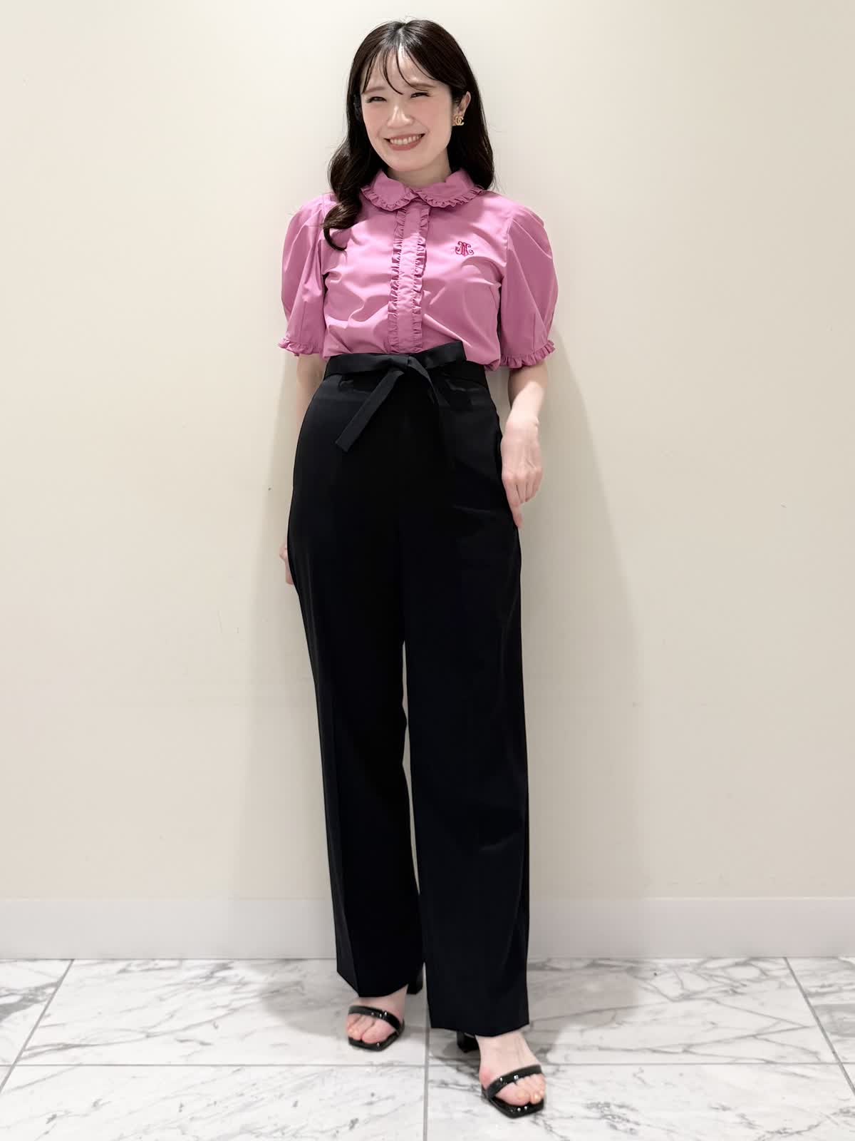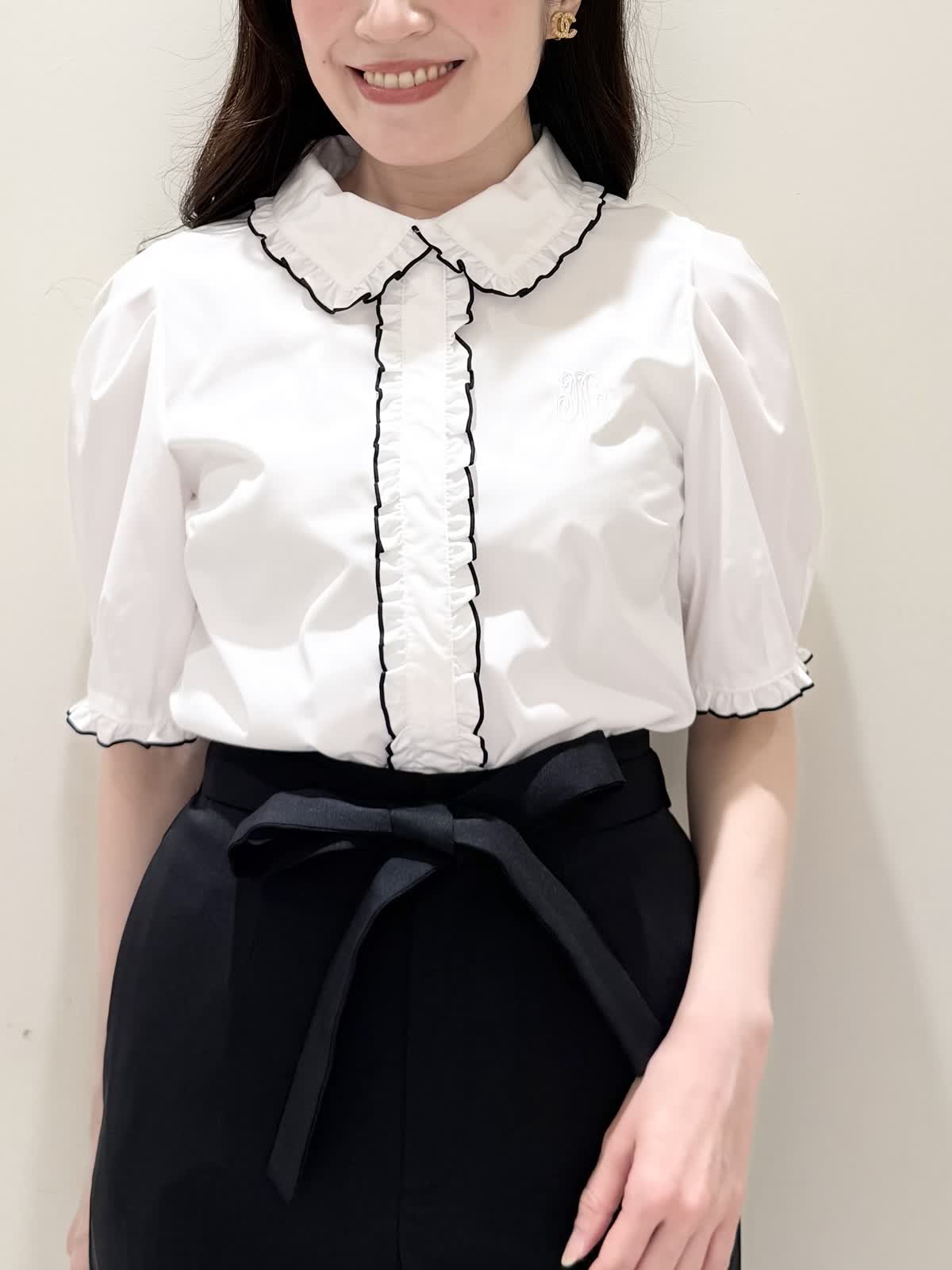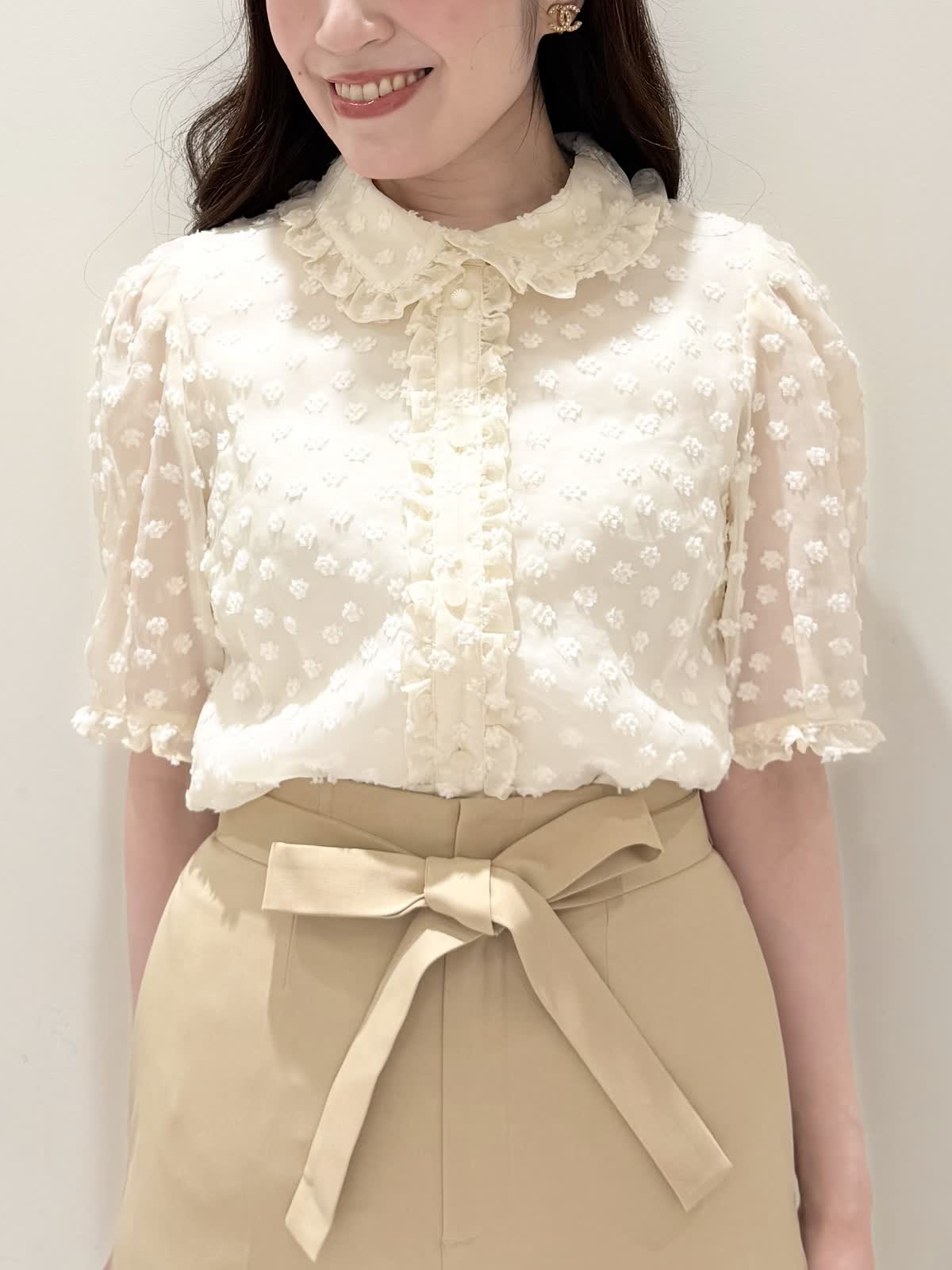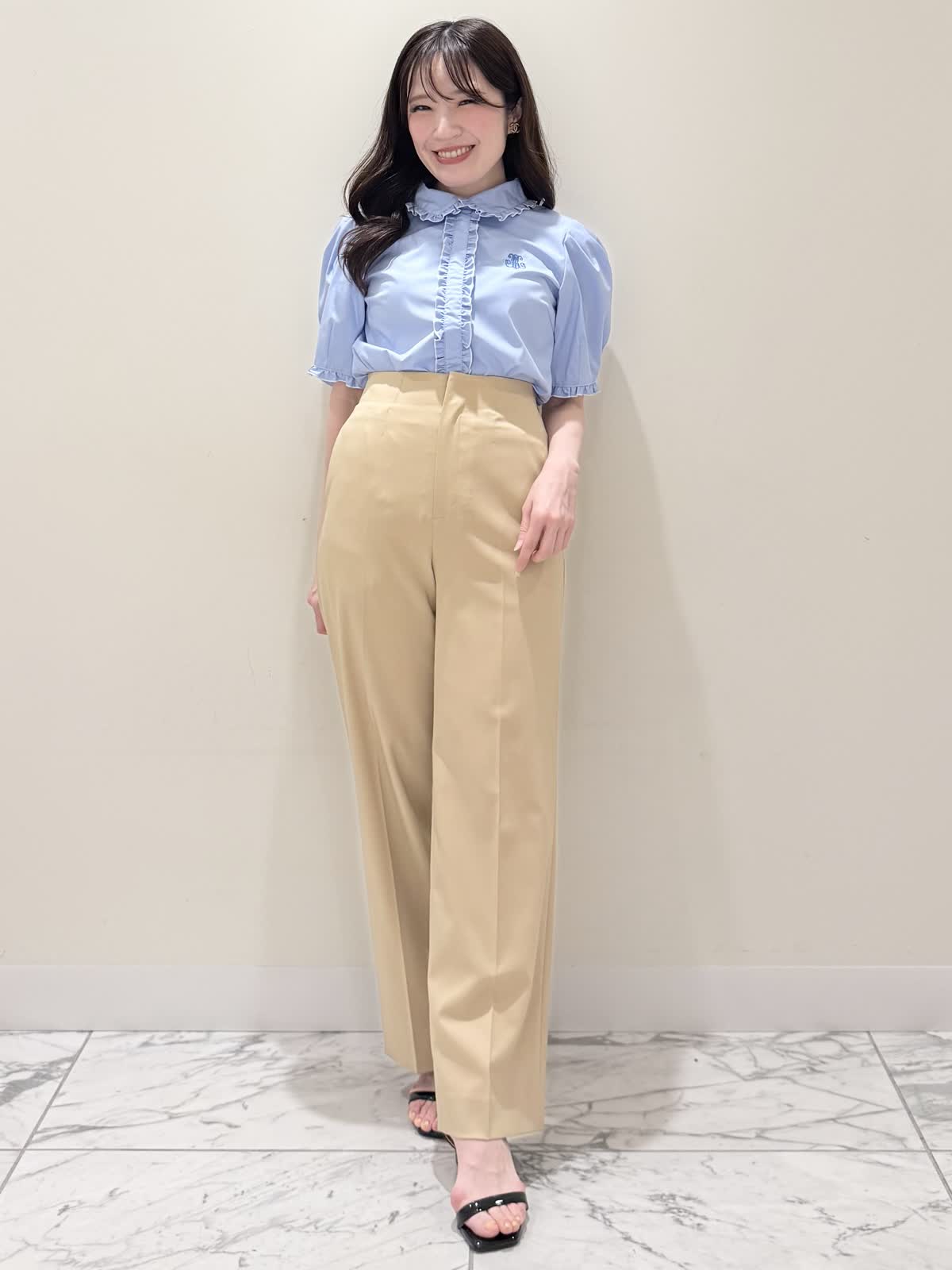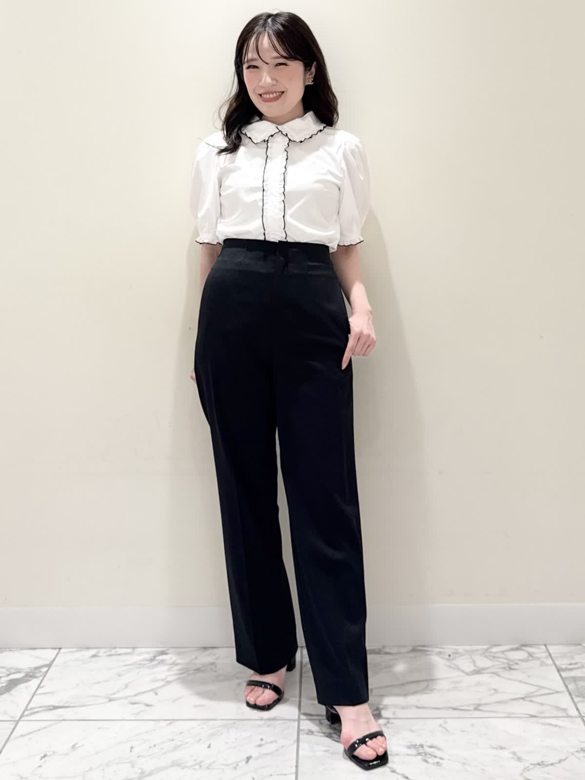 【着用サイズ/カラー】ブラウス:7号/オフホワイト・ホワイト・サックス・チェリーピンク スカート:5号/サックス パンツ:5号/ブラック・ベージュ コラボブラウスの着回しコーディネート♪ ドットジャガードのブラウスはふわっと軽いシアー生地。薄い生地なのでキャミソールを着るのをおすすめします。素材違いのブラウスはハリ感がありますが、ゴワゴワとした感じではなくコットンのツヤッとした質感もあるのでサラッとした着心地。メロウの配色は色味ごとに変えてるのがポイント。1つ目の合わせはデニムスカート。タック入りで広がりすぎないスッキリと着られるフレアシルエット。サスペンダーは取り外し可能なので、その日の気分で楽しめます。サスペンダーは長さ調節ができるボタンホールが後ろに2箇所あります。後ろゴムの伸び感は少なめなので程よい余裕が欲しい方は1サイズ大きめでも◯2つ目の合わせはパンツ。サラサラとした生地に薄手の裏地付きで透け感防止。脚が綺麗に見えるストレートシルエット。後ろゴムで履き心地良く、ベルトは取り外し可能。ベルトなしだと、スッキリとした印象で着られます。その日の気分で楽しめます。いつものサイズで大丈夫です。