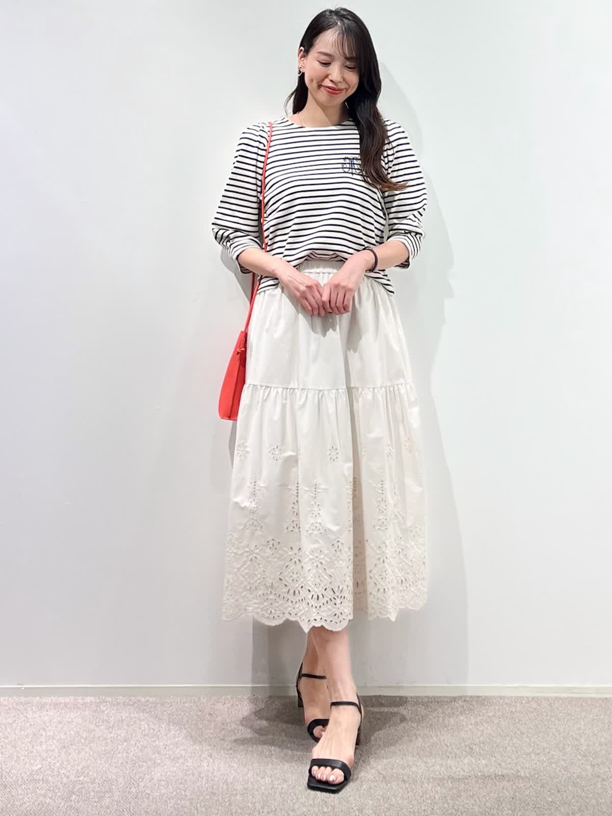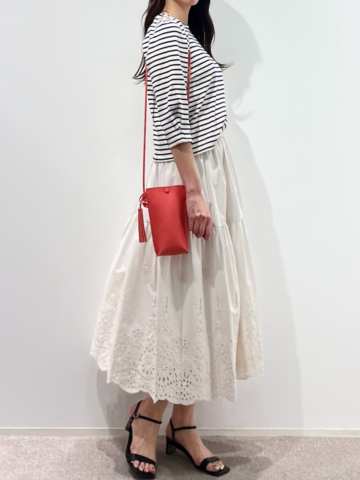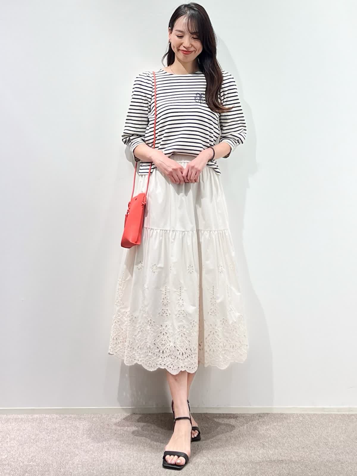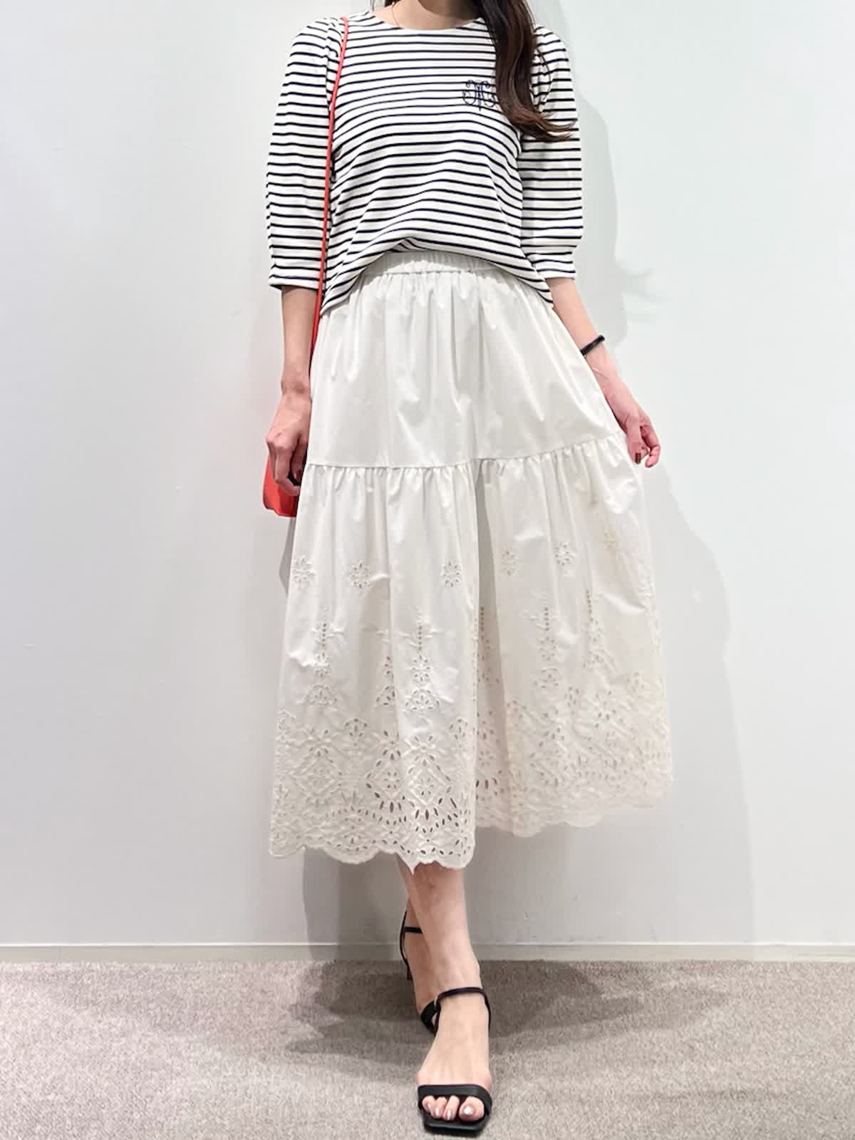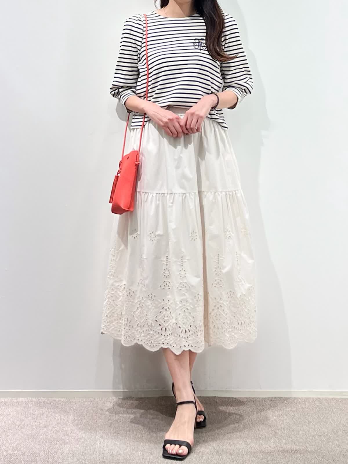 【着用サイズ】カットソー:9号 スカート:9号 【着用カラー】カットソー:アイボリー スカート:アイボリー バッグ:サーモンピンク 「大人可愛いカジュアルMIXコーデ」 ボーダーカットソーは、七部袖で二の腕カバーと、程よいボリューム袖でフェミニンに着こなせるおすすめアイテム。胸元のMaglieオリジナルロゴと、バックシルエットのファスナーがポイント。ボトムは、レーススカラップ刺繍スカートで一気にフェミニンスタイルに。ウエストはゴム仕様で楽に着用できてストレスフリー。休日のお出かけにもぴったりで、ランチや旅行などにも活躍するおすすめコーデです。