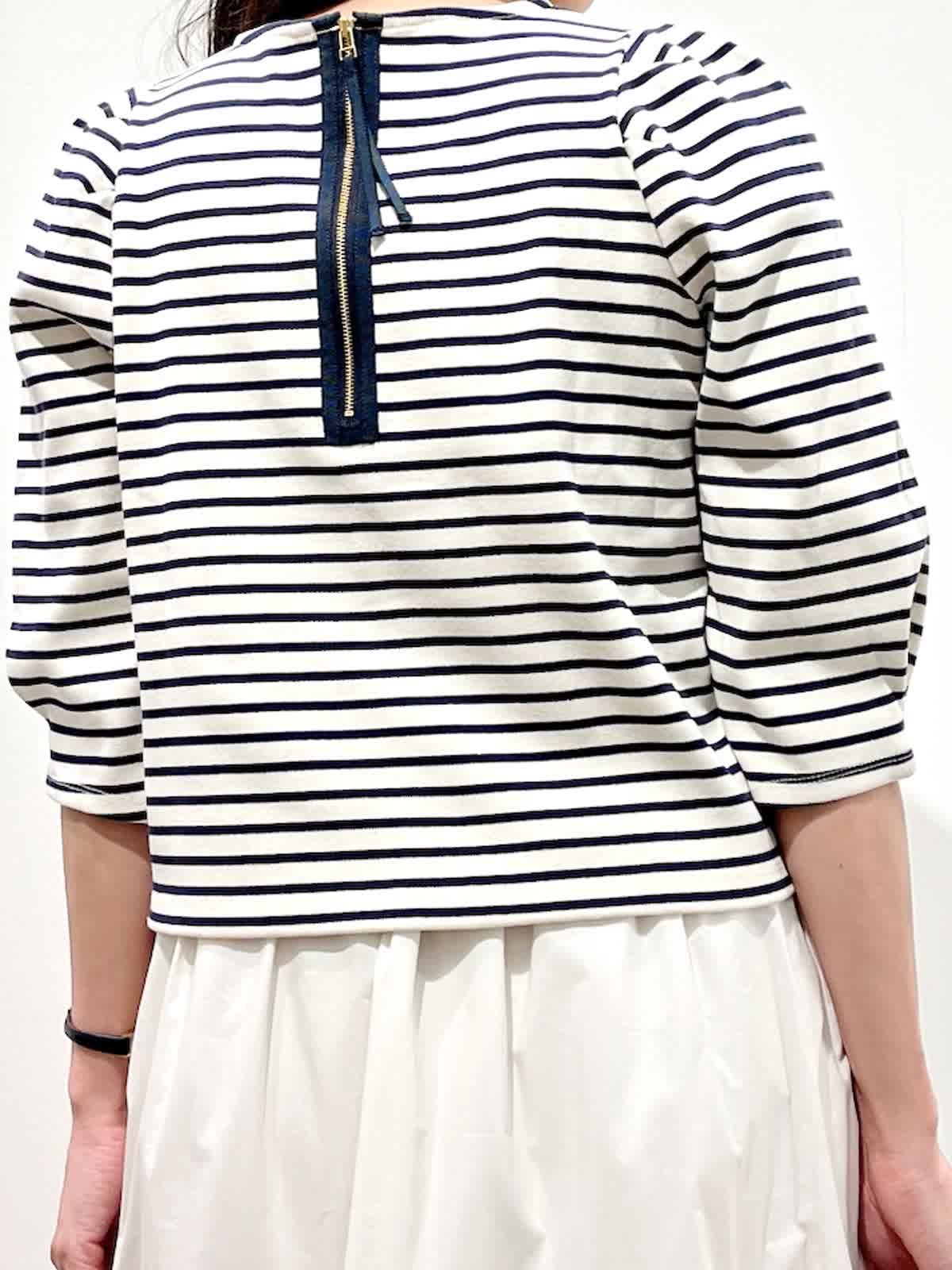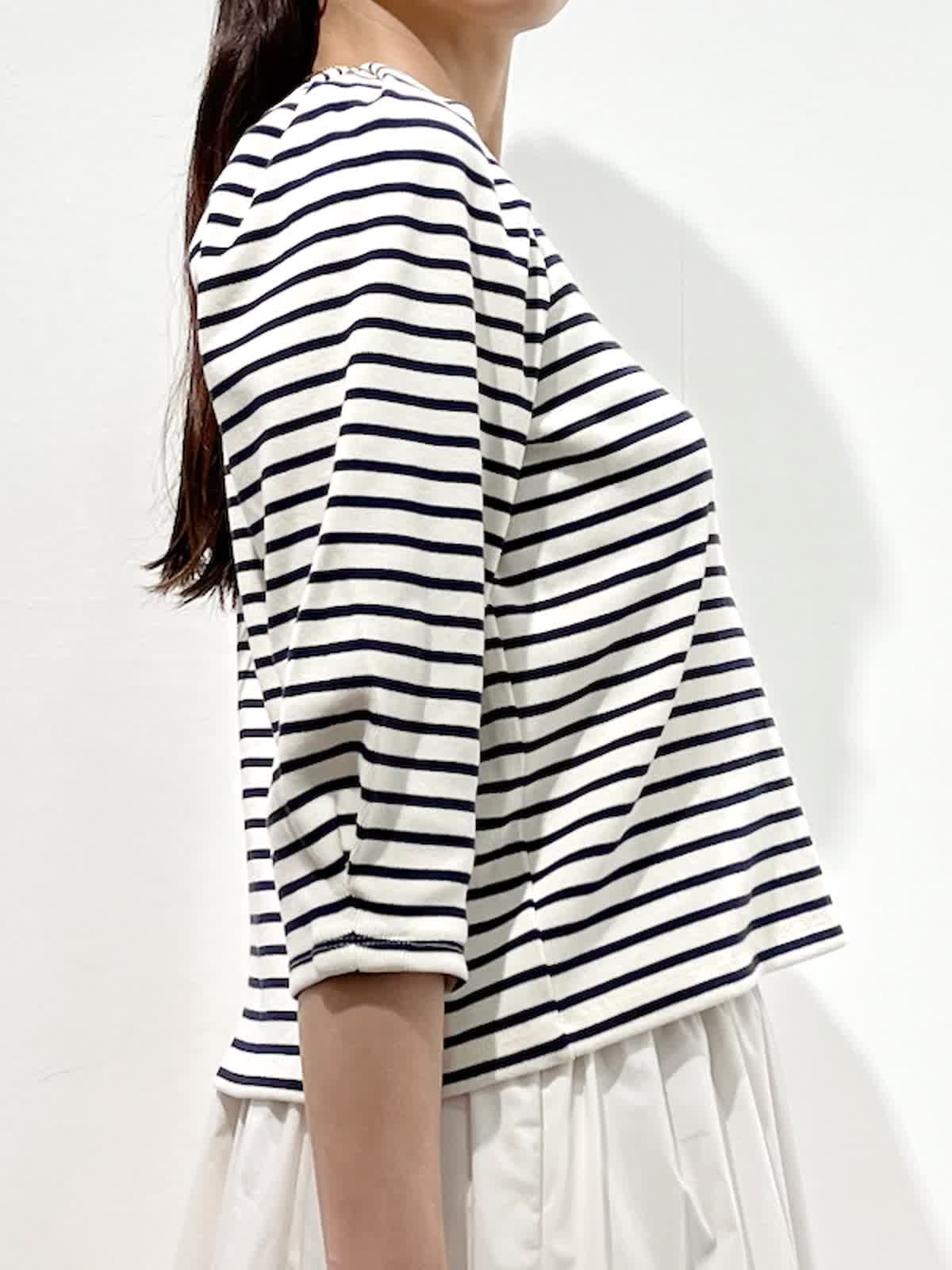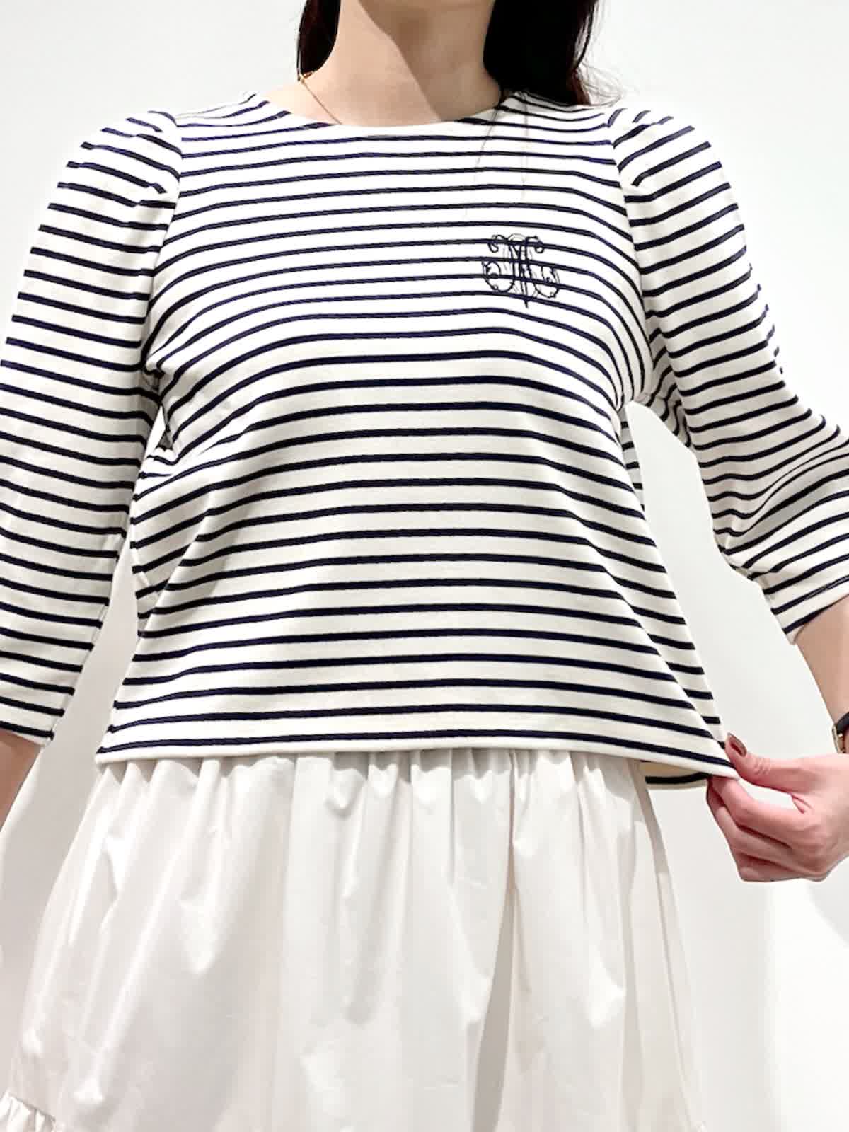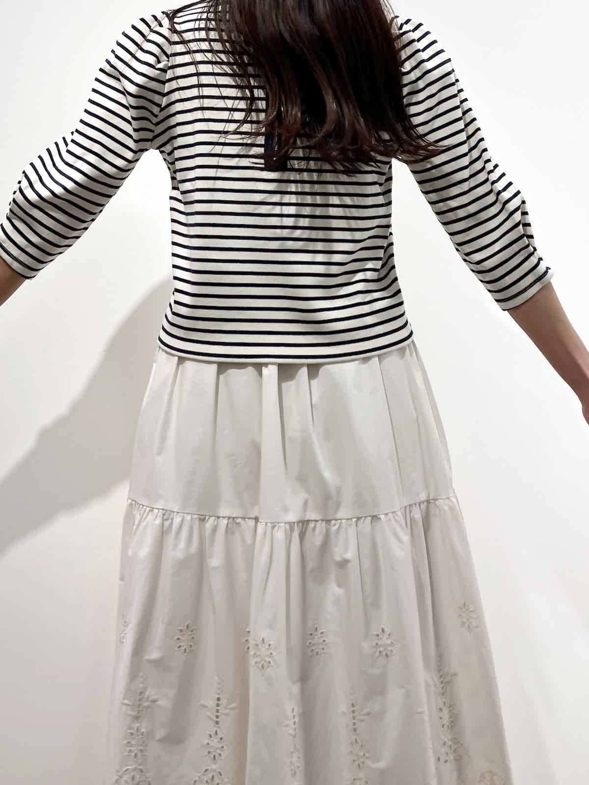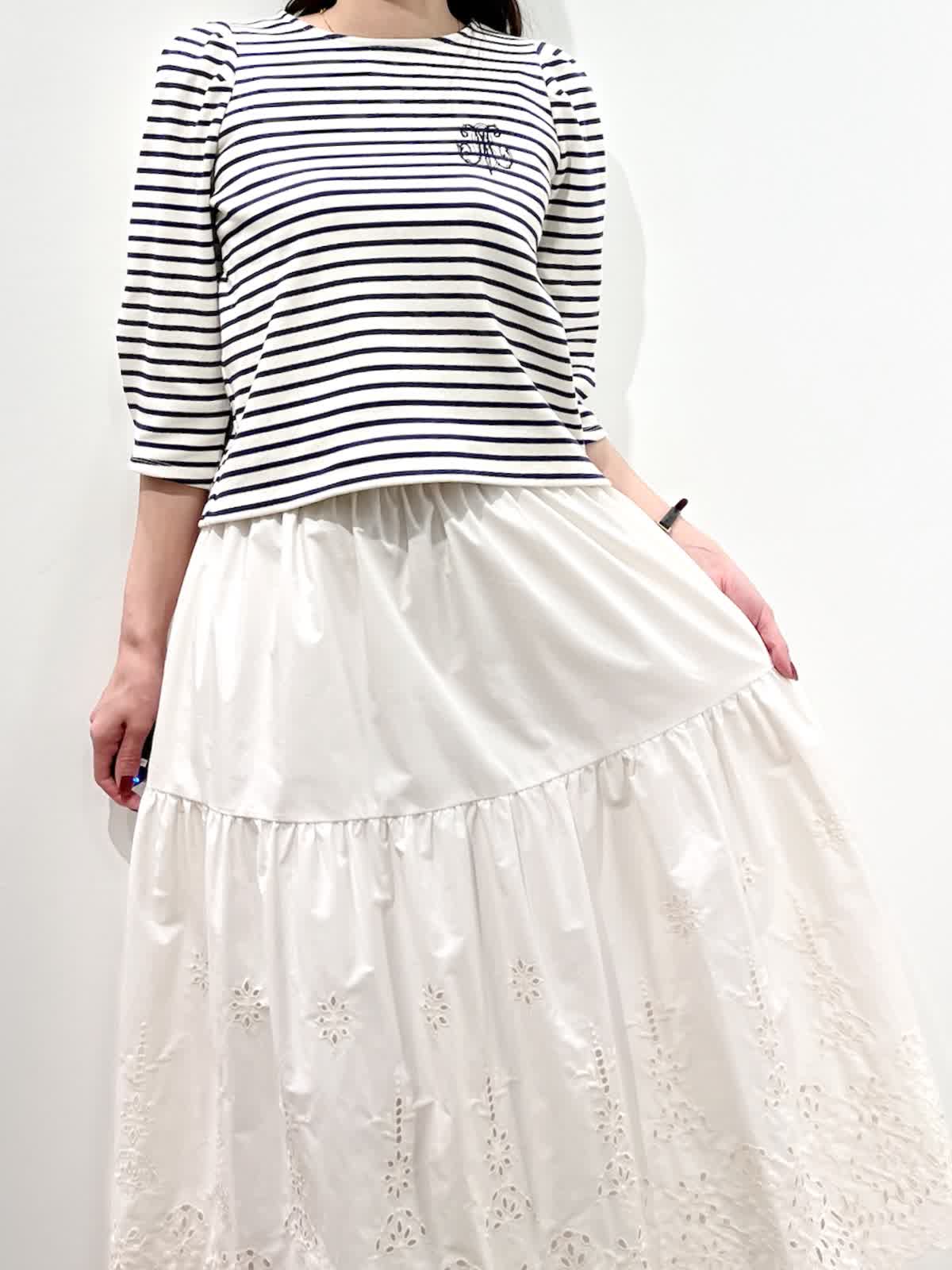 【着用サイズ】カットソー:9号 スカート:9号 【着用カラー】カットソー:アイボリー スカート:アイボリー バッグ:サーモンピンク 「大人可愛いカジュアルMIXコーデ」 ボーダーカットソーは、七部袖で二の腕カバーと、程よいボリューム袖でフェミニンに着こなせるおすすめアイテム。胸元のMaglieオリジナルロゴと、バックシルエットのファスナーがポイント。ボトムは、レーススカラップ刺繍スカートで一気にフェミニンスタイルに。ウエストはゴム仕様で楽に着用できてストレスフリー。休日のお出かけにもぴったりで、ランチや旅行などにも活躍するおすすめコーデです。