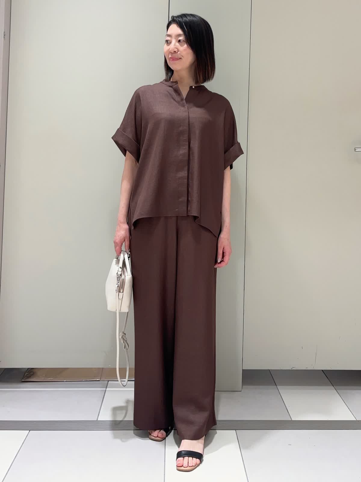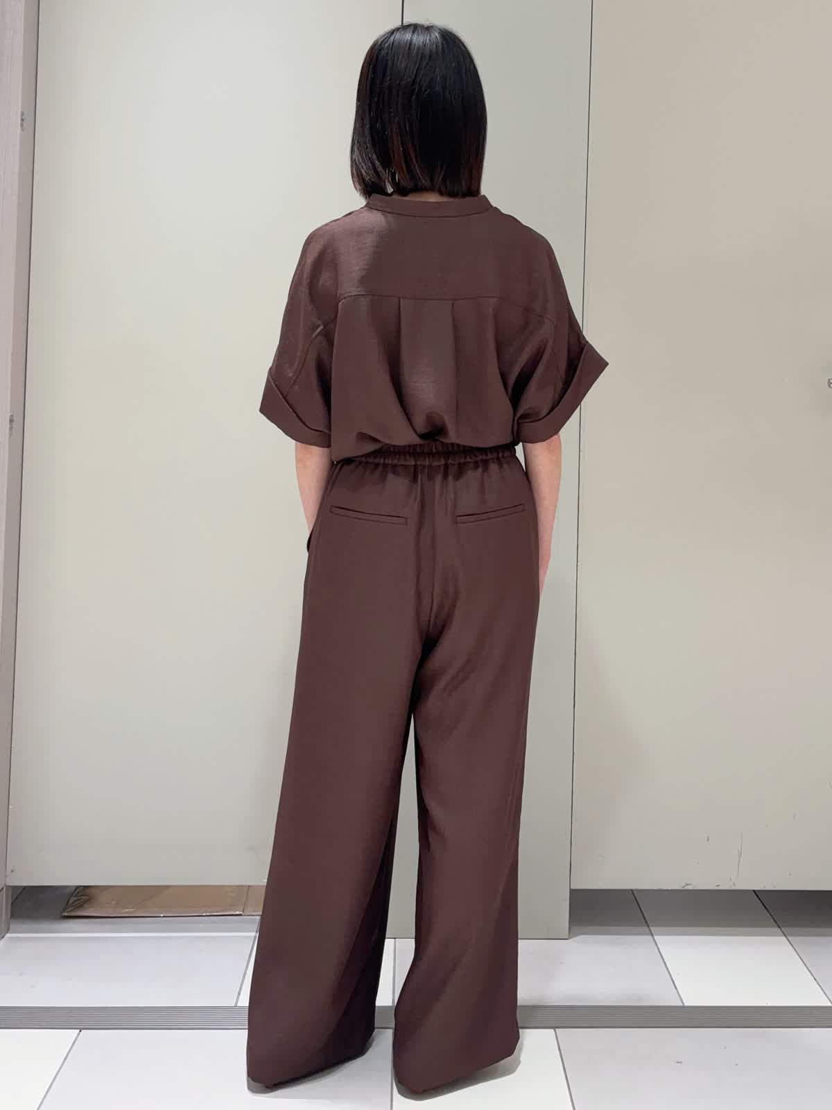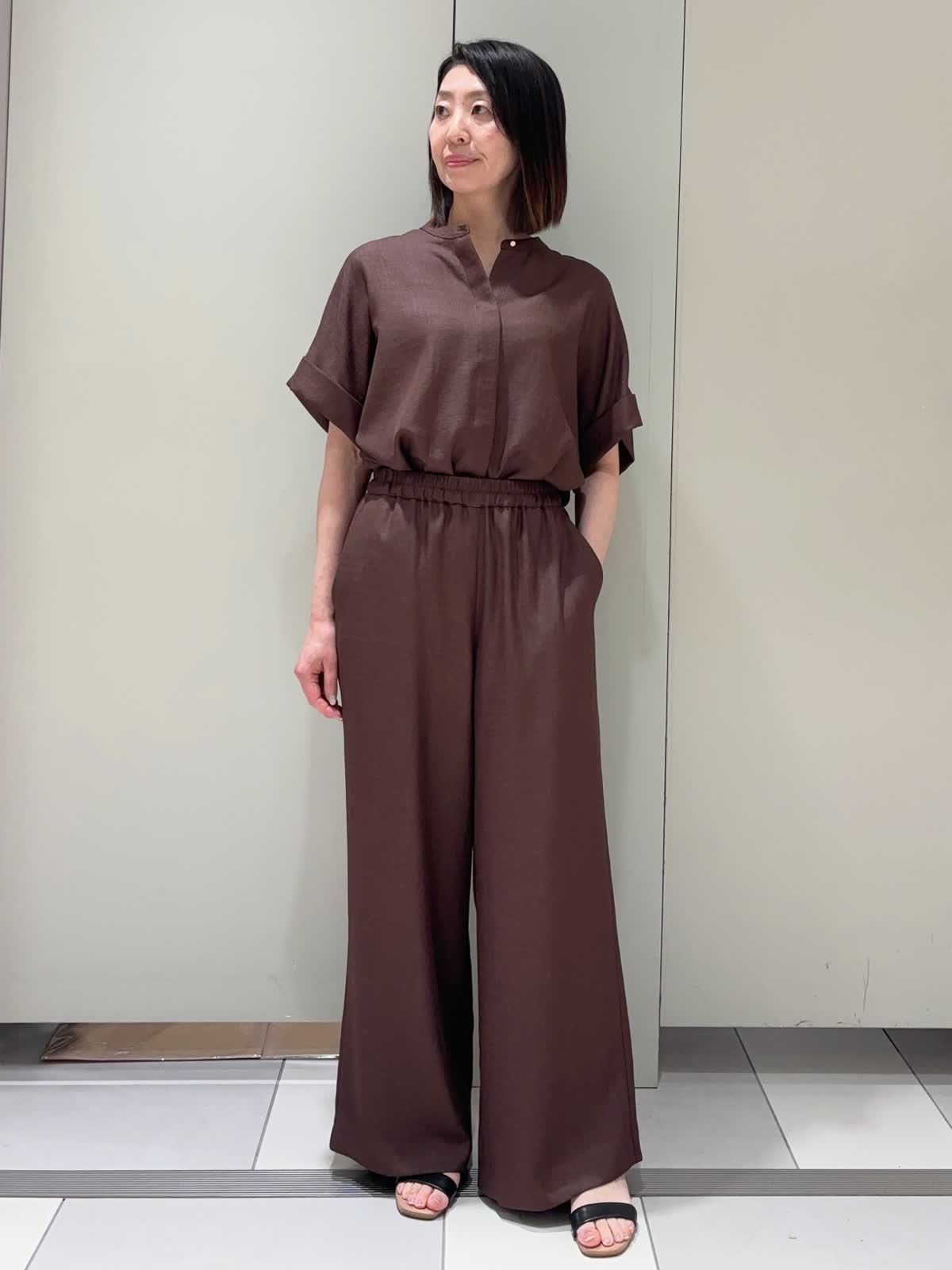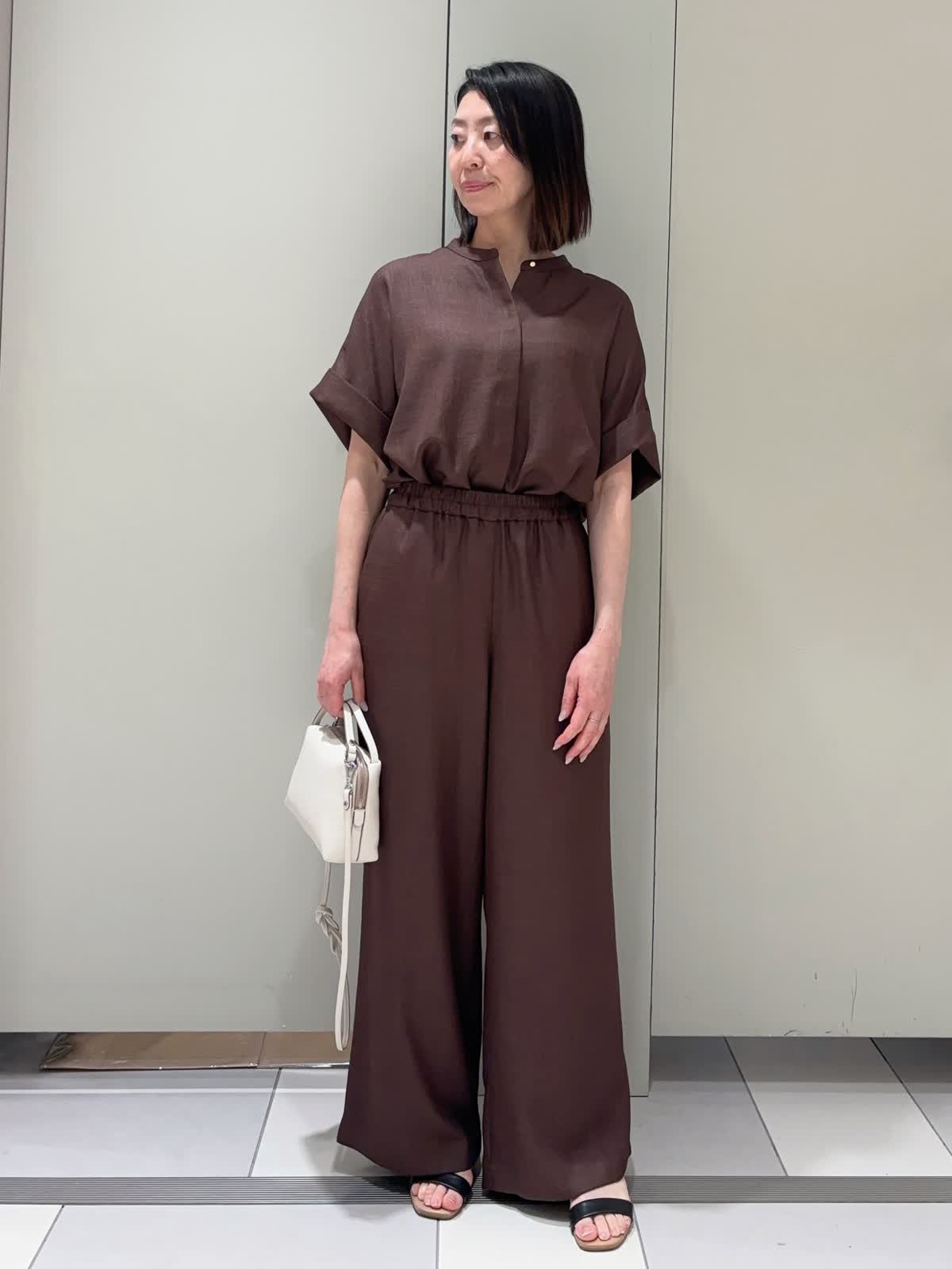 【着用サイズ】ブラウス:9号 パンツ:9号 【着用カラー】ブラウス:ブラウン パンツ:ブラウン バッグ:オフホワイト ポリエステル100%で麻のような風合いの素材。シワになりにくくさらっとした清涼感のある着心地。 ゆったりシルエットのブラウスと、程よいワイドパンツの組み合わせ。ほんのり光沢感がありきちんと感も演出できます。セットアップでの着用がおすすめです。