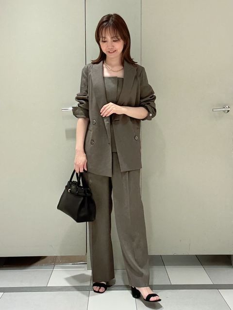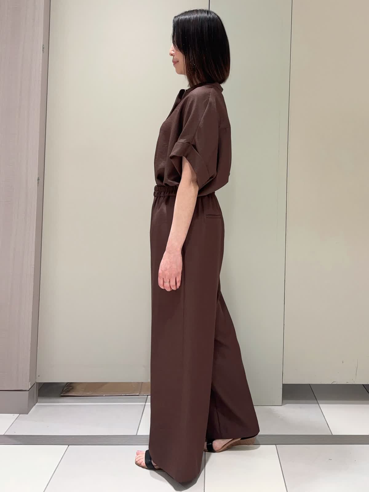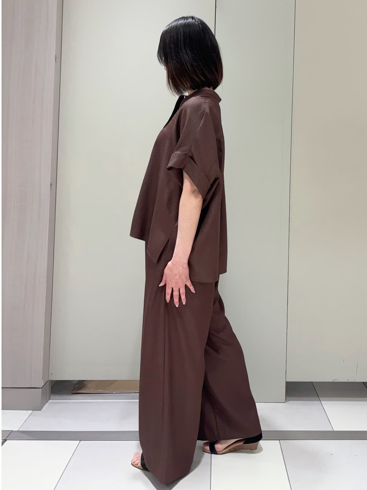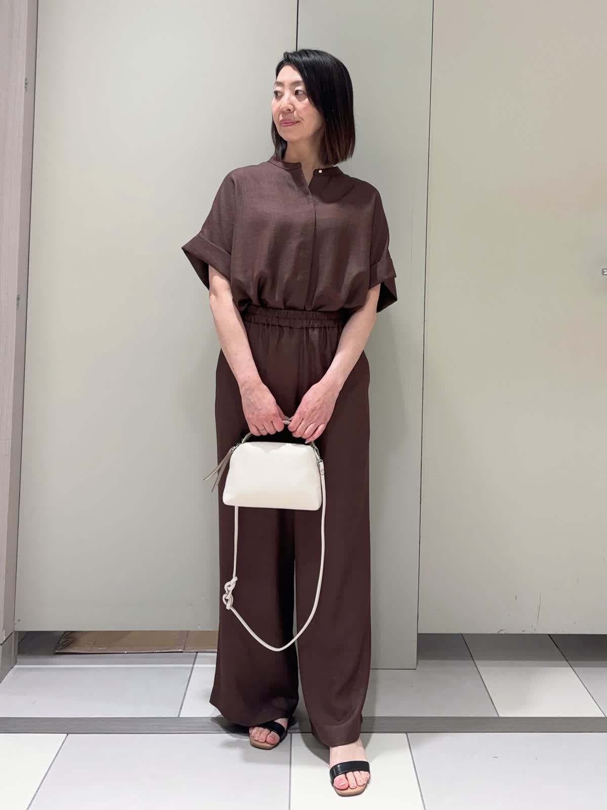 【着用サイズ】ブラウス:9号 パンツ:9号 【着用カラー】ブラウス:ブラウン パンツ:ブラウン バッグ:オフホワイト ポリエステル100%で麻のような風合いの素材。シワになりにくくさらっとした清涼感のある着心地。 ゆったりシルエットのブラウスと、程よいワイドパンツの組み合わせ。ほんのり光沢感がありきちんと感も演出できます。セットアップでの着用がおすすめです。