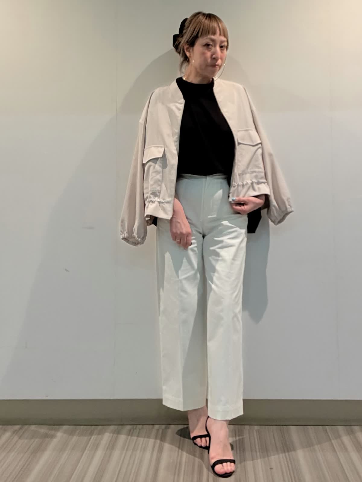 【着用サイズ?カラー】ブルゾン:フリー?ベージュ カットソー:フリー?ブラック パンツ:9号?ホワイト 清涼感のあるリネンライク素材を使用したジップブルゾン。インナーはマルチに活躍するクルーネックのロングTシャツ。紫外線対策に便利な肌離れの良いオーバーサイズで仕上げ!センタープレスで立体感を出したストレートパンツ。サイドの釦使いでウエストサイズの調節も可能といった機能的な要素も併せ持ったアイテムです!