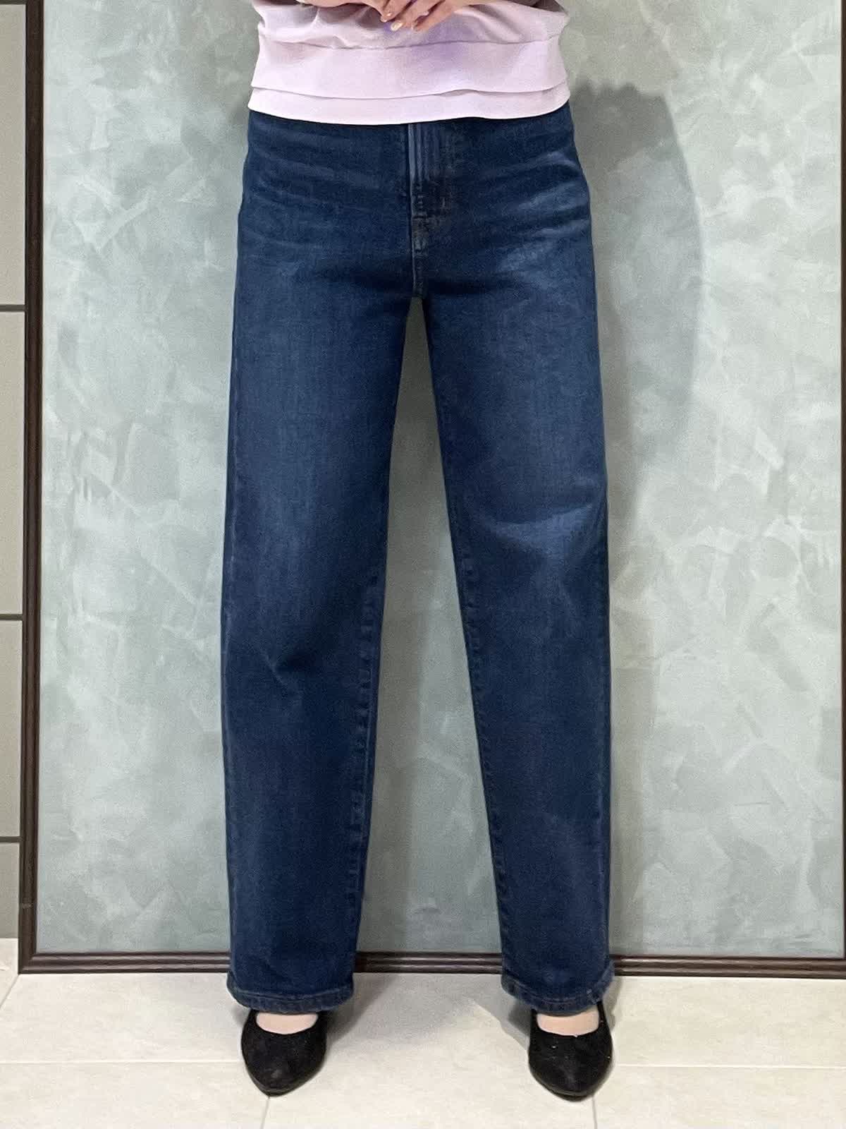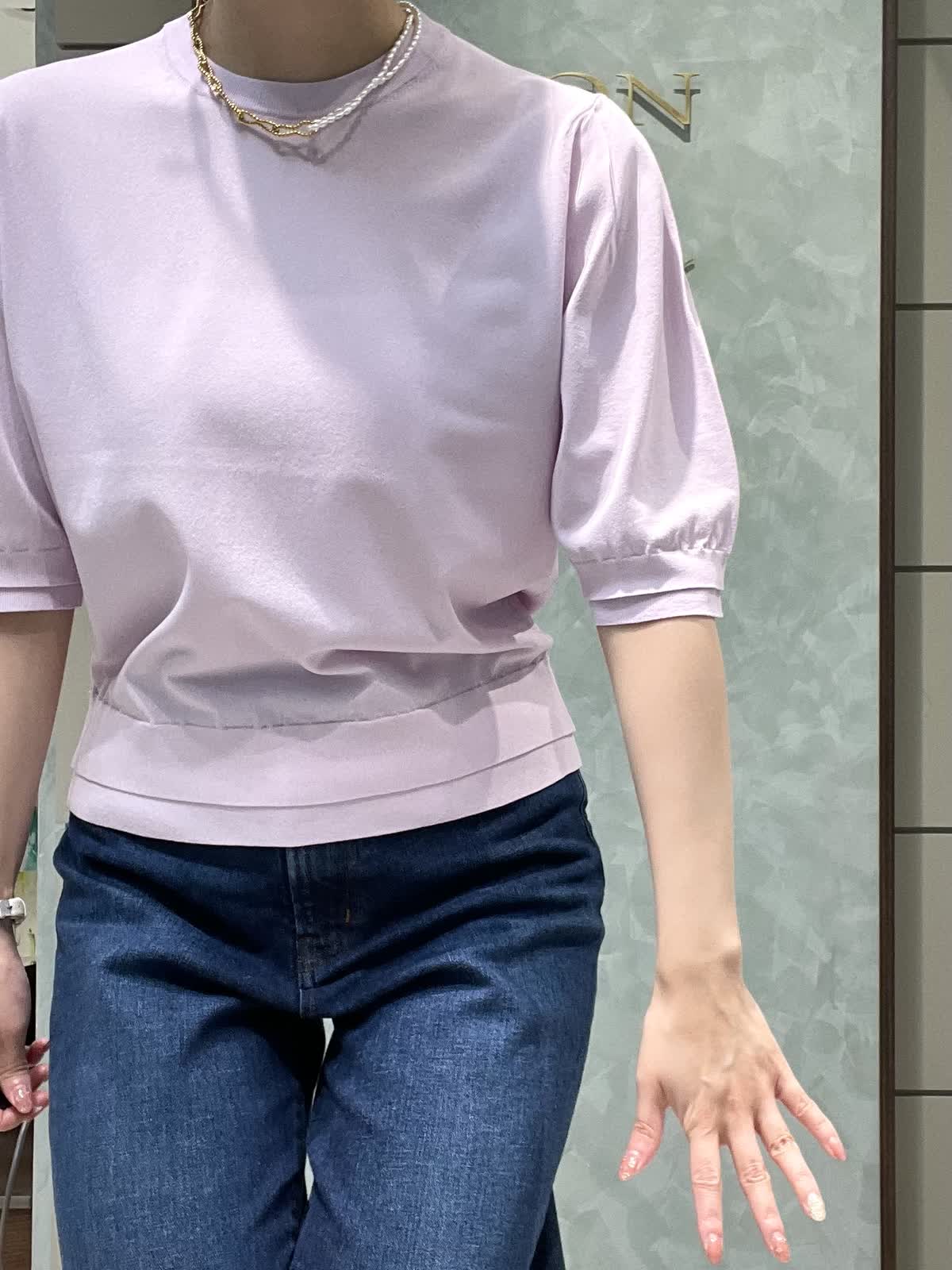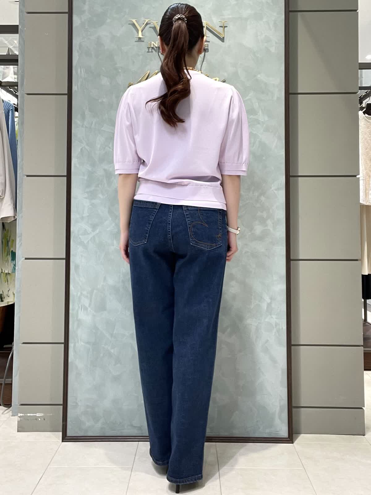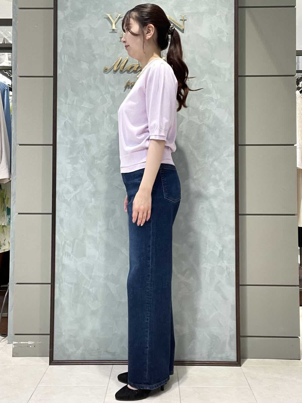 【着用サイズ】ニット:9号 パンツ:7号 シンプルで着やすいデイリースタイリングです。サラッと涼しいサマーニットはシワになりにくくイージーケアで楽なのでデイリーに大活躍!旅行にも◎袖口、裾が2段になっているのでシンプルすぎず1枚でオシャレに着れます。肘にかかる安心な袖丈、着丈はスッキリでパンツスカート選ばず合わせやすいです。透け感はそんなにないですが、薄手でラインは出やすいのでインナー着用をオススメします。カーヴィーデニムは、ストレッチがしっかり効いてるのでジャストのおサイズで選んで頂いて大丈夫です。ももから膝にかけて若干丸みのあるシルエットで、ももがスッキリ見えます。着丈は157センチでかかとくらいです。左右、後ろもポケットありです。