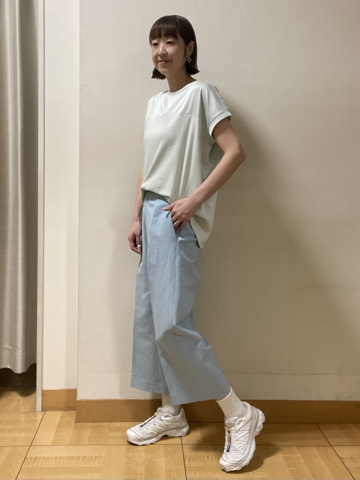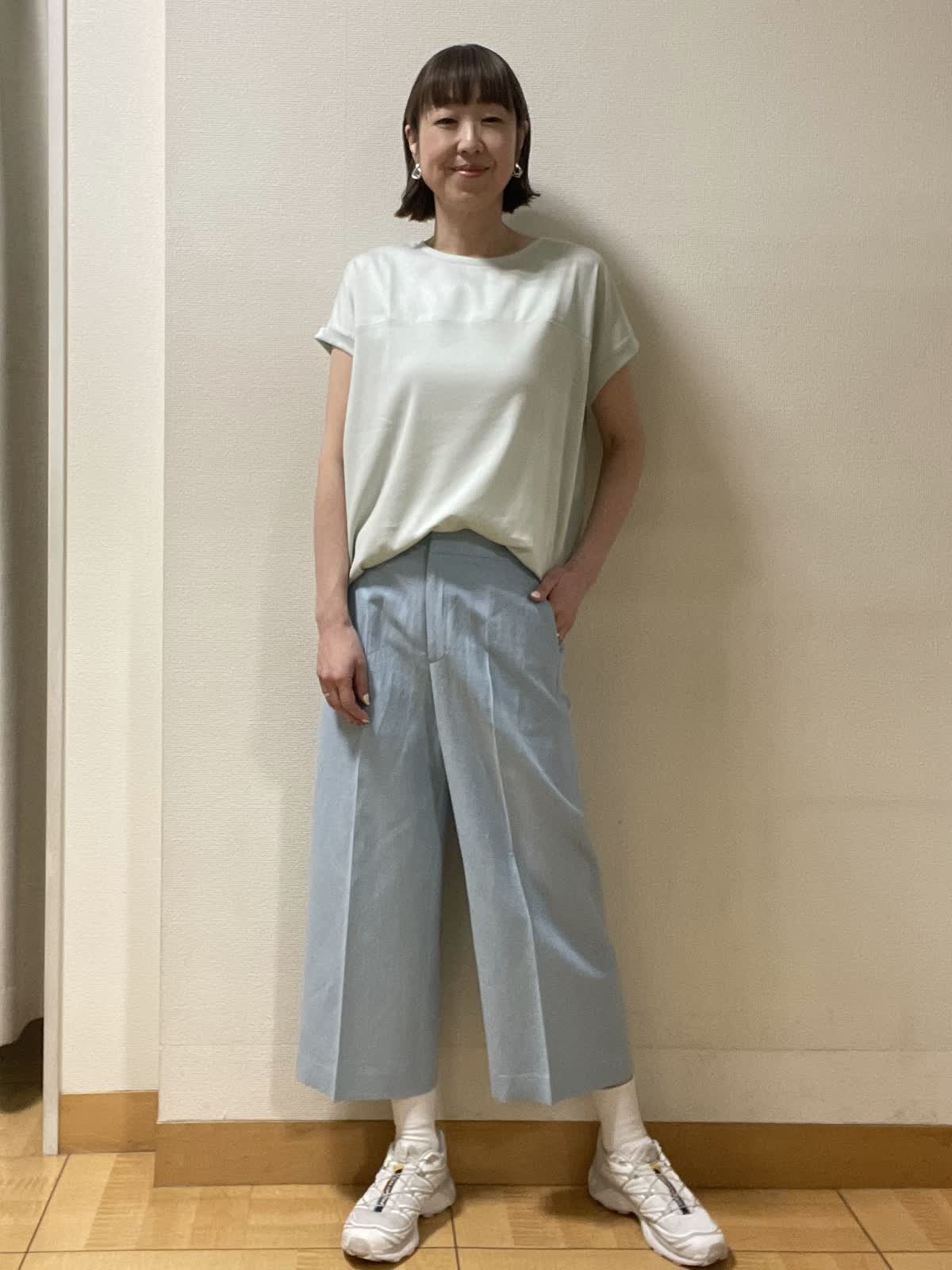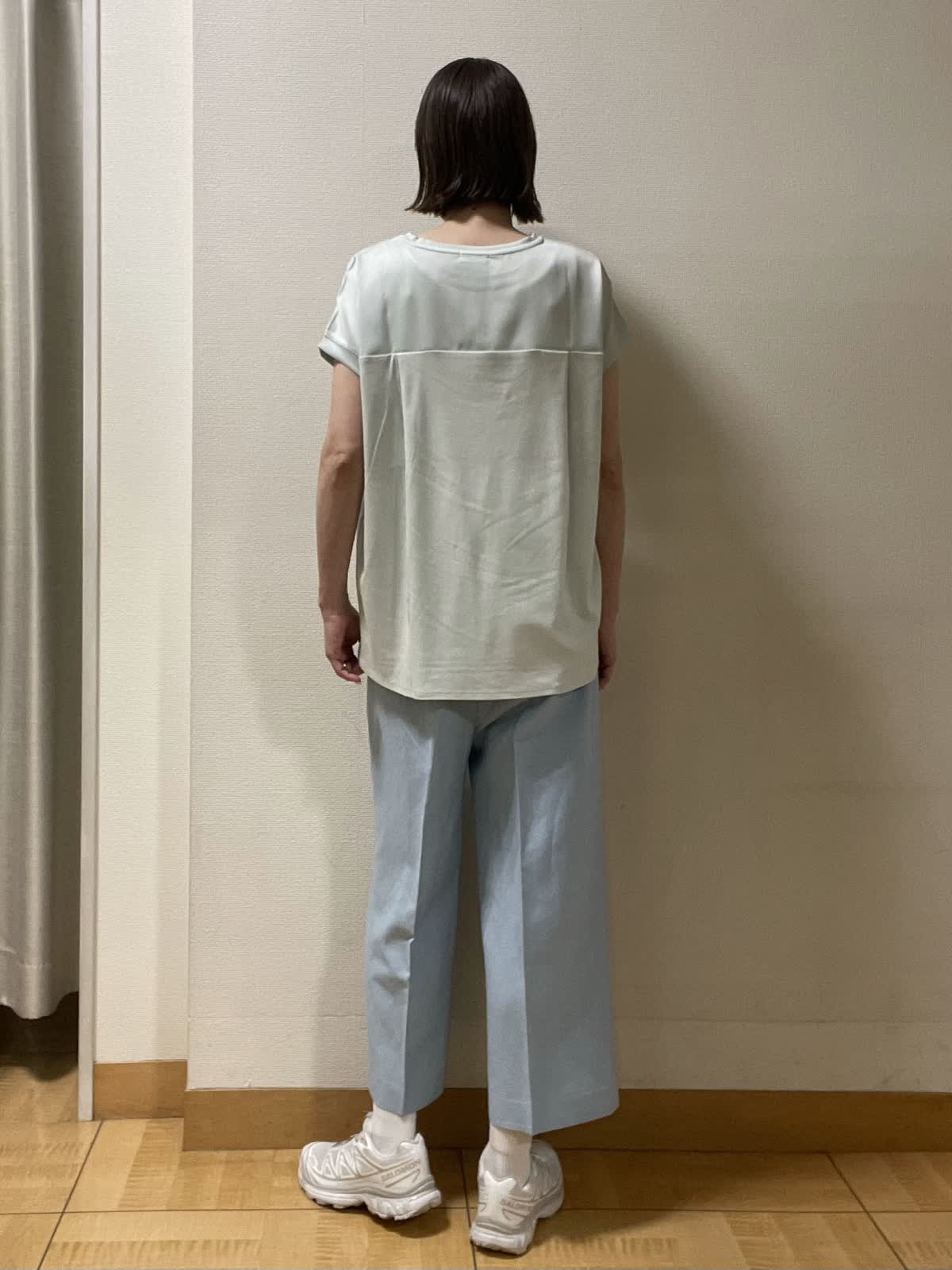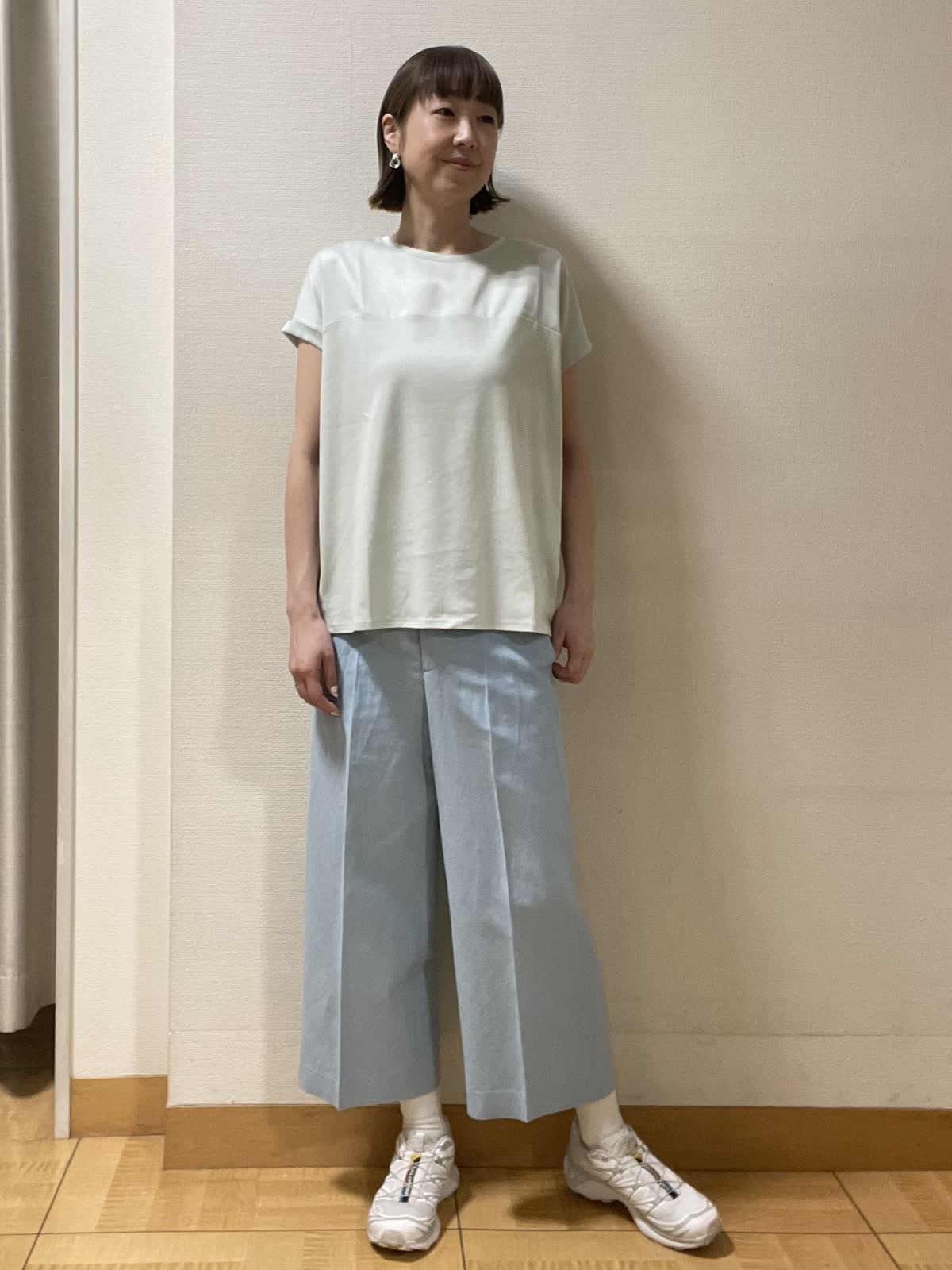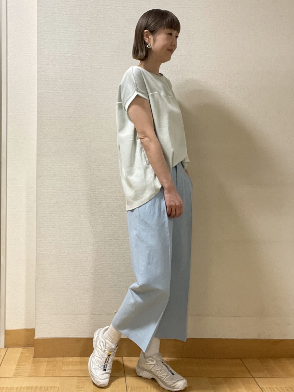 【着用サイズ】カットソー:フリー パンツ:9号【着用カラー】カットソー:ペパーミントグリーン パンツ:サックス 今から夏まで涼しく着られるカットソー。インしてウエストまわりをスッキリ着るのもおすすめ!カラー違いで揃えたくなるカットソーです。