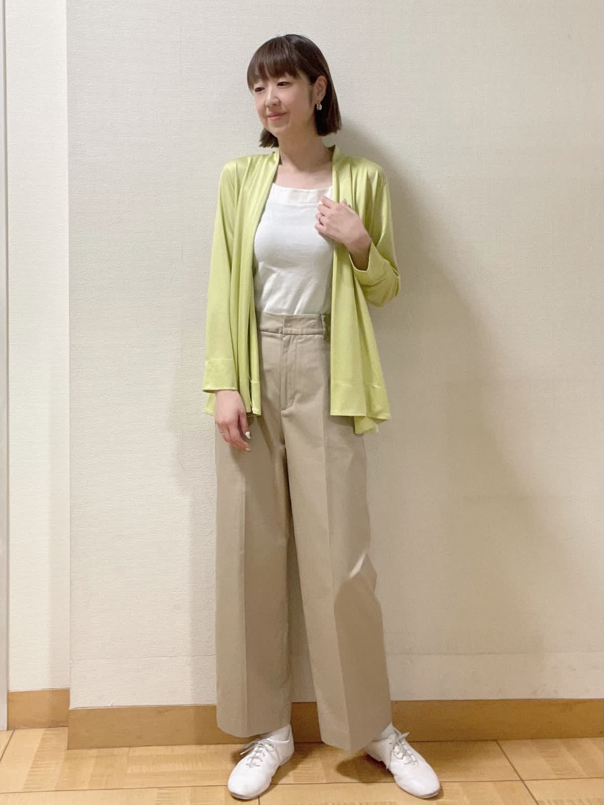 【着用サイズ】全て9号【着用カラー】カーディガン:キミドリ カットソー:ホワイト パンツ:キャメル サラサラした素材で着心地の良いカーディガン。インナーをタンクトップにして涼しく軽やかな印象に。オフィスカジュアルスタイルにおすすめです。