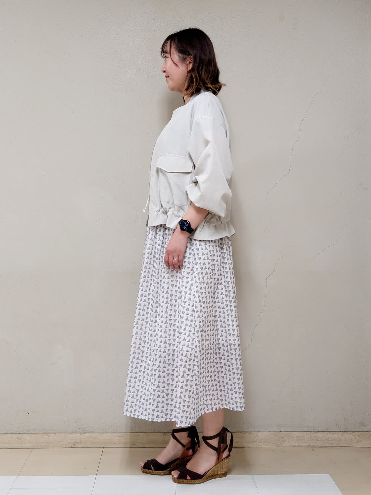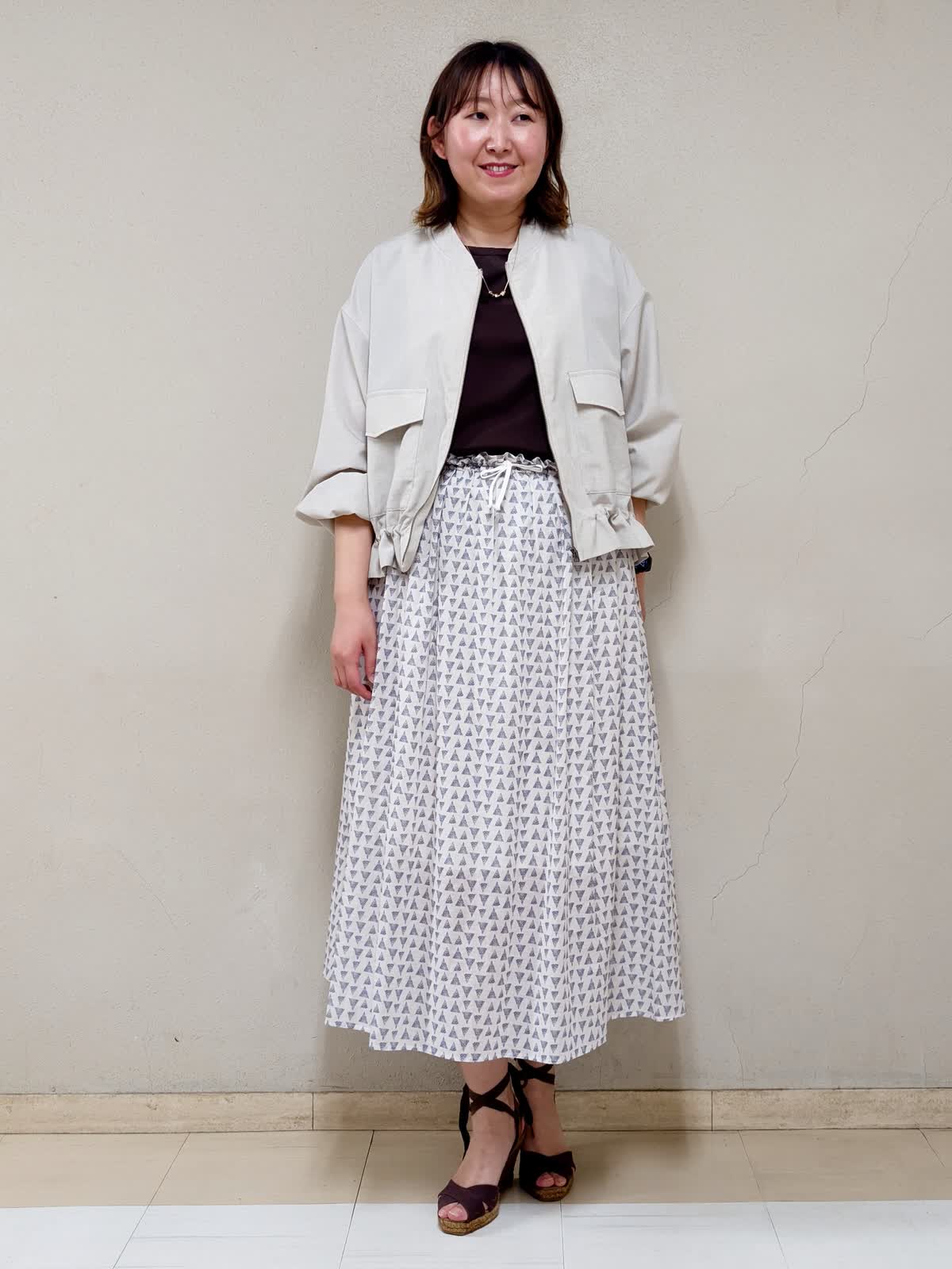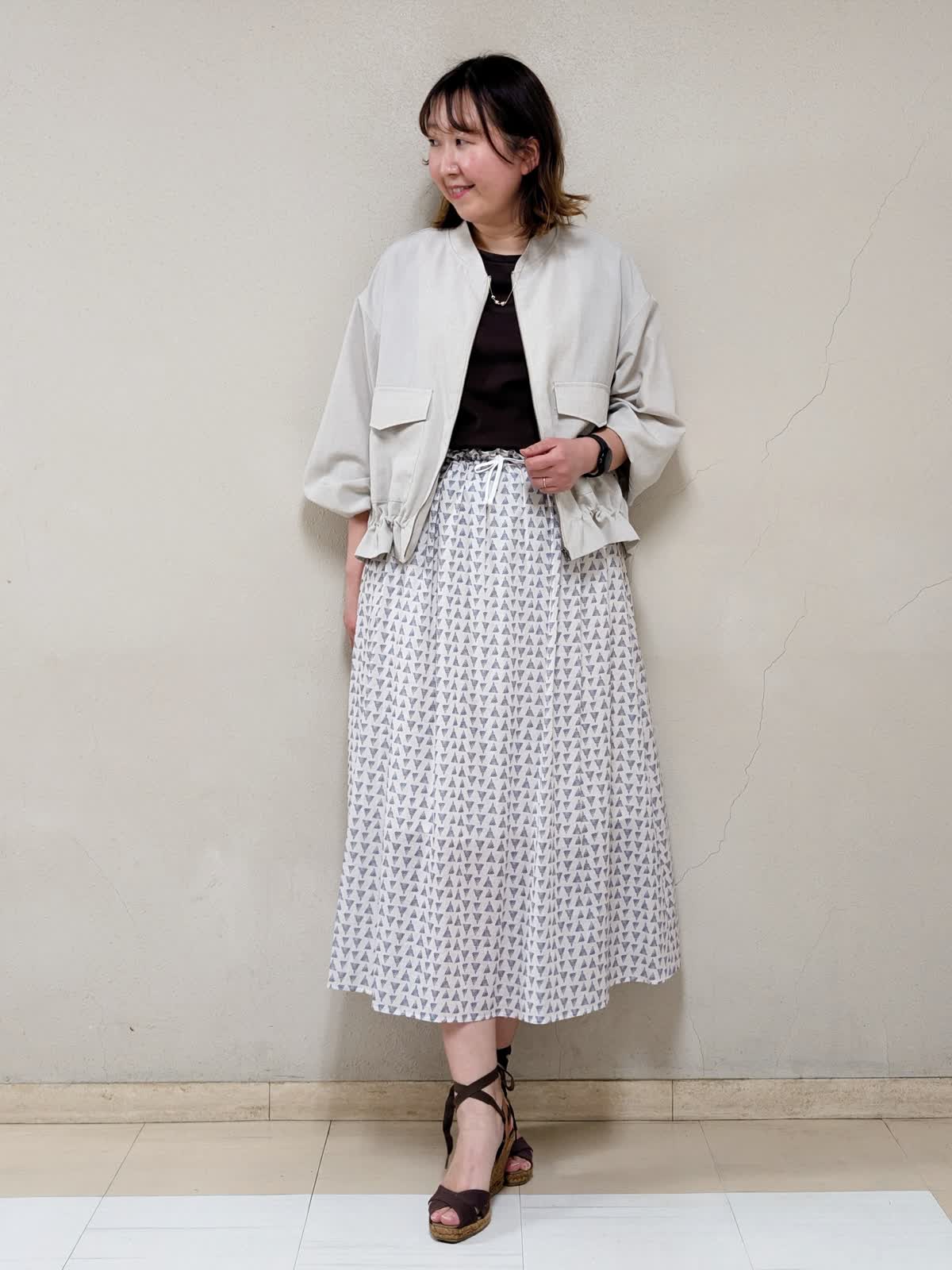 【着用サイズ】全て:フリー【着用カラー】ブルゾン:ベージュ カットソー:ブラウン スカート:アイボリー 春から初夏にかけてのお出かけコーディネートです。季節の変わり目、日中は暑いけれども朝晩は肌寒い、そんな季節にオススメの羽織りです。リネン風のブルゾンはポリエステル素材でシワになりにくいのでバッグの中に入れておいても安心です。裾のギャザーでアレンジが効くので、雰囲気を変えて着ていただけます。インナーのカットソーは胸元のサテン切替が上品。スカートはガーゼのような軽い素材で涼しいです。