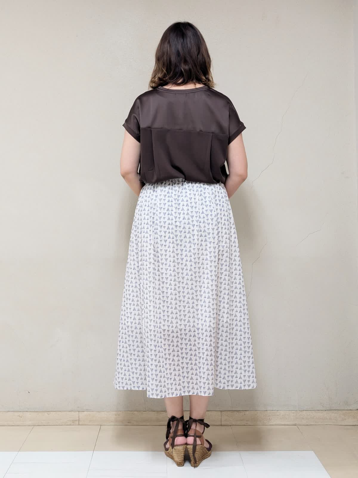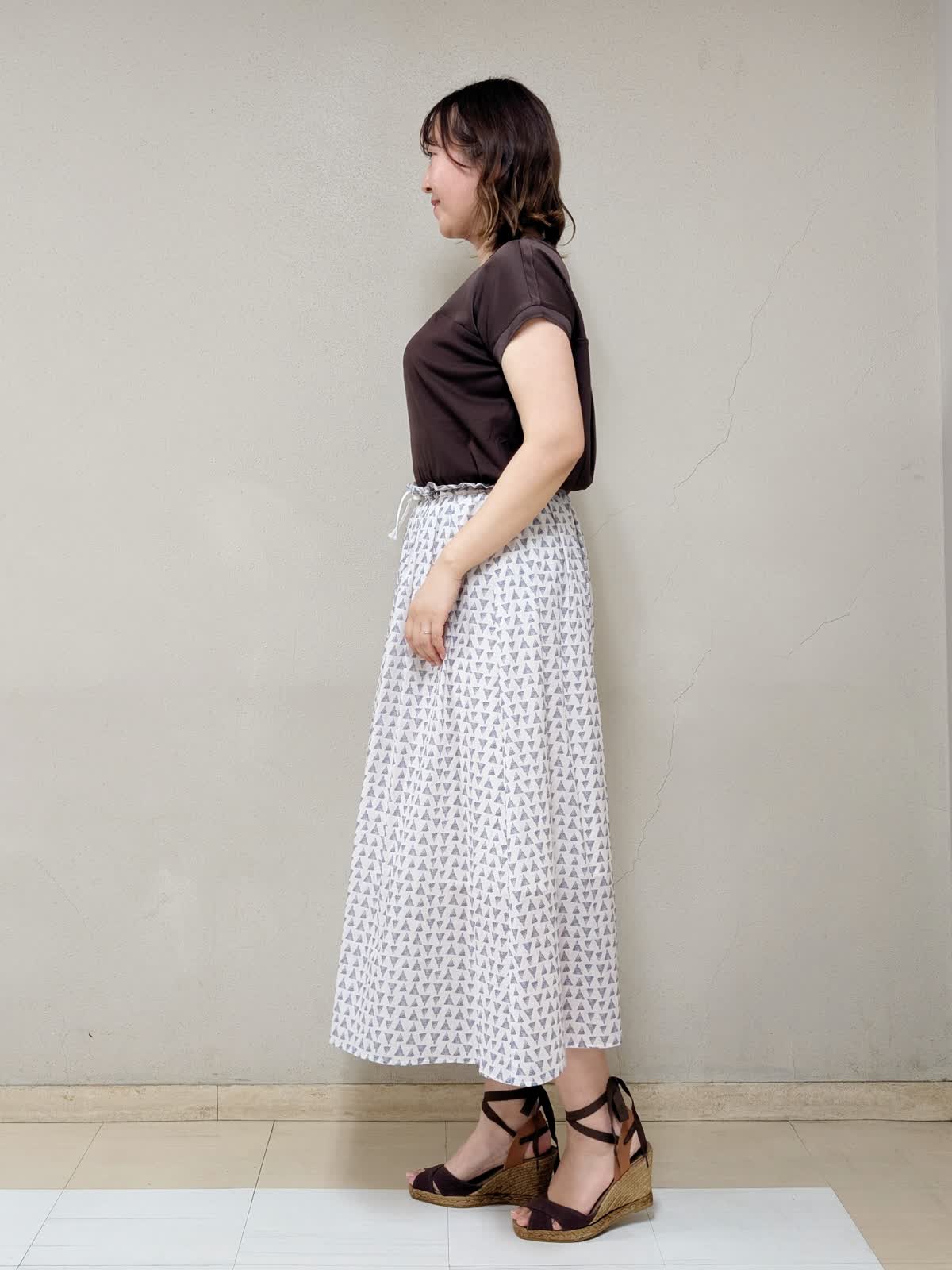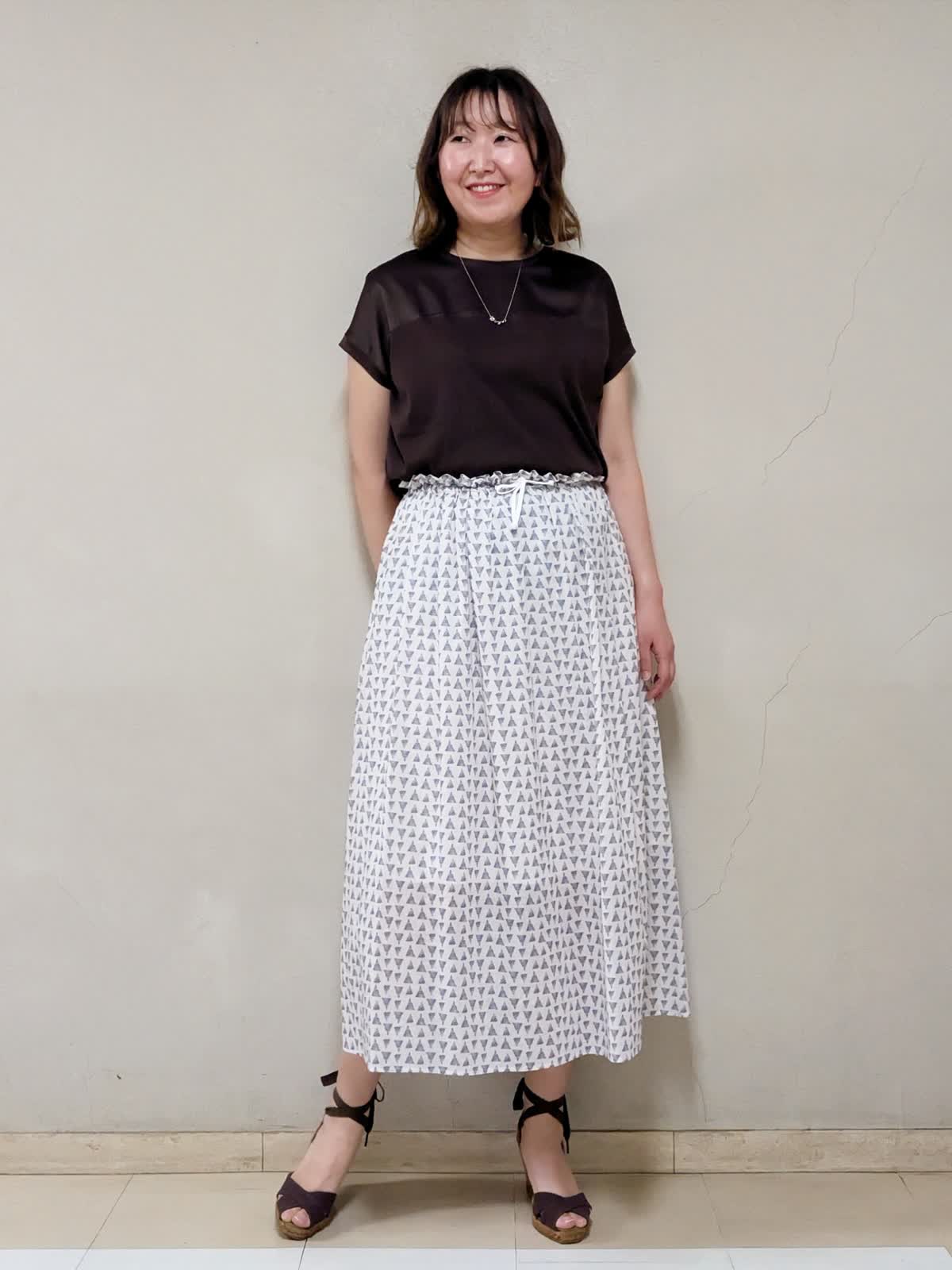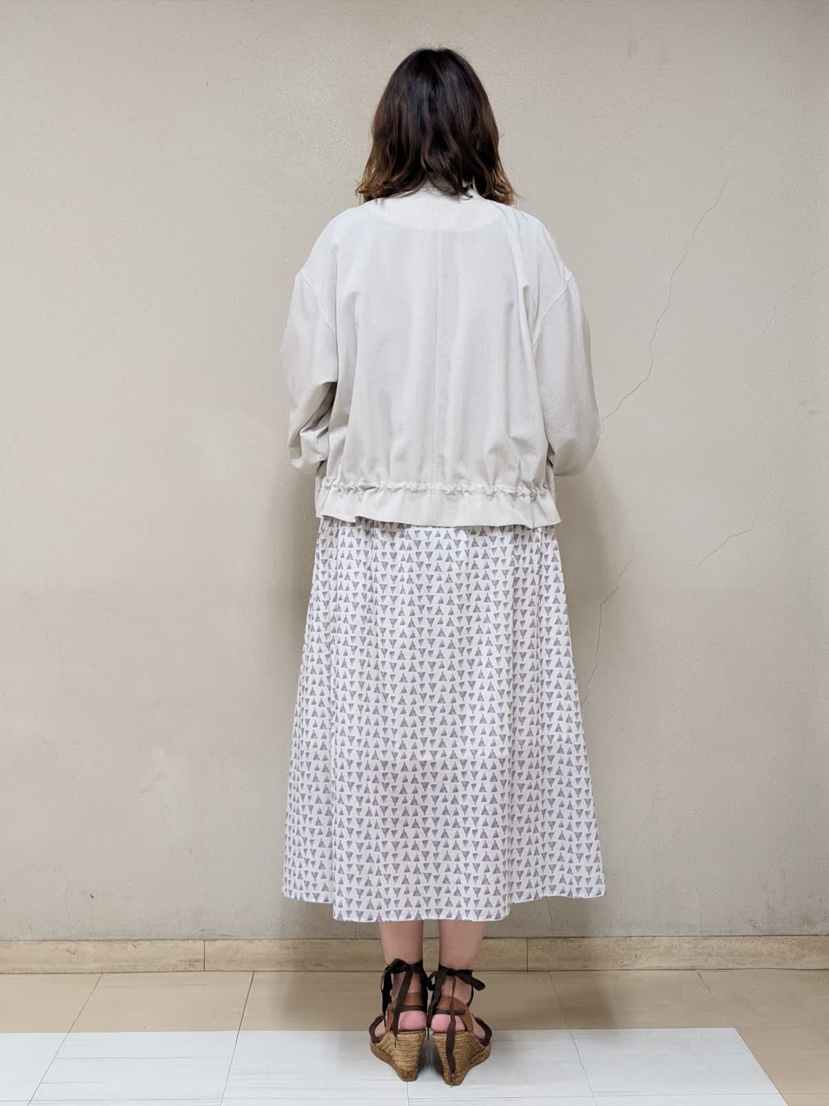 【着用サイズ】全て:フリー【着用カラー】ブルゾン:ベージュ カットソー:ブラウン スカート:アイボリー 春から初夏にかけてのお出かけコーディネートです。季節の変わり目、日中は暑いけれども朝晩は肌寒い、そんな季節にオススメの羽織りです。リネン風のブルゾンはポリエステル素材でシワになりにくいのでバッグの中に入れておいても安心です。裾のギャザーでアレンジが効くので、雰囲気を変えて着ていただけます。インナーのカットソーは胸元のサテン切替が上品。スカートはガーゼのような軽い素材で涼しいです。