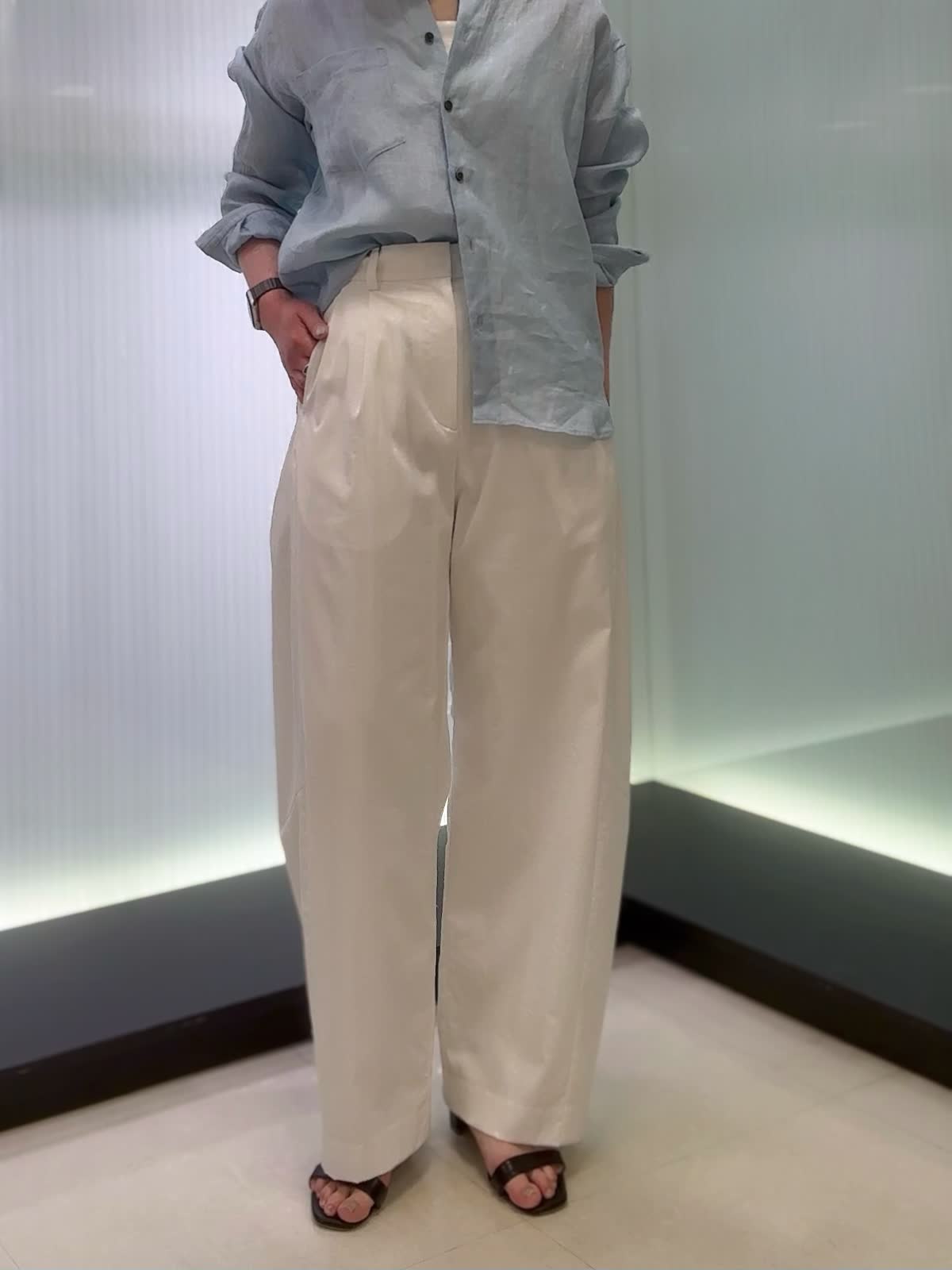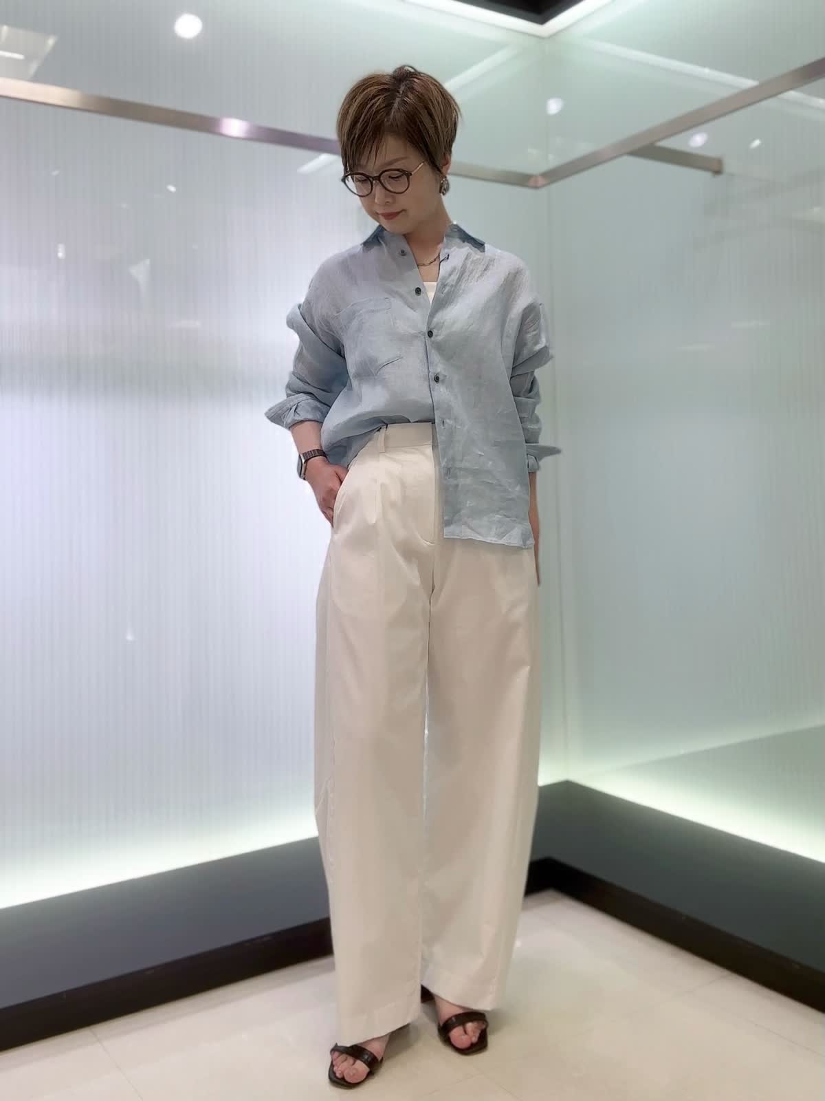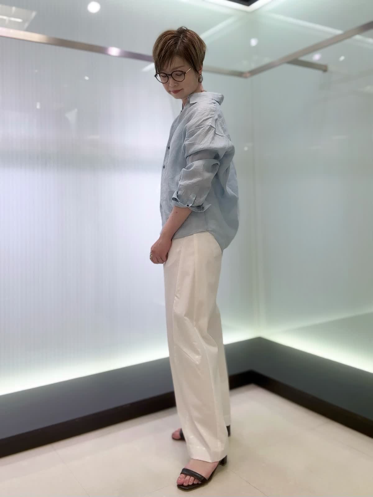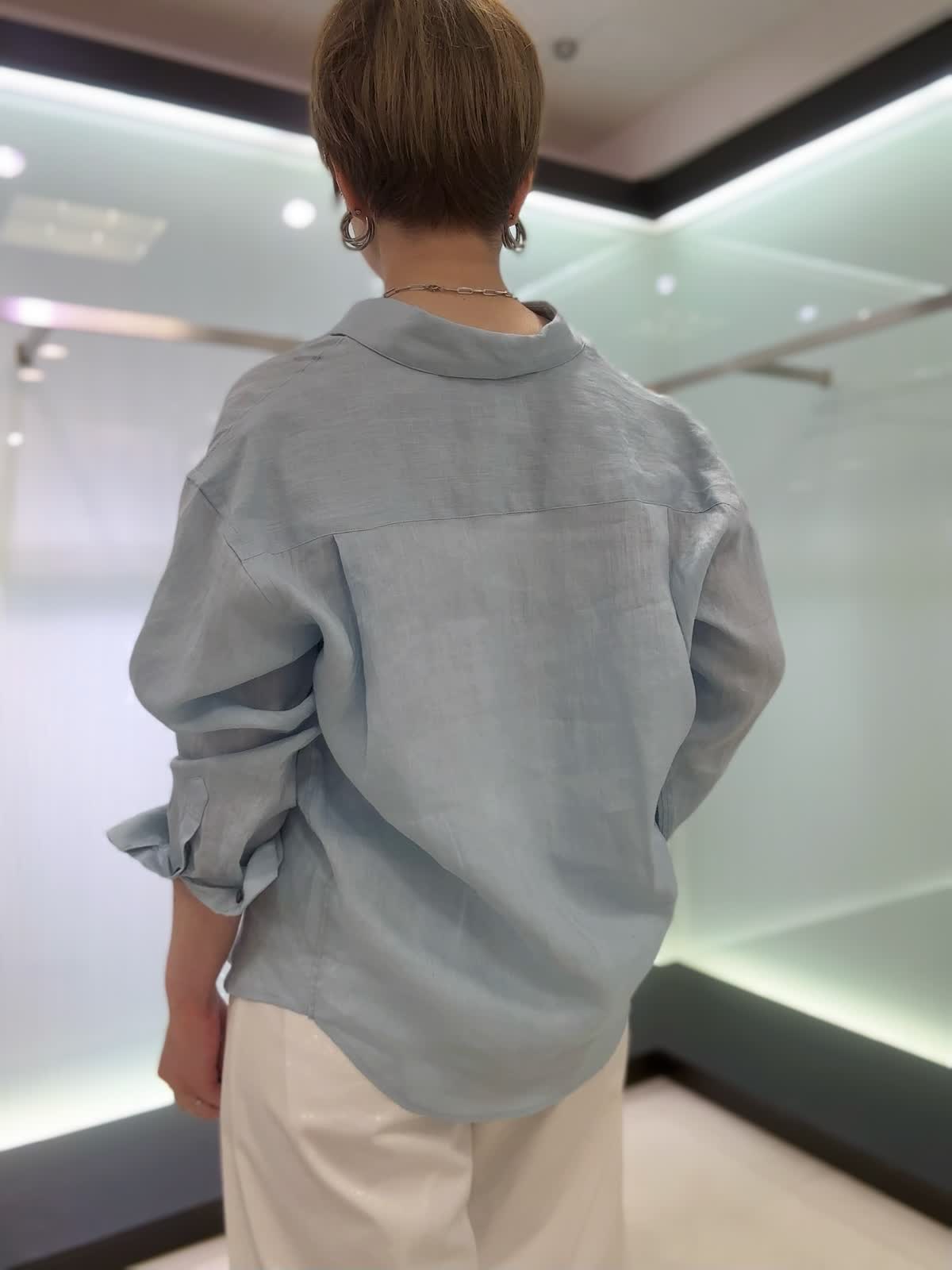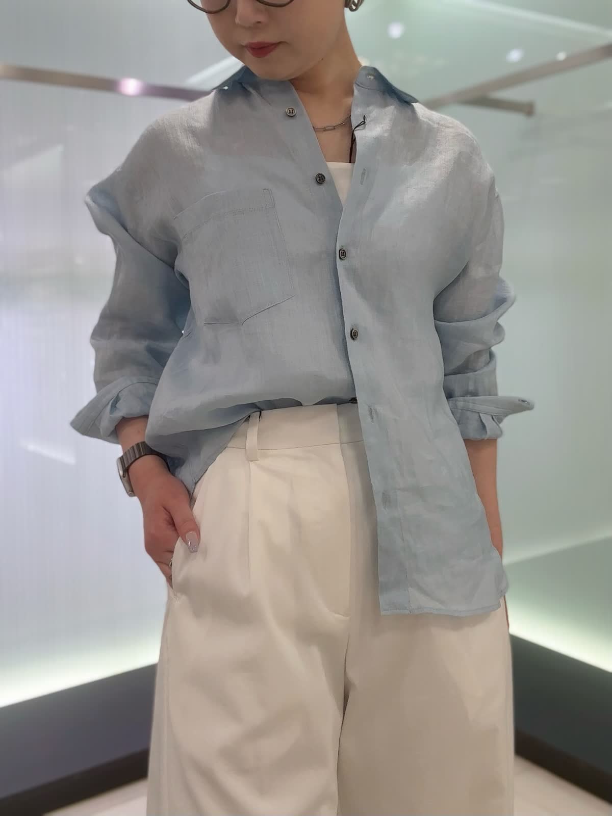 【着用カラー・サイズ】シャツ : サックス/9号 パンツ : オフホワイト/9号 人気のリネンシャツ。1枚でさらっと着るのはもちろん、羽織りとしても使えるので、さまざまな着こなしが楽しめます。着回し力が高く、季節の変わり目にも活躍する1枚です。