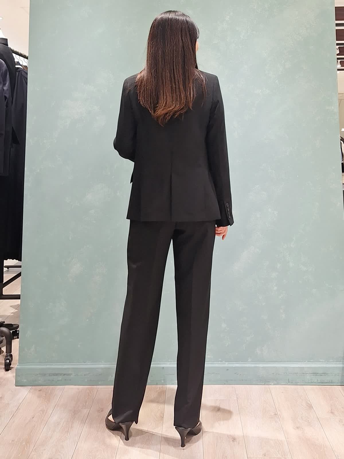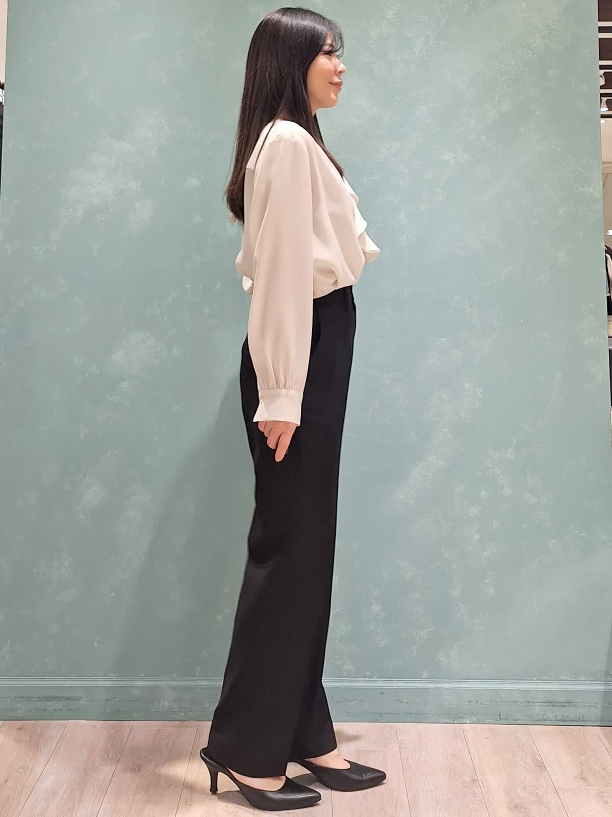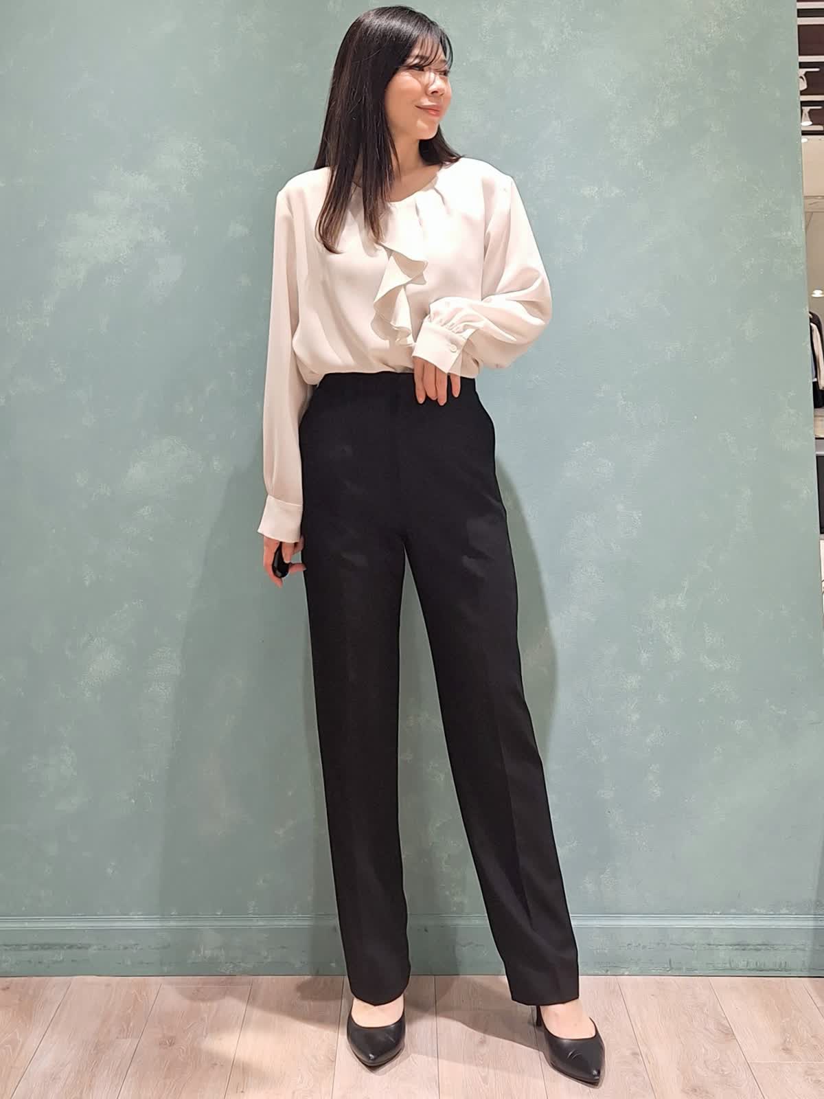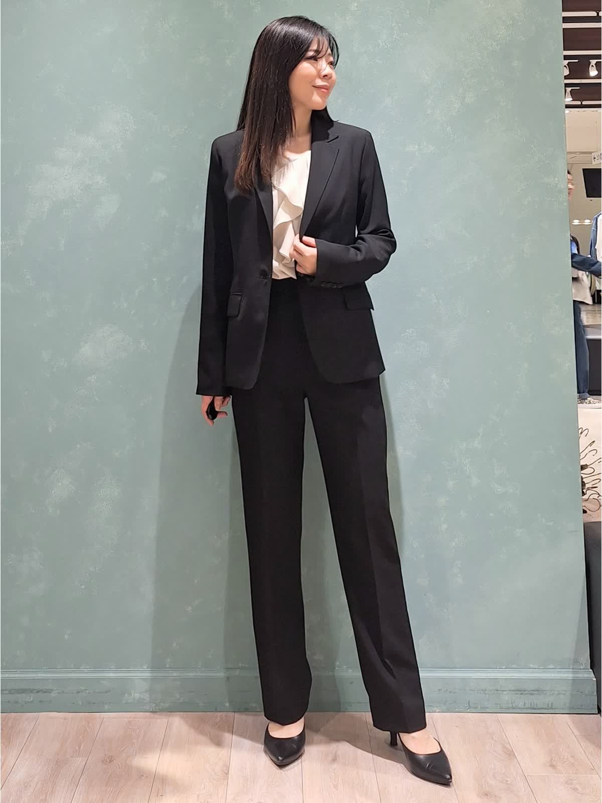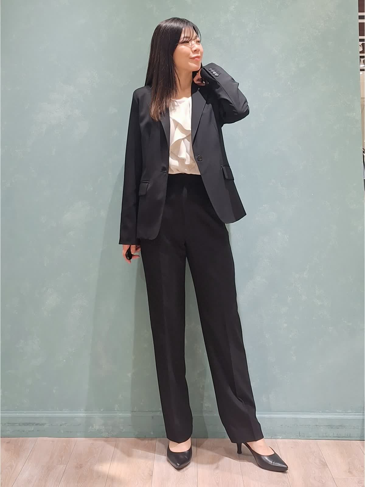 【着用サイズ、カラー】ジャケット、パンツ:7号、ブラック ブラウス:9号、アイボリー 一着は持って置きたい、ブラックスーツ。INEDのオゾン防縮加工スーツは上質な生地できちんと感があり、様々なシーンでお召しいただけます。ジャケットはフロントボタンを少し高めの位置にする事で胸元の開きが抑えられ、シャープなラインで着ていただけて、ウエストの括れもしっかり出来ます。裏地は背抜きなので暑苦しくなく、軽い着心地です。パンツはセンタープレスのテーパードパンツ。ハイウエストで足長見え効果大!スタイルUPが叶うスーツです。インナーはフリルブラウスで女性らしさをプラスしました。ぜひチェックしてみて下さいね!