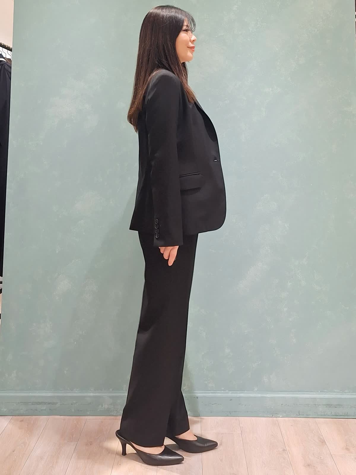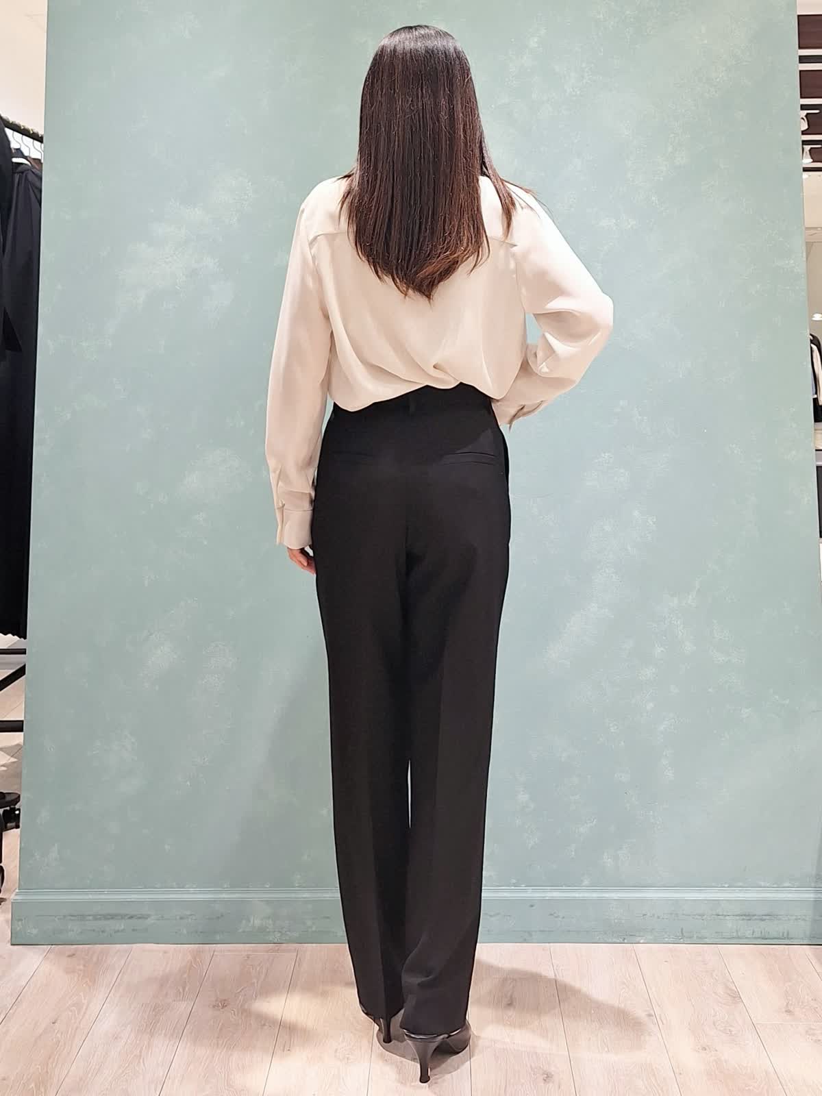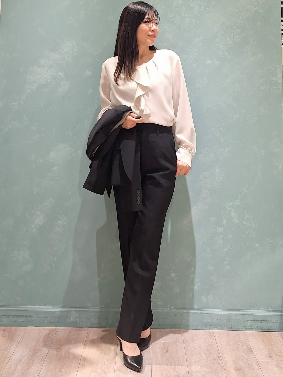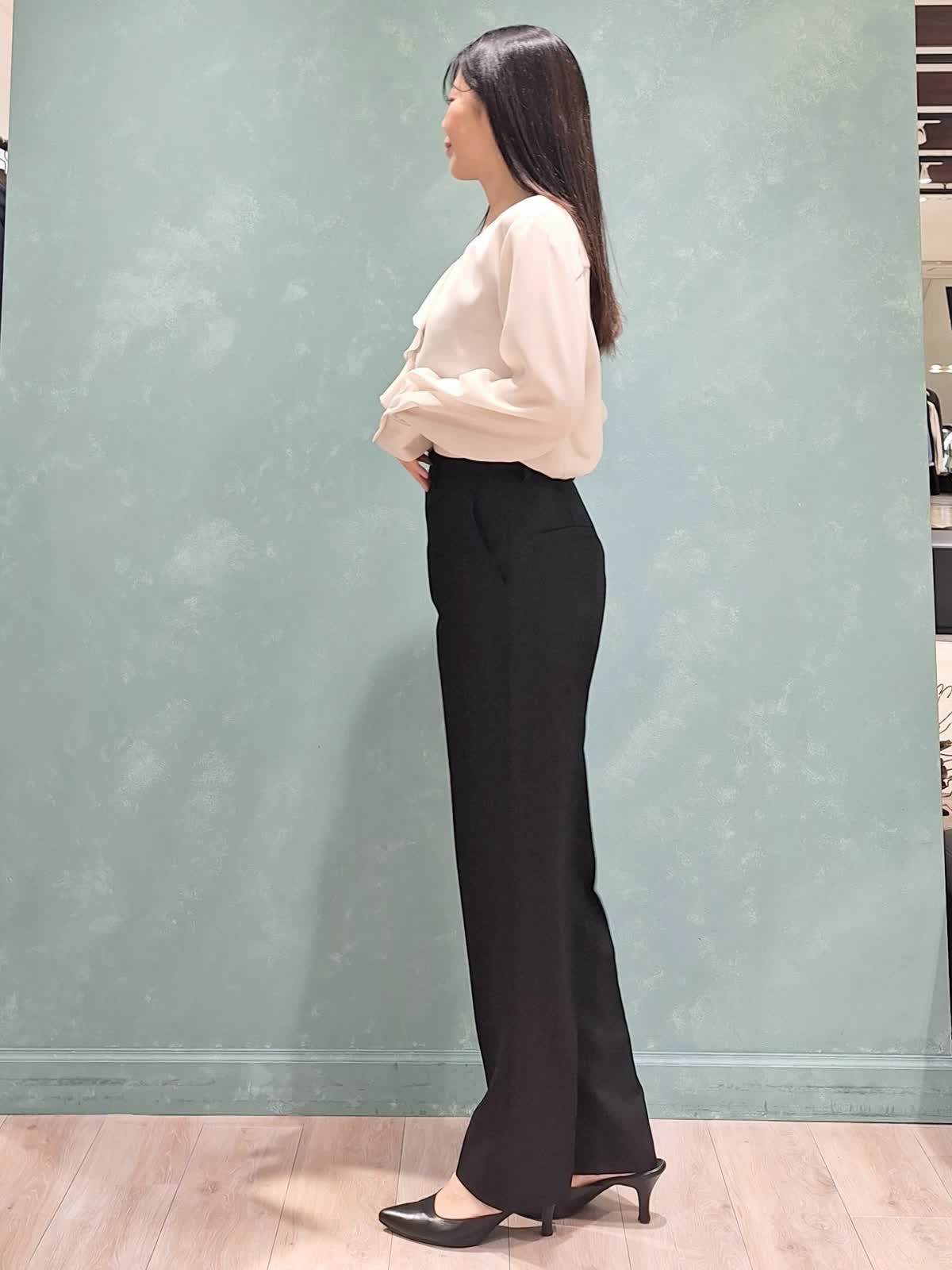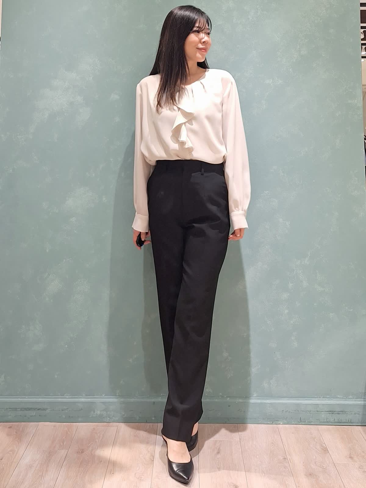 【着用サイズ、カラー】ジャケット、パンツ:7号、ブラック ブラウス:9号、アイボリー 一着は持って置きたい、ブラックスーツ。INEDのオゾン防縮加工スーツは上質な生地できちんと感があり、様々なシーンでお召しいただけます。ジャケットはフロントボタンを少し高めの位置にする事で胸元の開きが抑えられ、シャープなラインで着ていただけて、ウエストの括れもしっかり出来ます。裏地は背抜きなので暑苦しくなく、軽い着心地です。パンツはセンタープレスのテーパードパンツ。ハイウエストで足長見え効果大!スタイルUPが叶うスーツです。インナーはフリルブラウスで女性らしさをプラスしました。ぜひチェックしてみて下さいね!