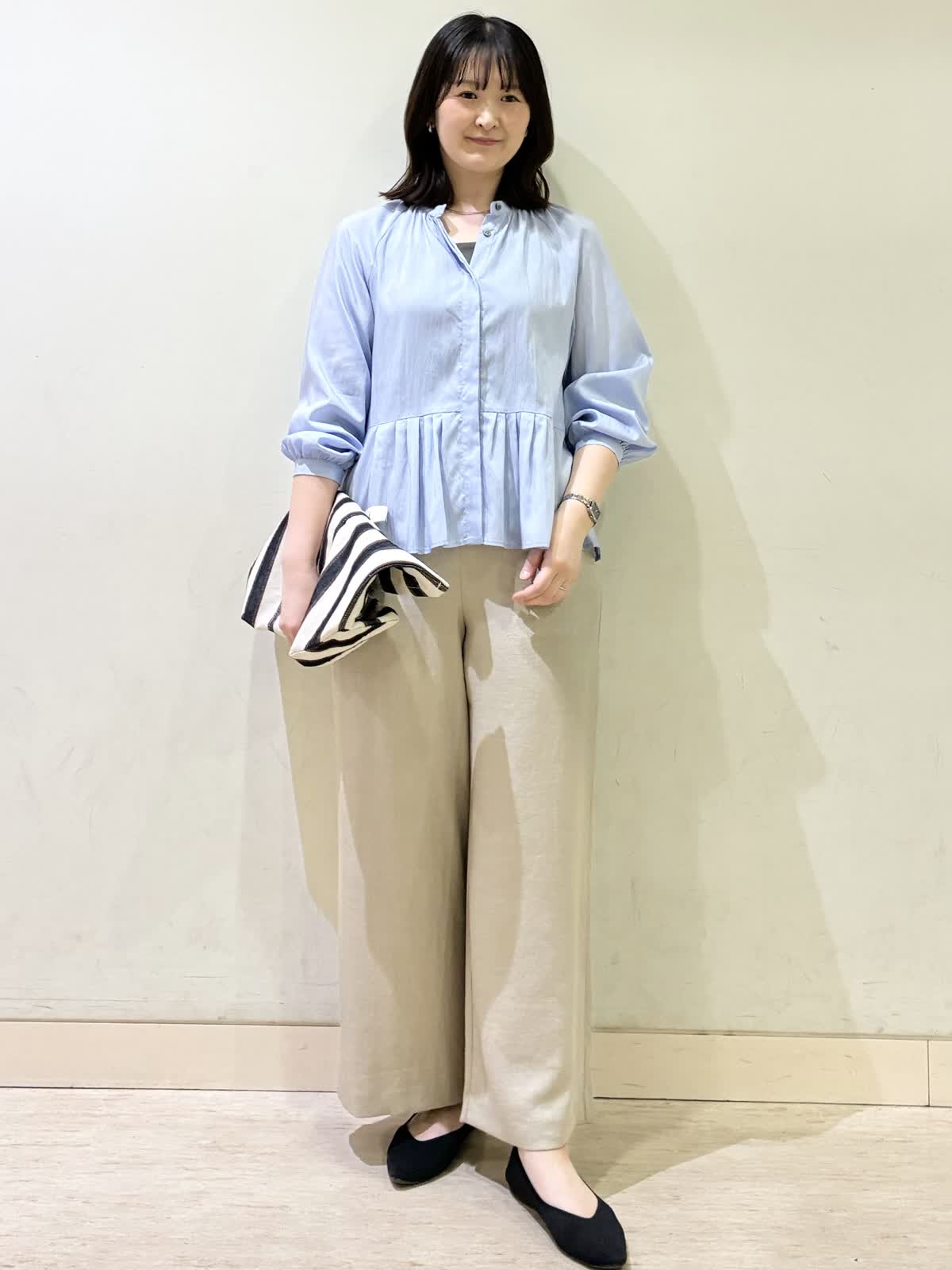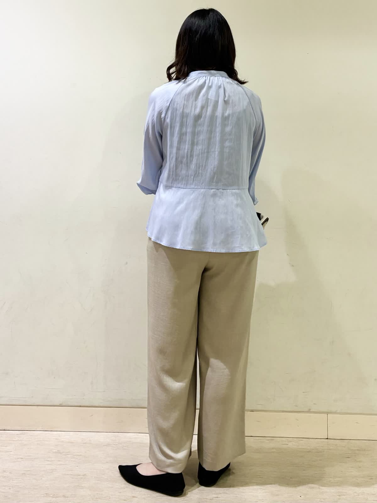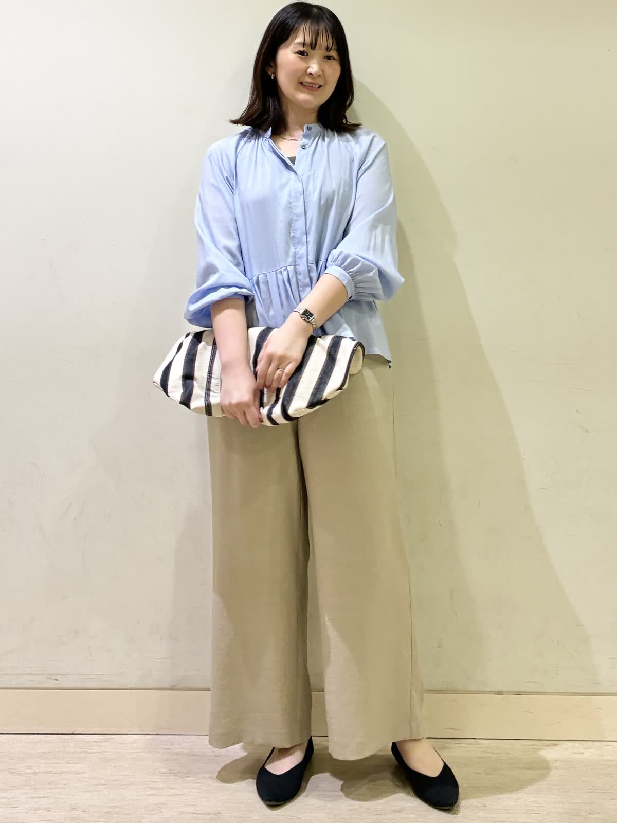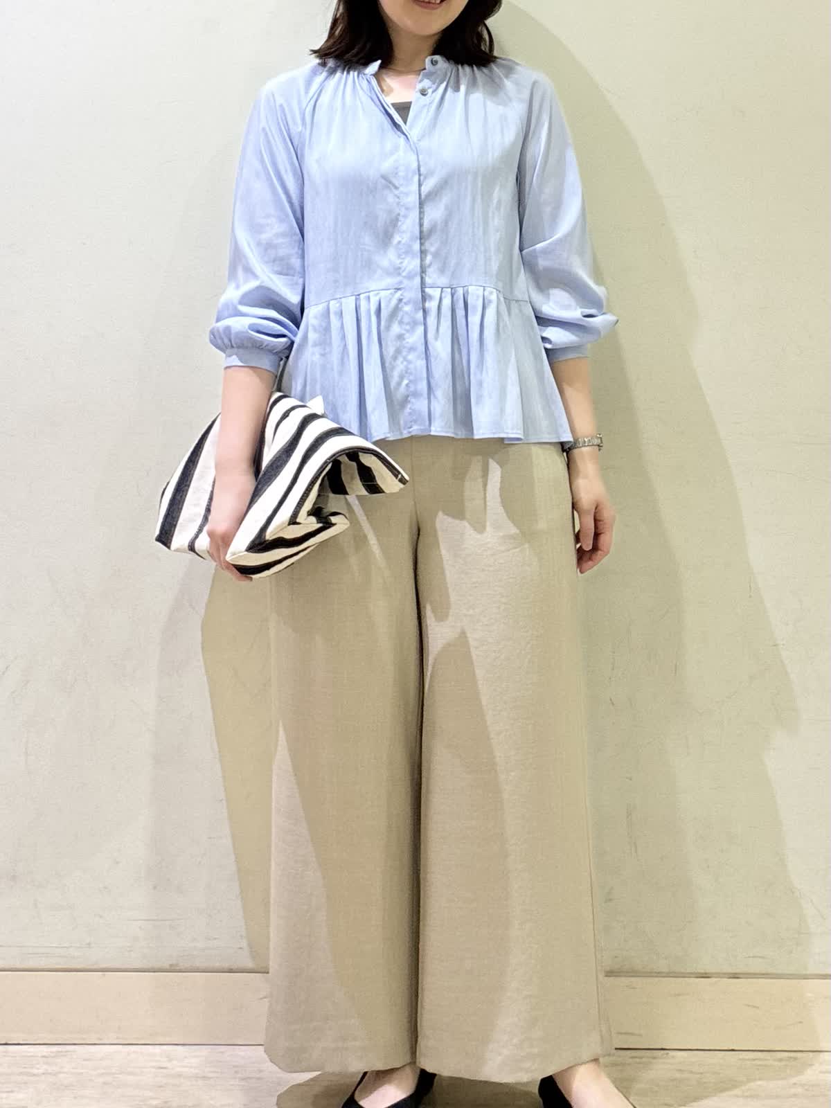 【着用カラー/サイズ】ブラウス:サックス/フリー パンツ:ベージュ/11号 休日おでかけコーデ。ブラウスは薄手の滑らかな肌触りで、着ていてとても気持ちのいい素材です。ウエストから広がるデザインがヒップをカバーしてくれて、骨格ウェーブさんに特に似合うデザインです。