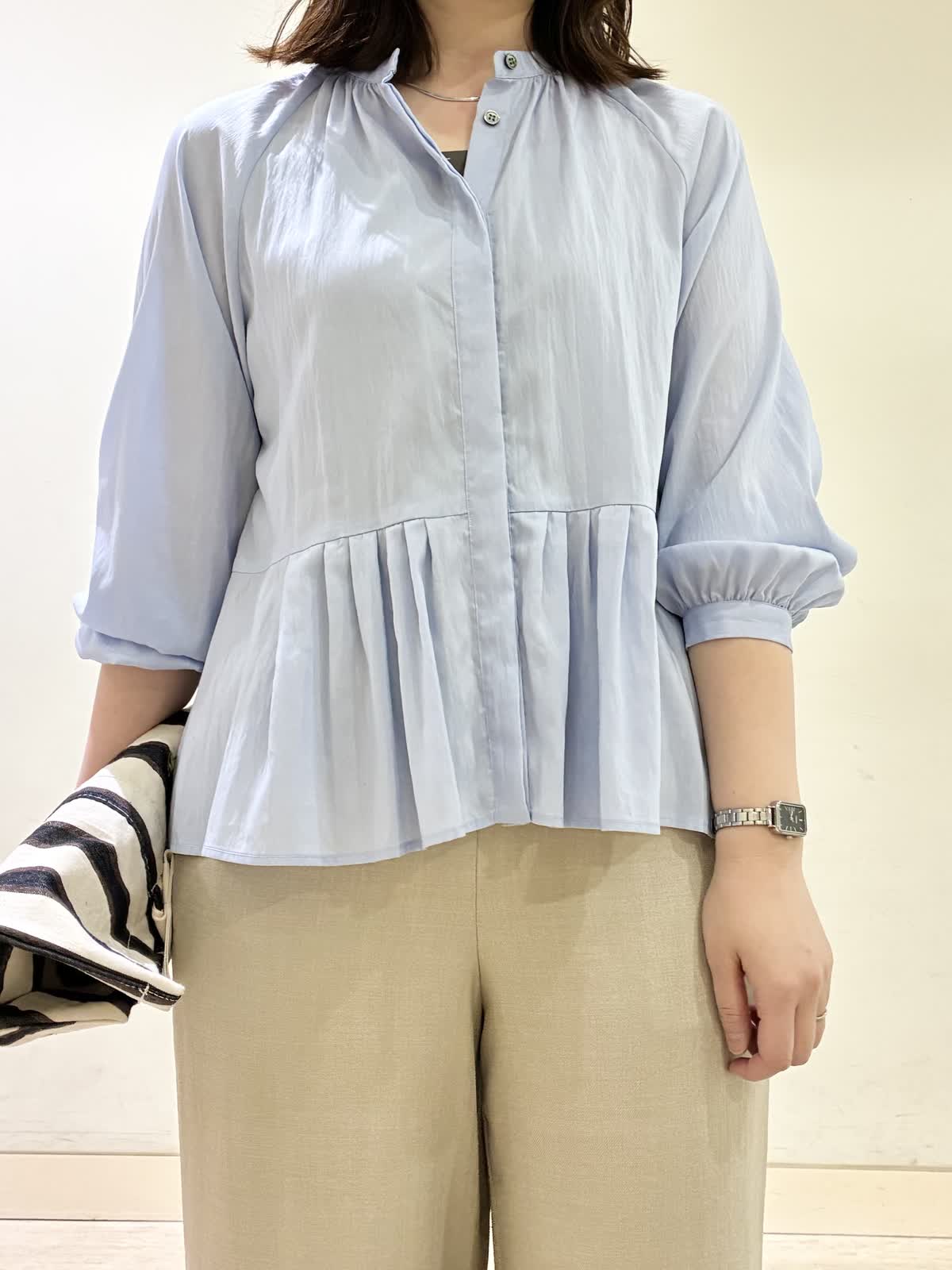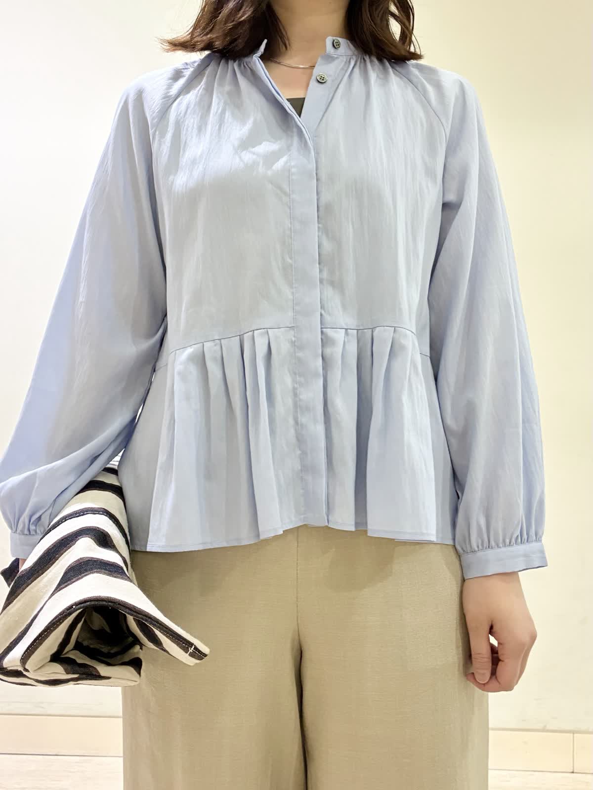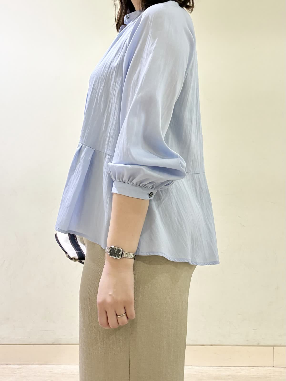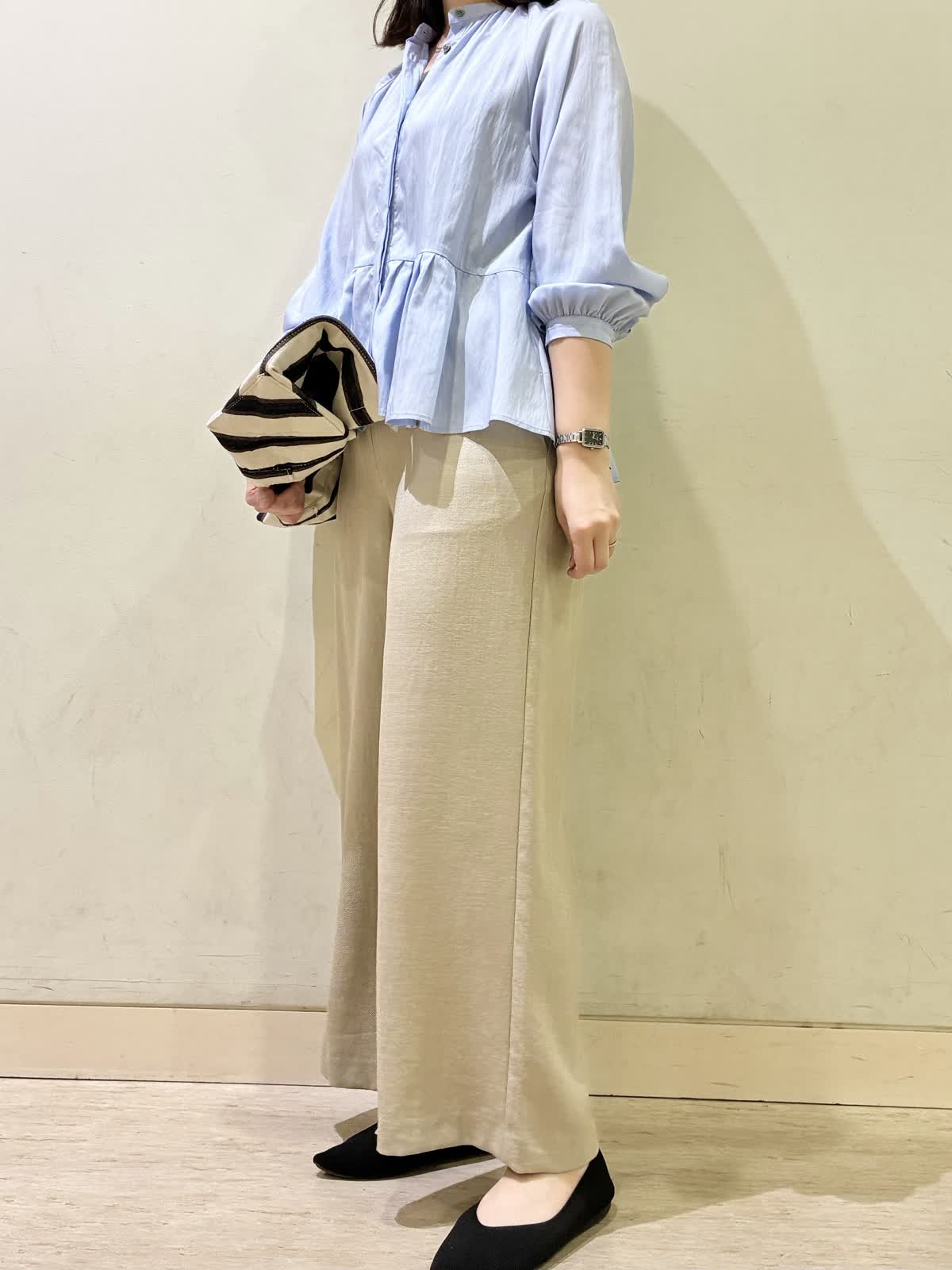 【着用カラー/サイズ】ブラウス:サックス/フリー パンツ:ベージュ/11号 休日おでかけコーデ。ブラウスは薄手の滑らかな肌触りで、着ていてとても気持ちのいい素材です。ウエストから広がるデザインがヒップをカバーしてくれて、骨格ウェーブさんに特に似合うデザインです。