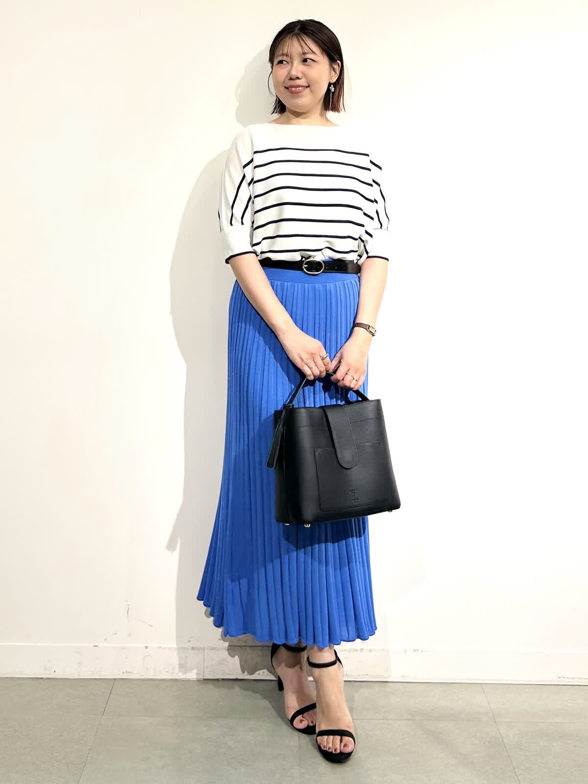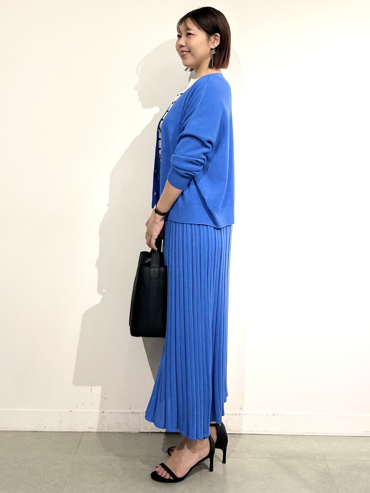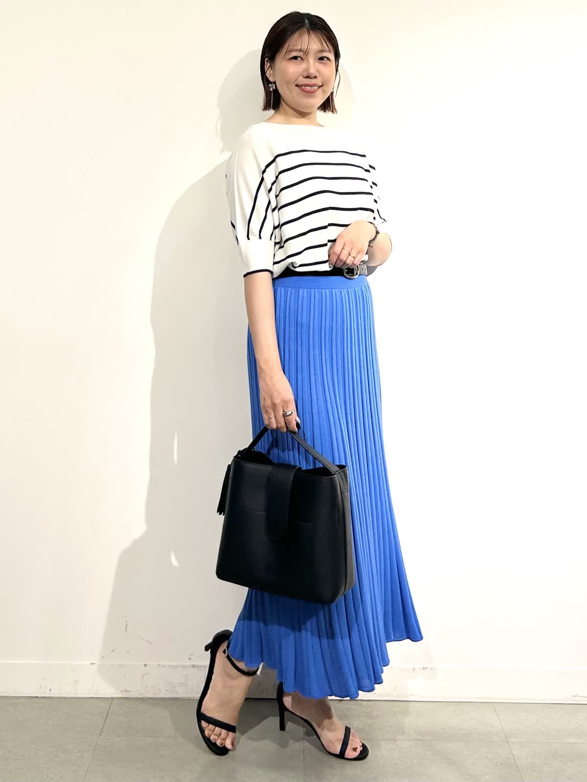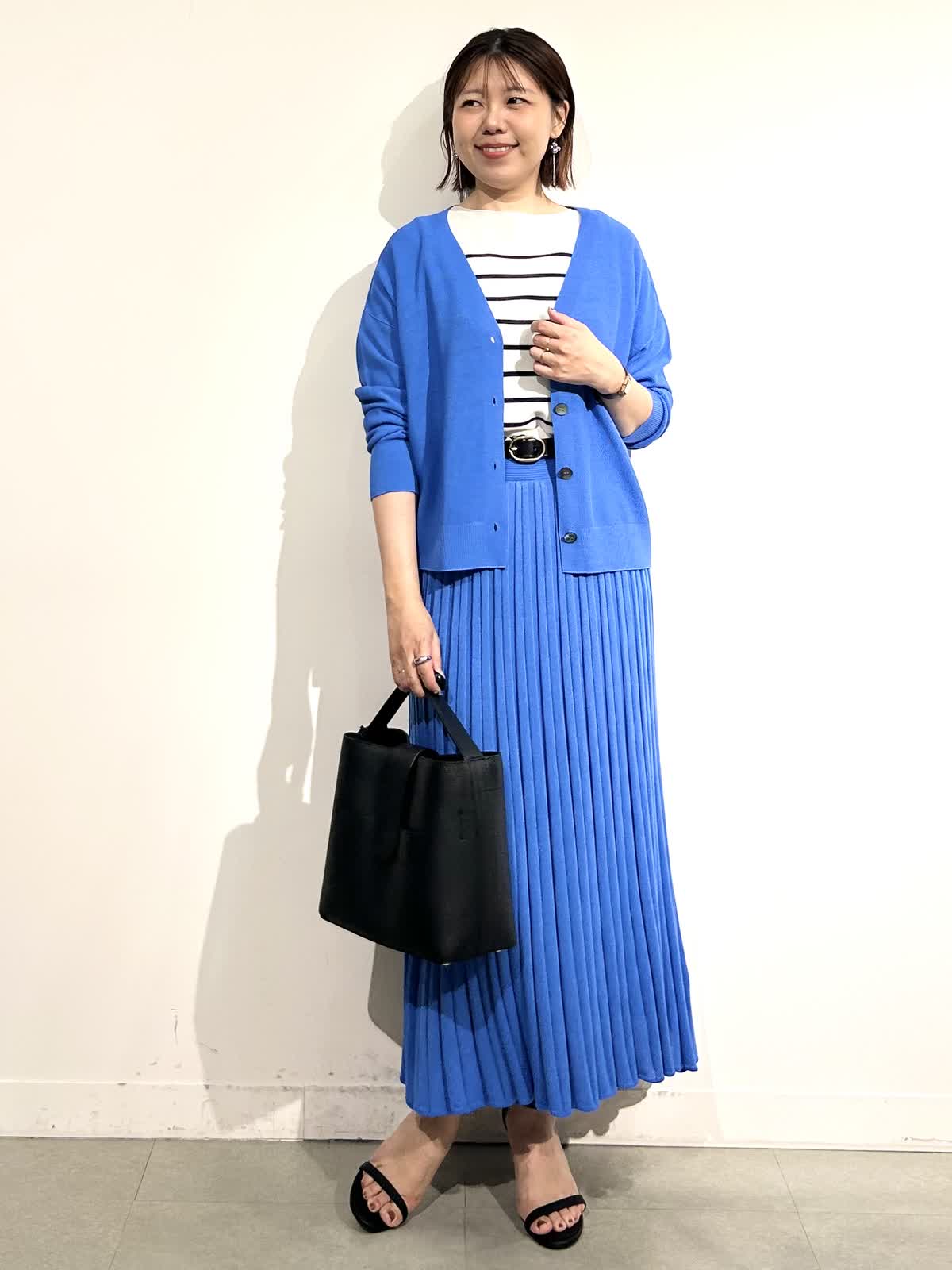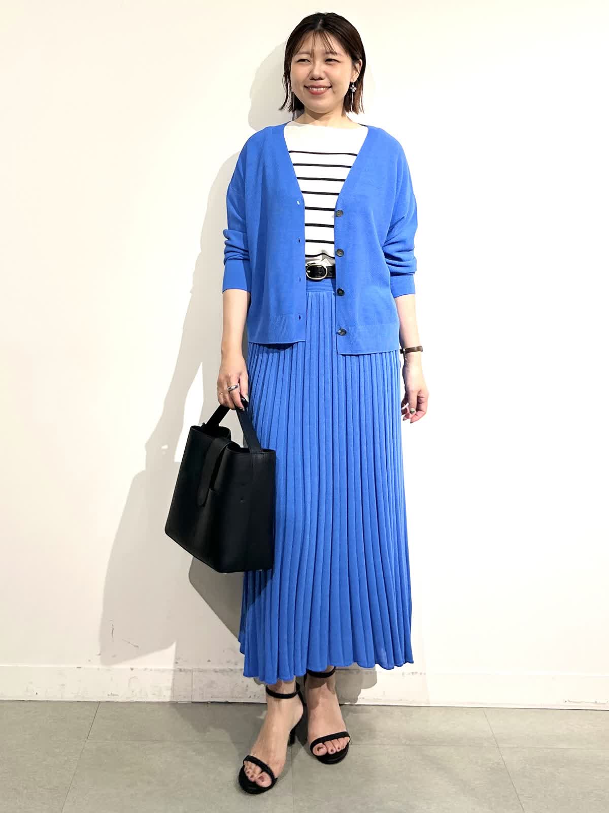 綺麗なブルーが印象的なニットアップできれいめだけど決め過ぎないスタイリングに。