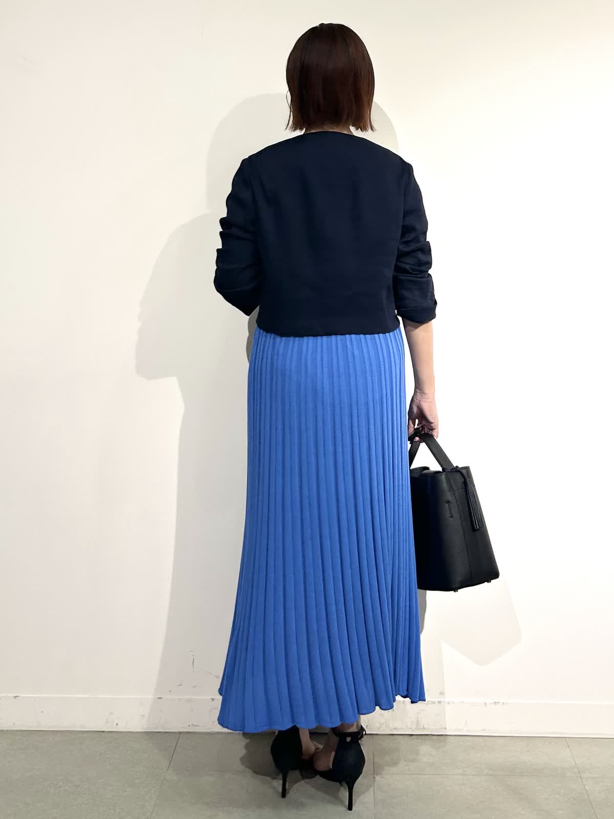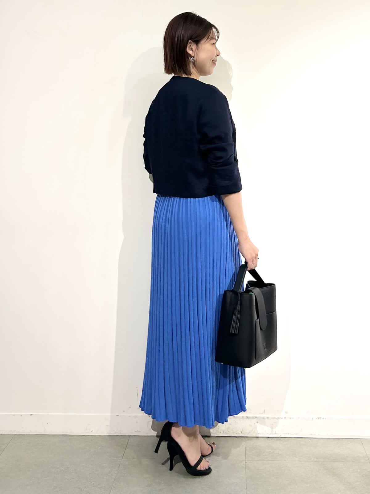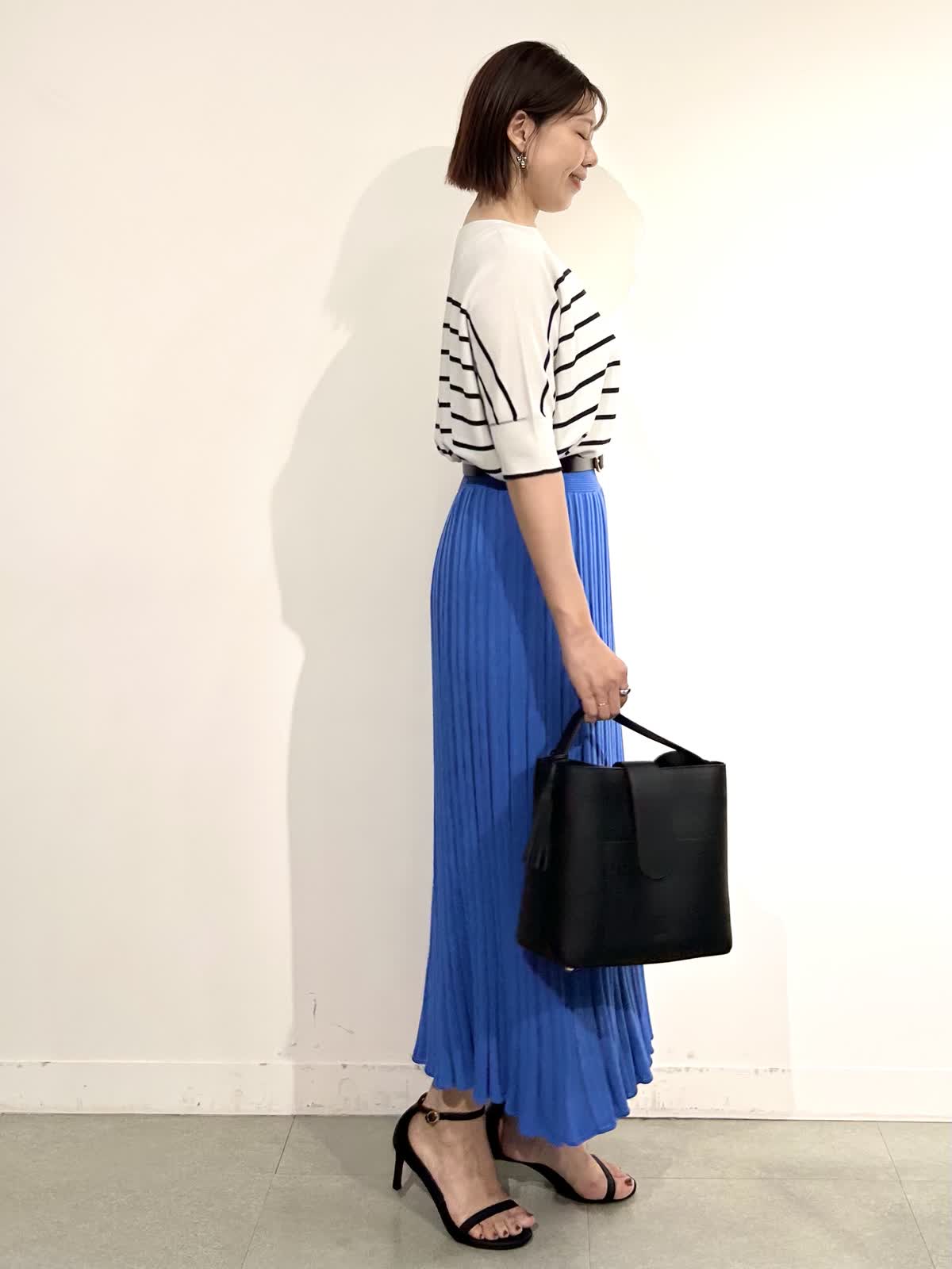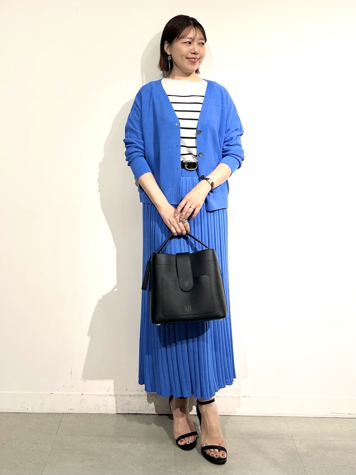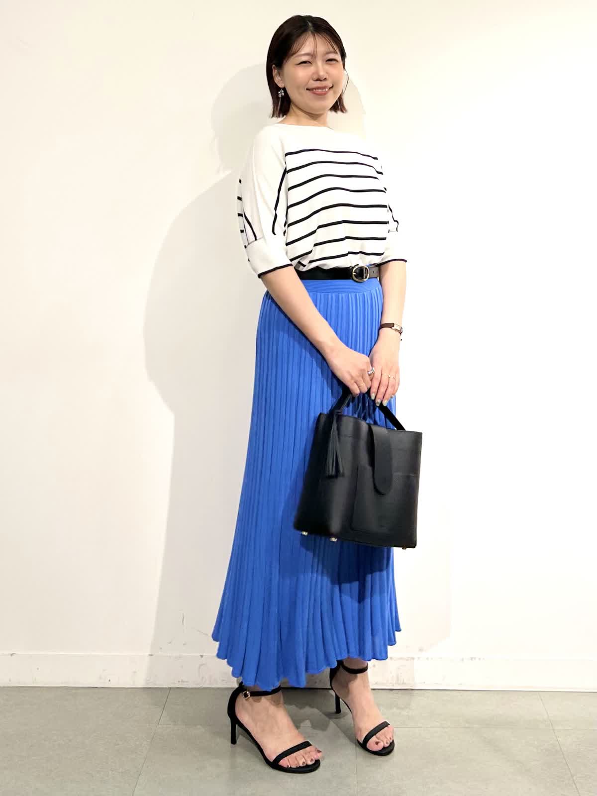 綺麗なブルーが印象的なニットアップできれいめだけど決め過ぎないスタイリングに。