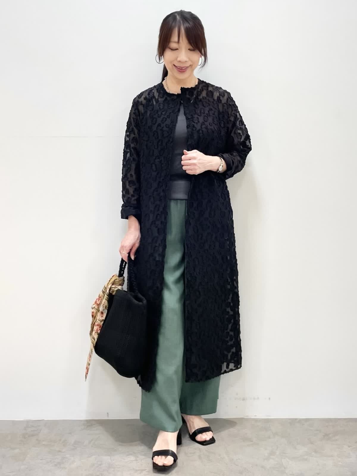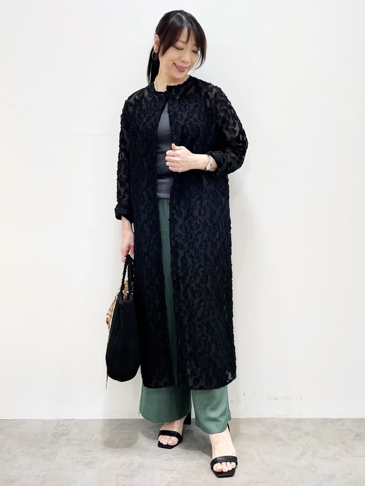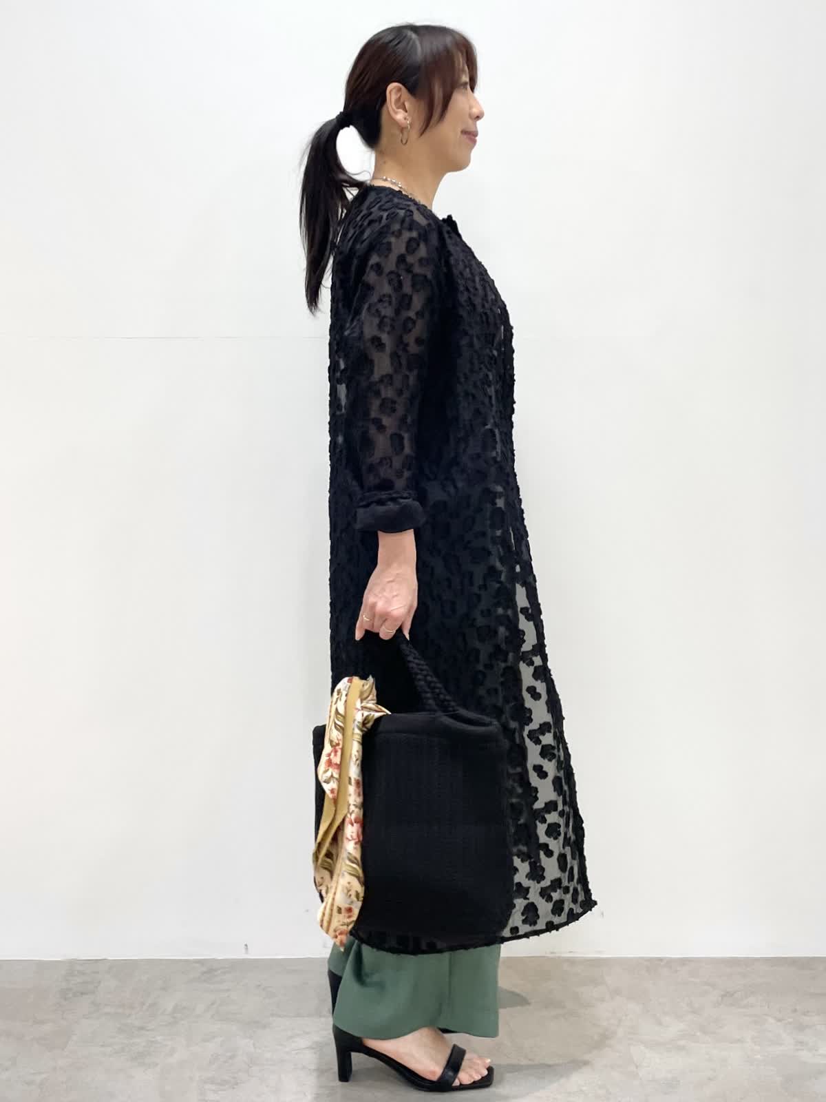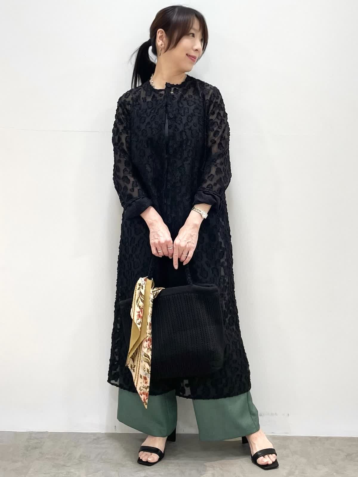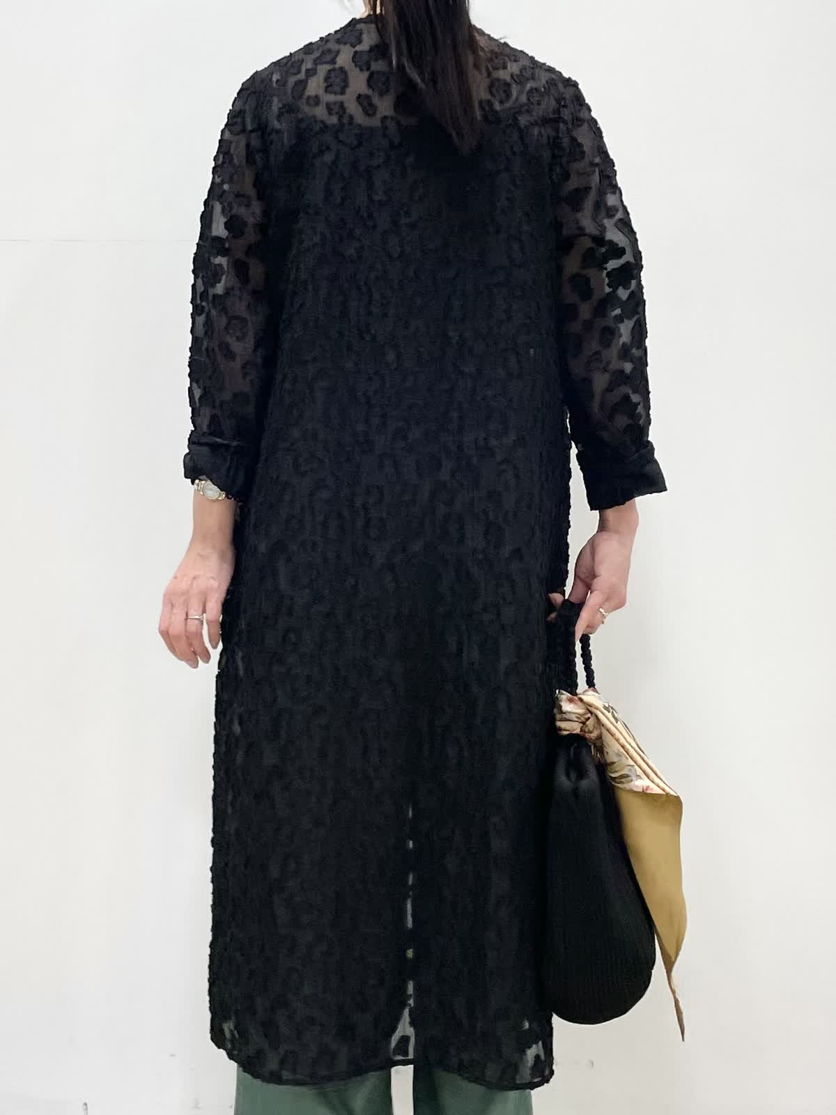 【着用サイズ】全て9号 【着用カラー】ワンピース:ブラック パンツ: モスグリーン 表情豊かなカットジャガード素材を使用したワンピース。透けすぎない大人っぽいシアー感。張り感があり体にフィットしすぎず軽い着心地です。上半身だけボタンを留めたり、羽織ったりと様々な着こなしをお楽しみいただけます。