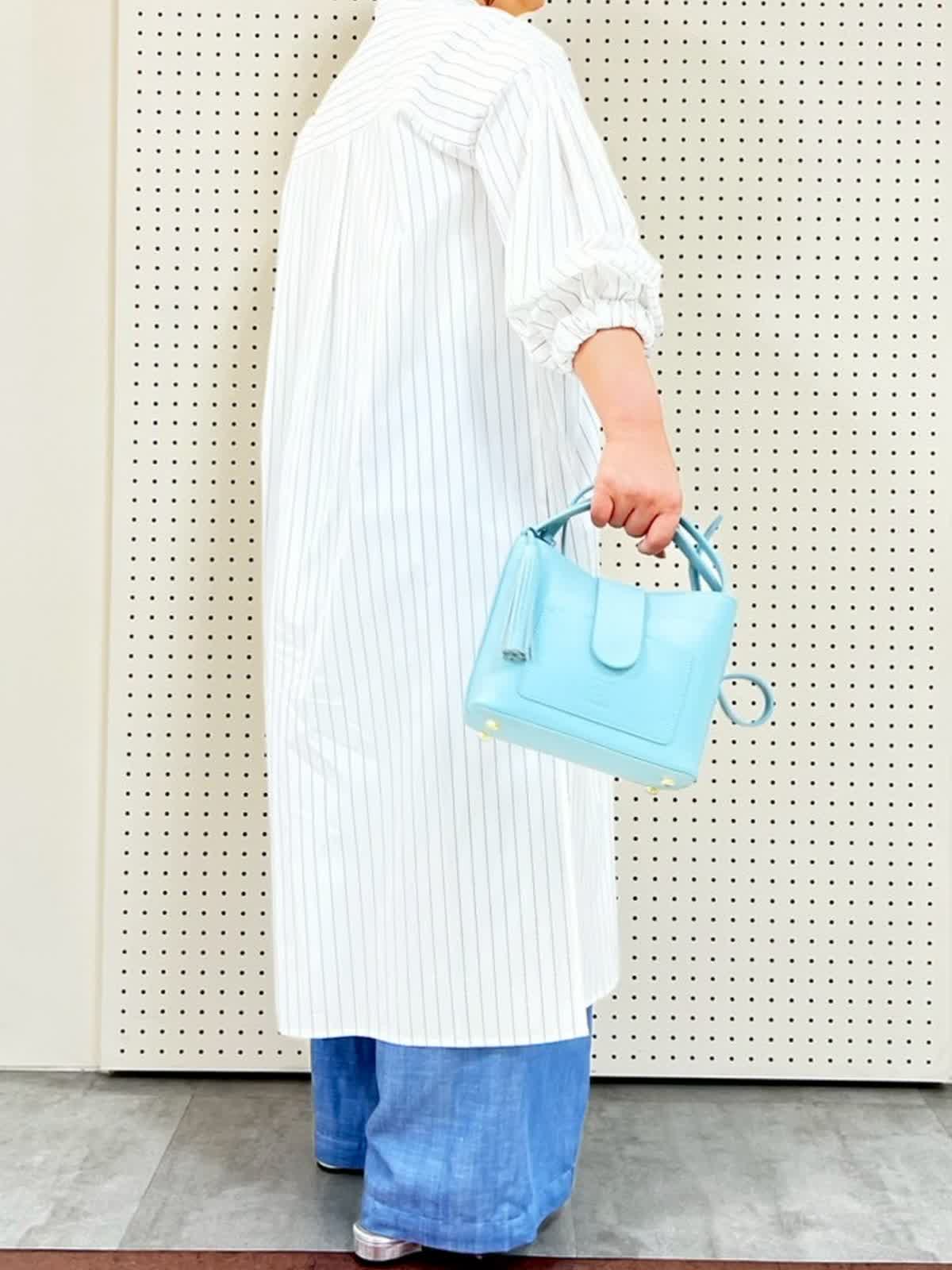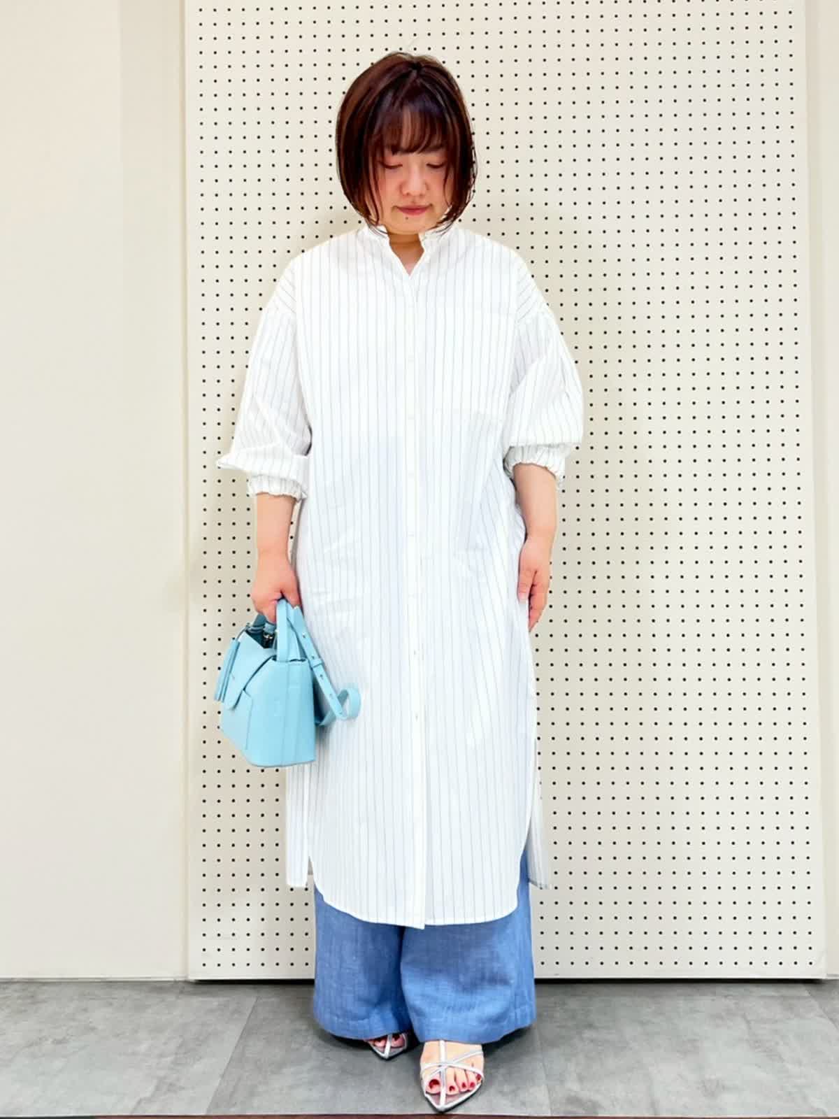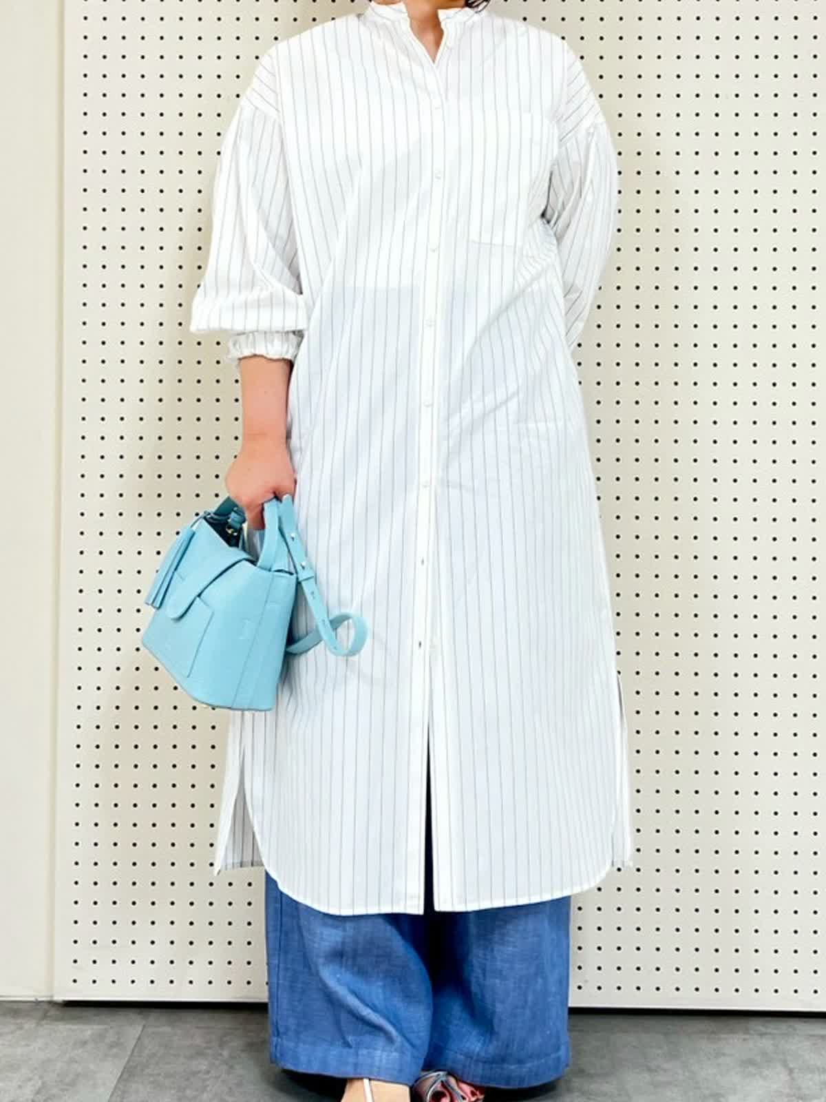 【着用サイズ】9号、フリー【着用カラー】ワンピース:オフホワイト パンツ:サックス バッグ:サックス お出かけコーディネート。ワンピースは身長149p、フリーサイズ着用で膝下の長さ。袖口がゴムになっているので、長さ調節がしやすいです。ワイドパンツと合わせるとカジュアル見えするので、お出かけにぴったりです。パンツは5p丈詰めしています。