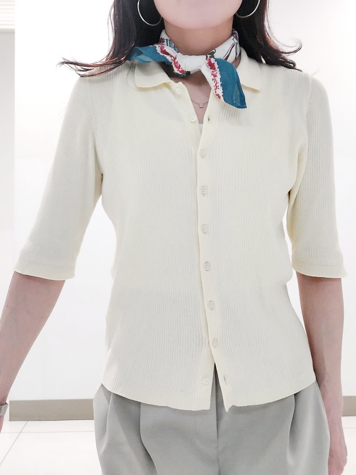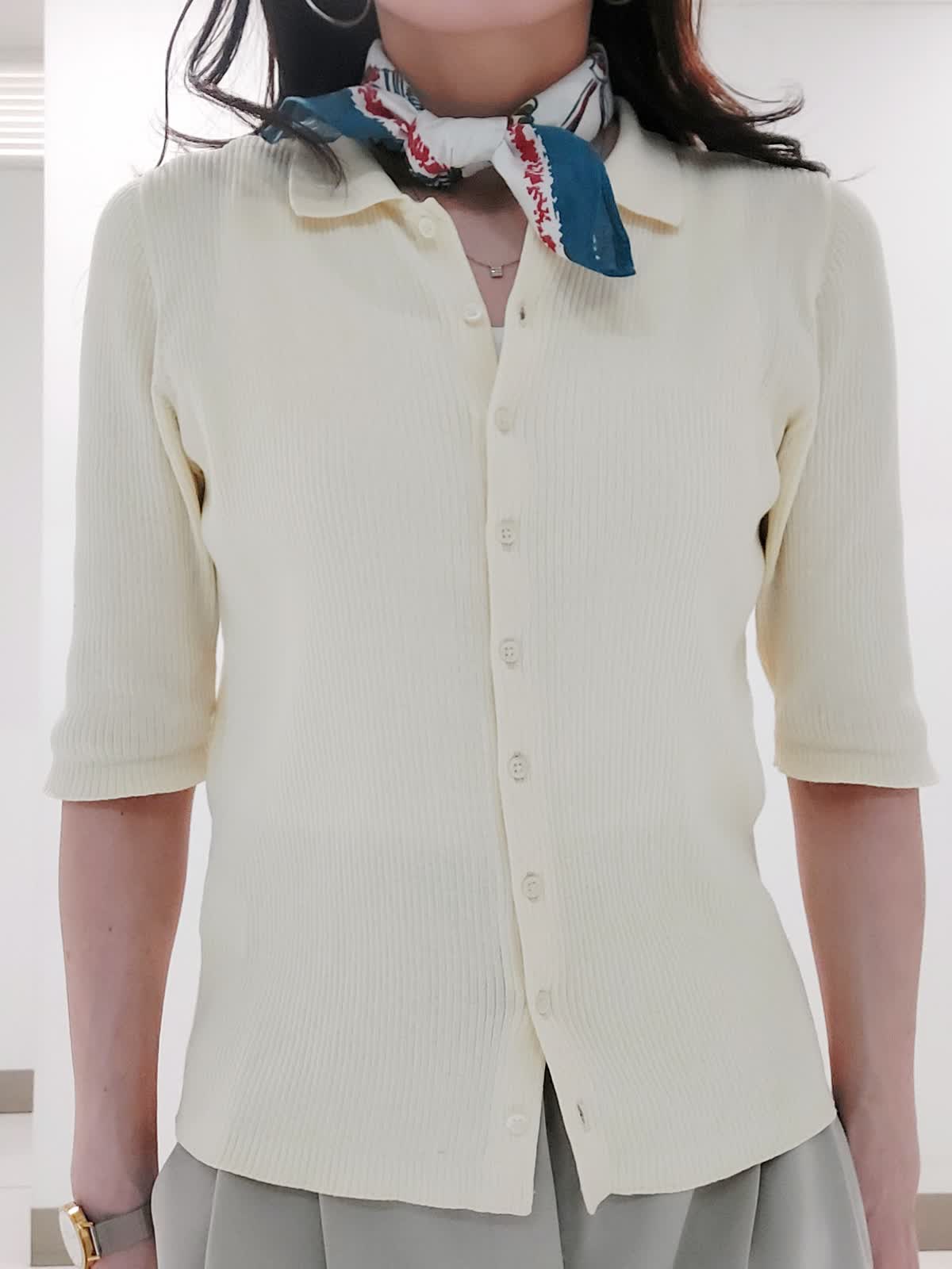 【着用サイズ】ニット:9号 パンツ:9号 すっきり見えしながら体のラインを拾いすぎないサイジングと表面感のあるリブ編地にこだわったポロ襟ニット。前の釦を開けてカーディガンとしてもお使いいただけます。1枚でトレンドらしさを取り入れらるマストアイテム。コットンとナイロン素材で軽量に仕上がり、吸汗性と透湿性にも優れています。センタープレスを入れたタックワイドパンツ。ウエストゴム&両サイドの釦でサイズ調節が可能です。広がり過ぎないワイドシルエットですっきり見えきれい見えします。ドライタッチが特徴のポリエステル素材でシワになりずらく、お手入れも楽なのもポイントです。
