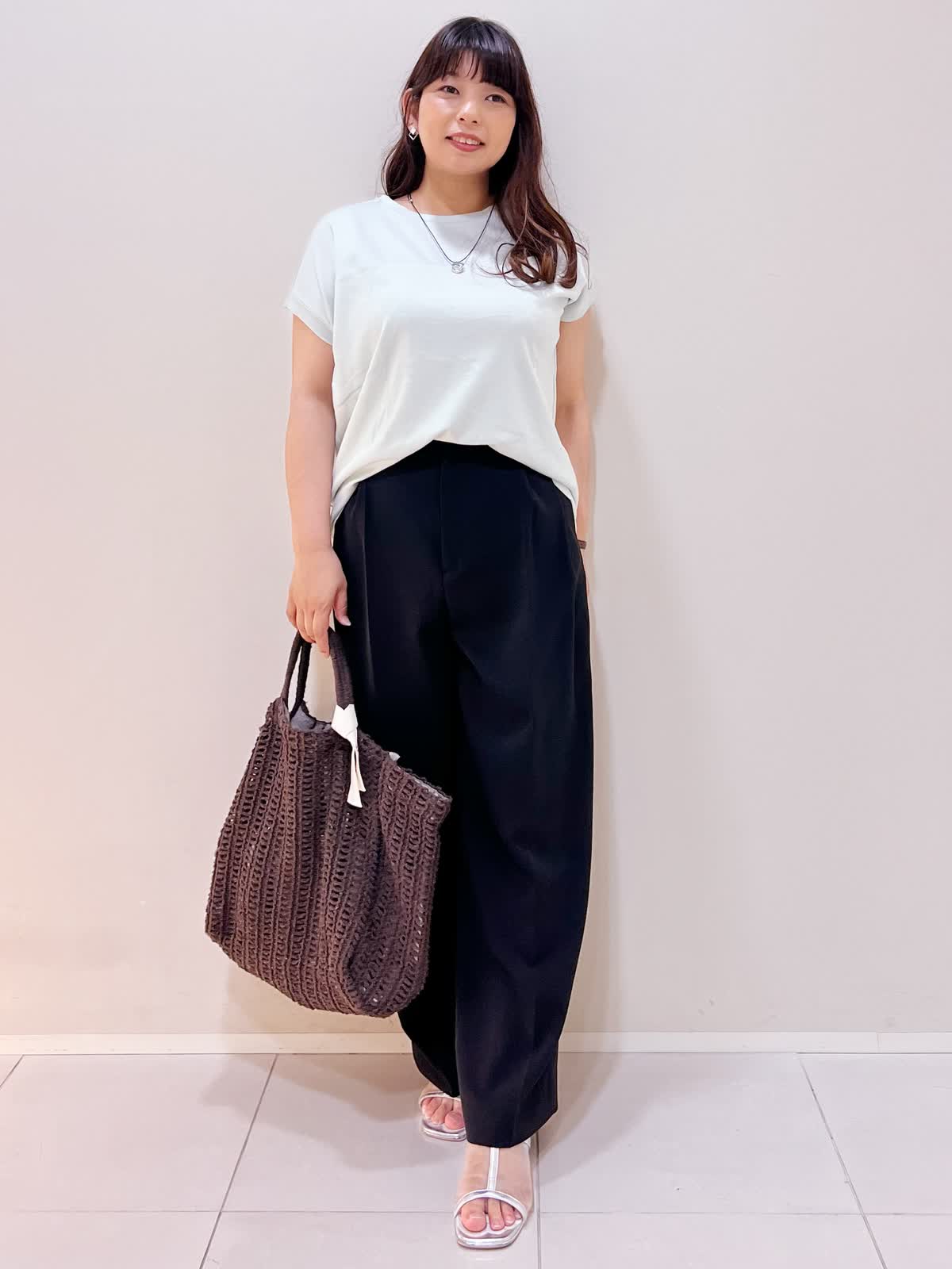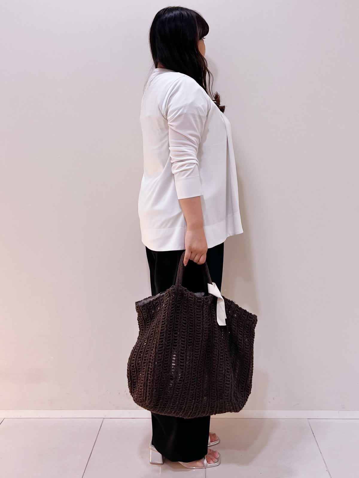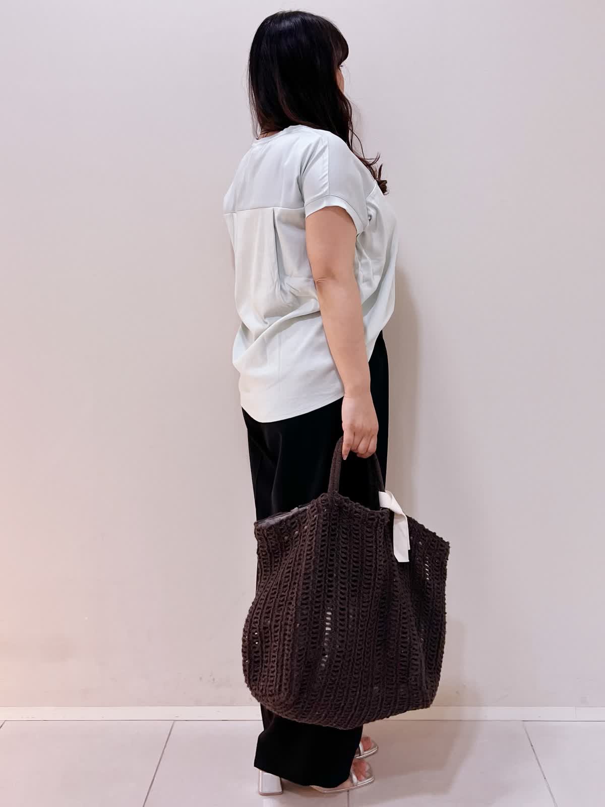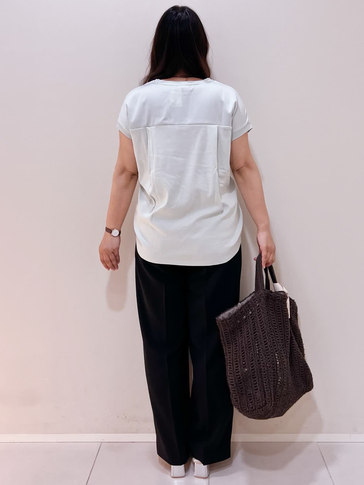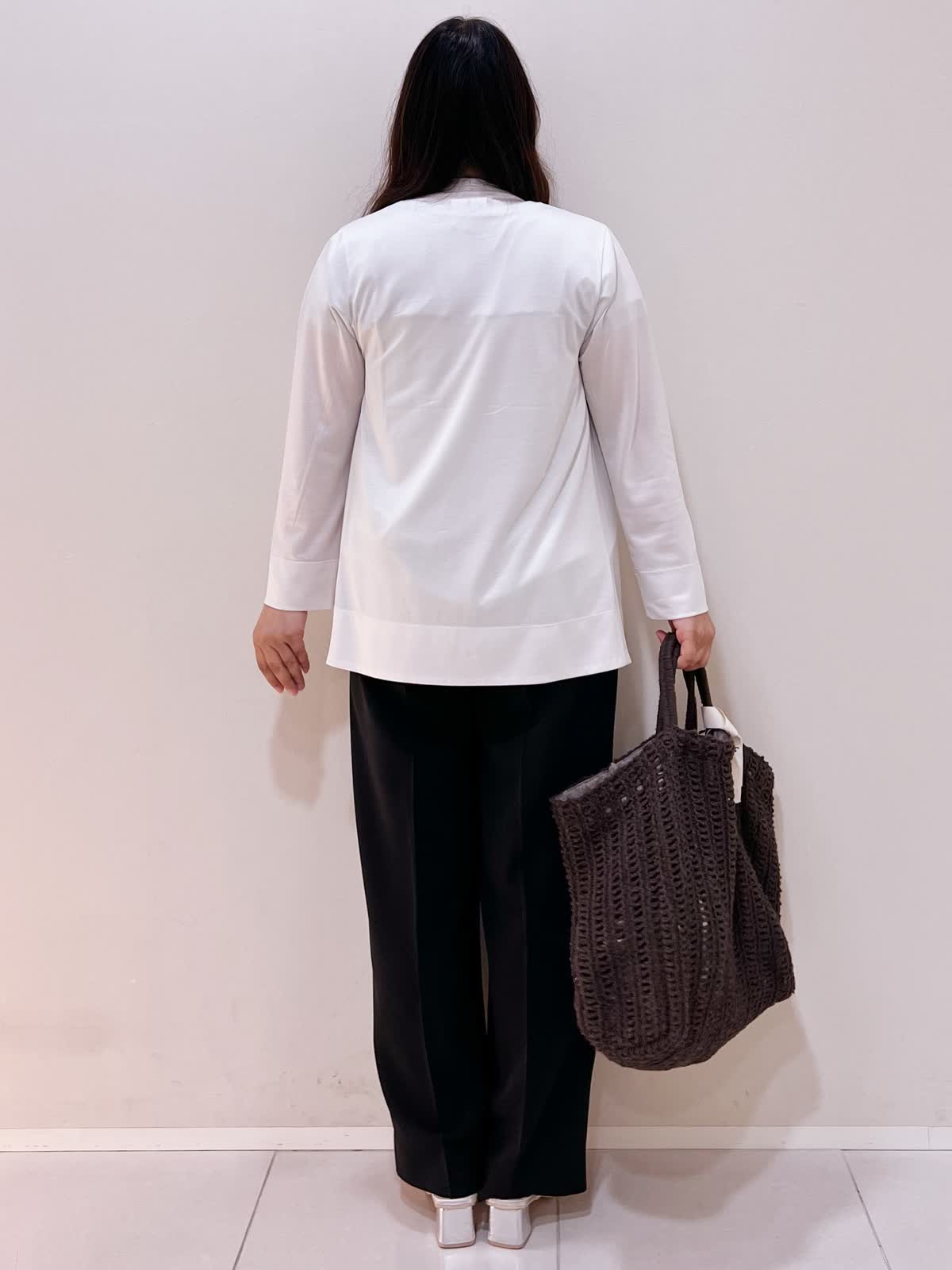 【着用サイズ】カーディガン:9号 カットソー:フリー パンツ:9号 【着用カラー】カーディガン:グレー カットソー:ペパーミント パンツ:ブラック ネックレス:シルバー バッグ:チャコールグレー 夏のお出掛けスタイル。 さらっとした肌触りのニュアンスカーディガン。綺麗なシルエットでありつつ重ね着もしやすく、UVカットと接触冷感機能を兼ね揃えた、これからのシーズンにぴったりの軽い羽織りアイテムです。 サテンの切り替えがポイントのドルマンカットソーは程よくゆったりとしたサイズ感でインナーに合わせやすい一着。 シワになりにくいタックワイドパンツと合わせて、旅行やお出掛けにお勧めのコーディネートです。