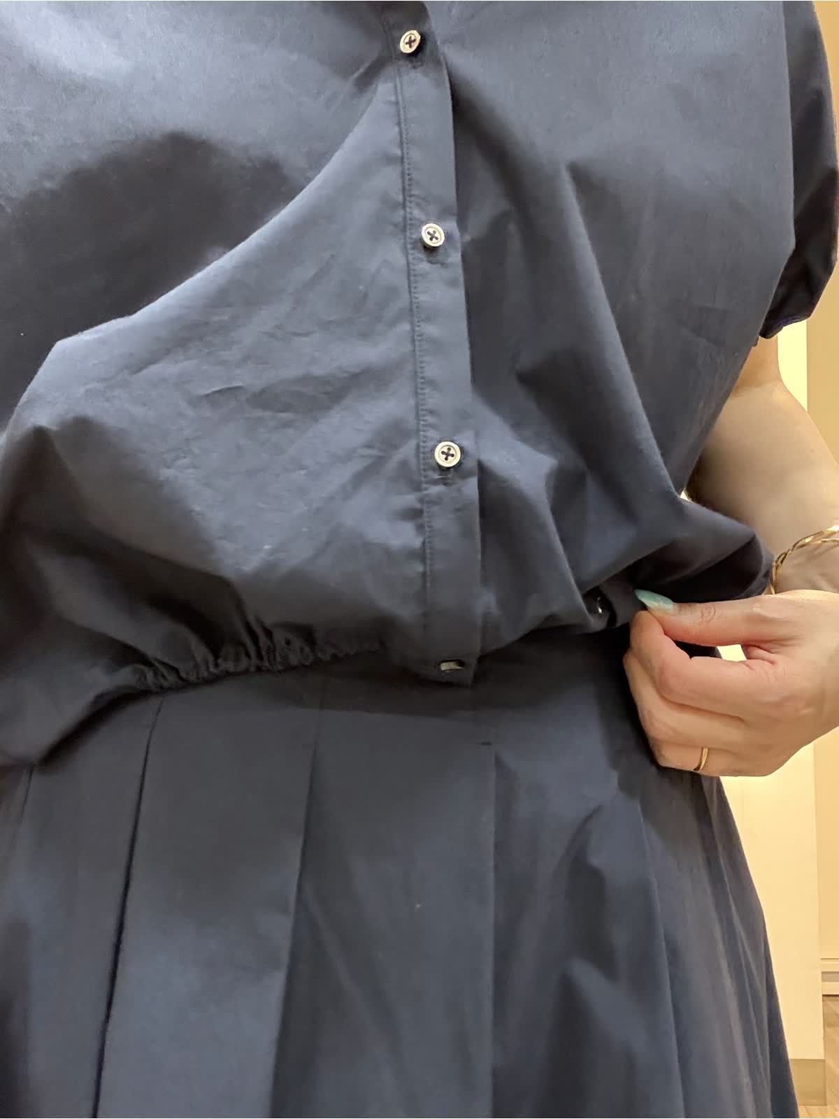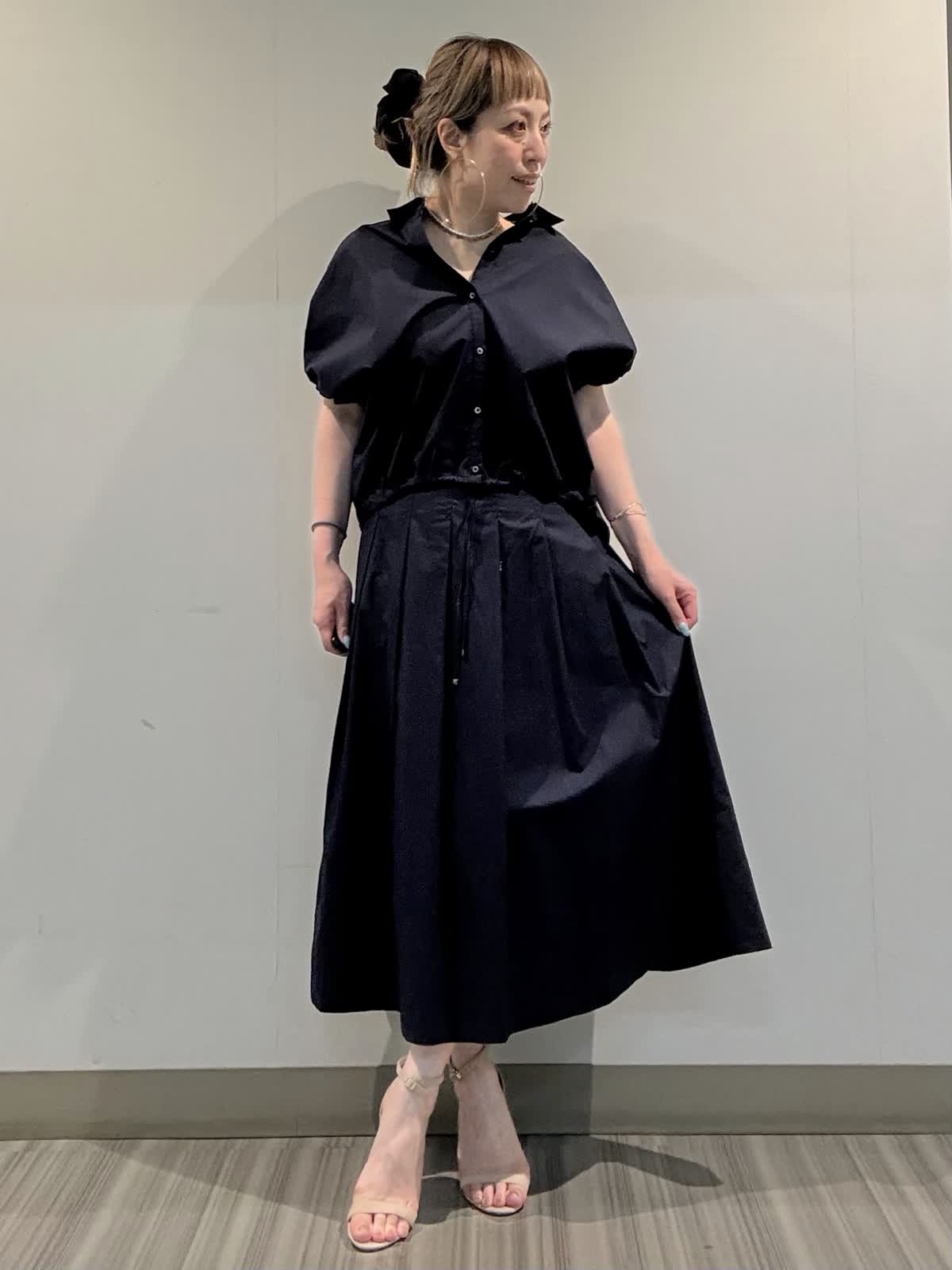 【着用カラー:サイズ】プラウス:ネイビー:フリー スカート:ネイビー:9号【STORYコラボ】小さめのシャツ衿がクラシックできちんと感をあたえてくれるブラウス。ドルマンスリーブ!裾のブラウジングは調節可能で、ボトム合わせてシルエットの変化も楽しめ今回は、同素材のスカート合わせで!