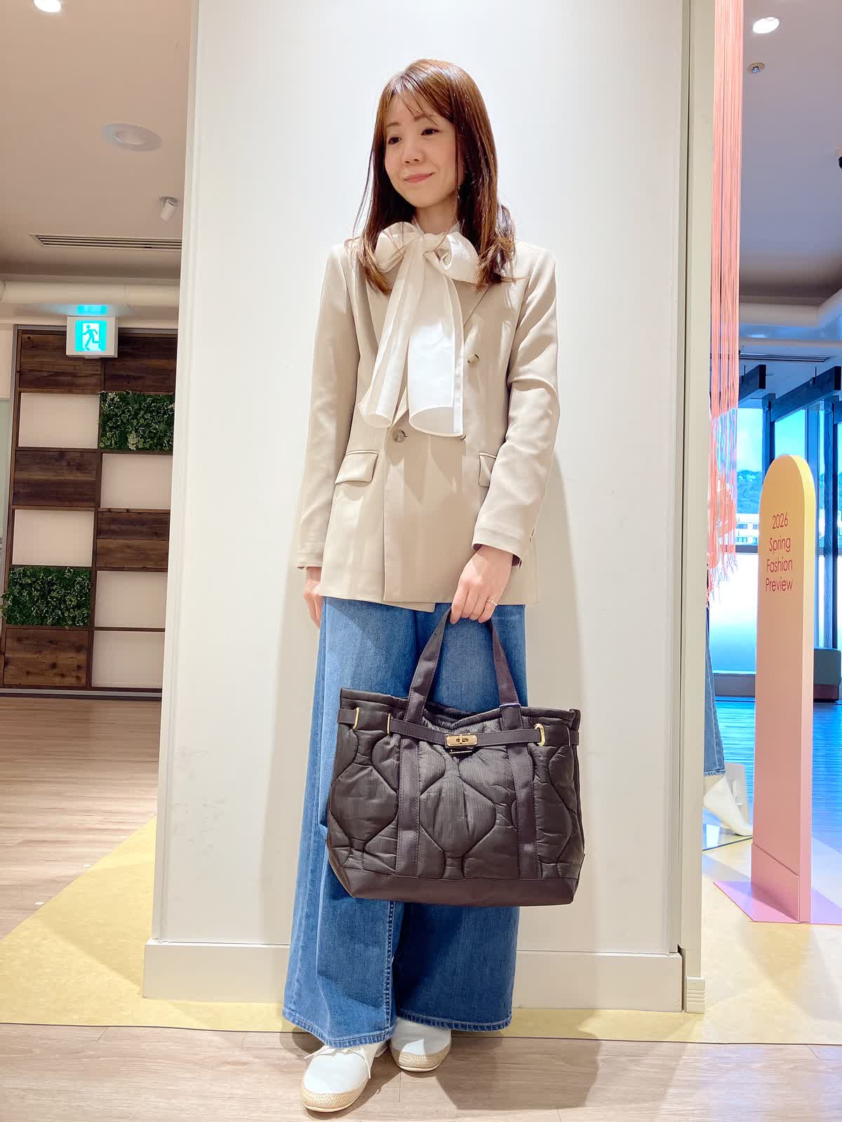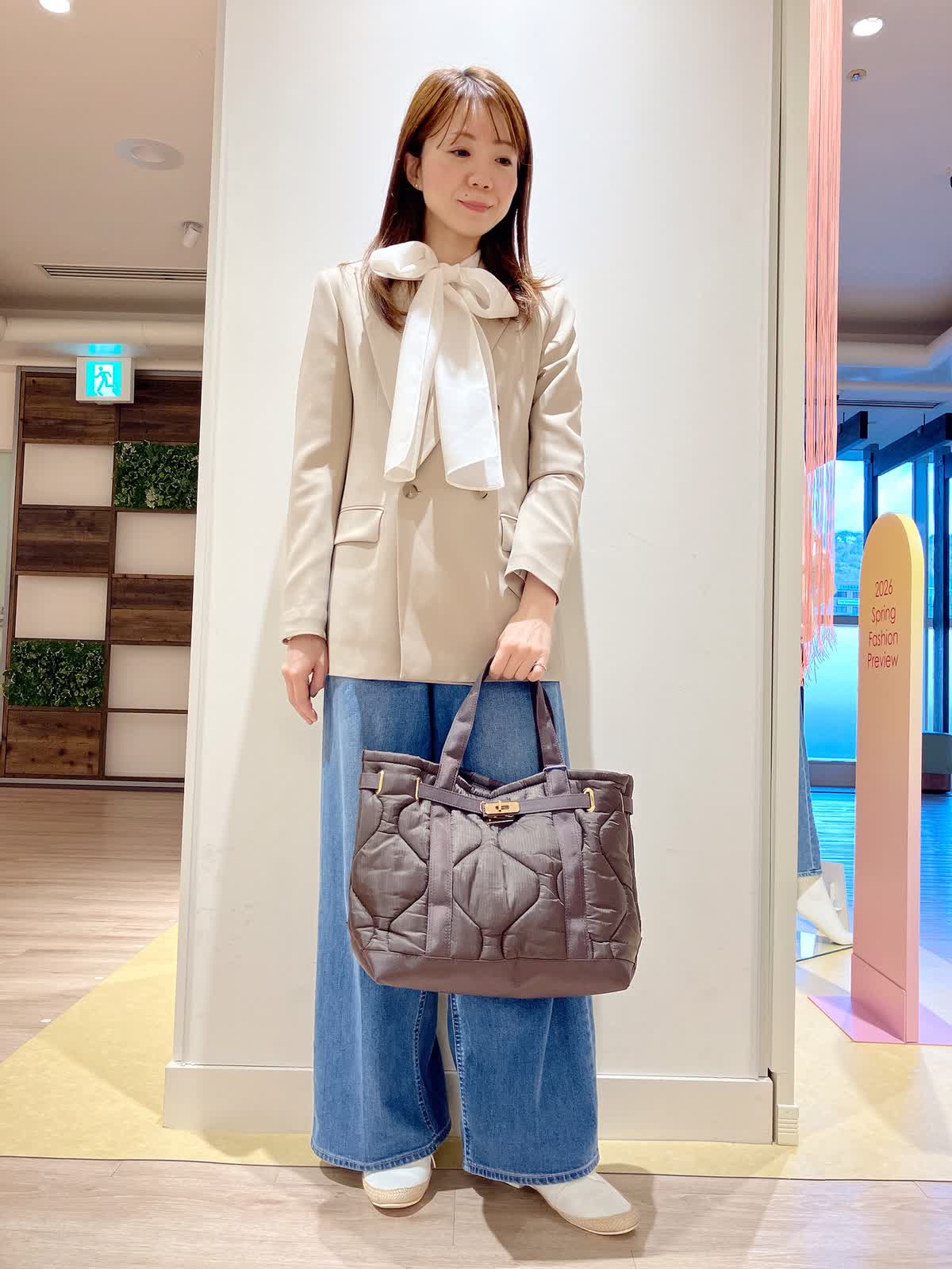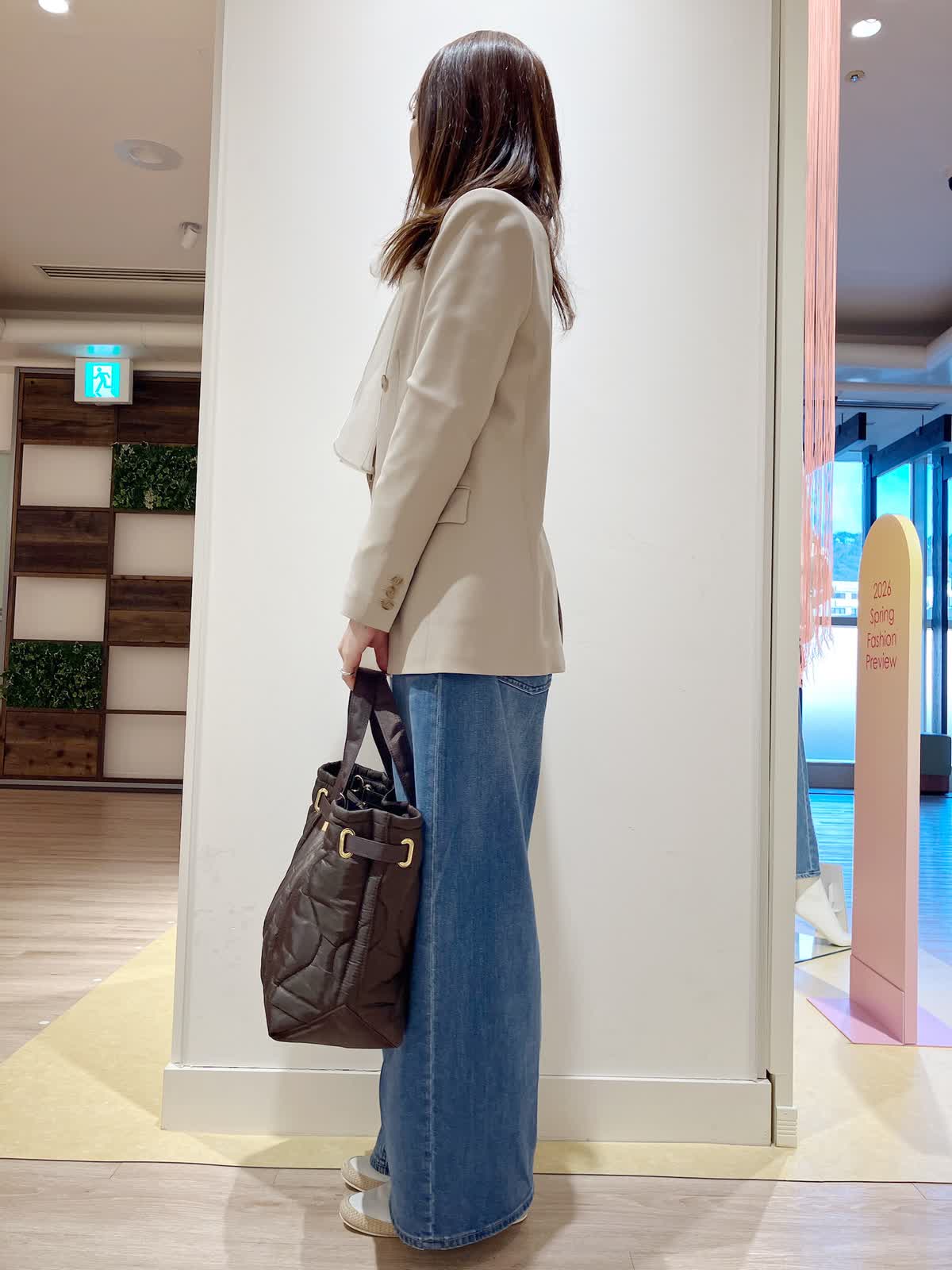 【着用サイズ】ジャケット:9号 ブラウス:9号 パンツ:5号 【着用カラー】ジャケット:ベージュ ブラウス:アイボリー パンツ:インディゴ コーディネートのテーマはトラッドな通勤スタイリングです。 軽くアウターがわりになるダブルブレストのジャケットを、エレガンスカジュアルにまとめた通勤仕様のコーディネート。上品さとカジュアルさがちょうどよい、おすすめのコーディネートです。
