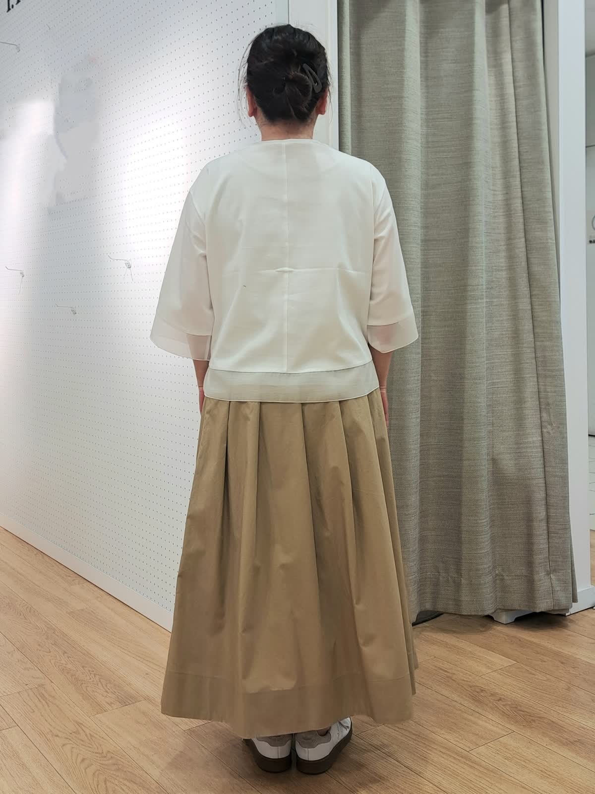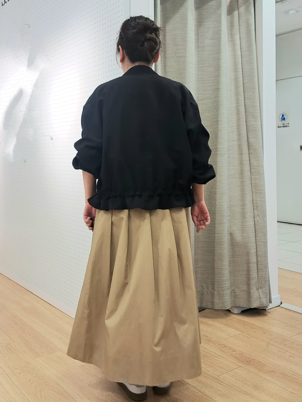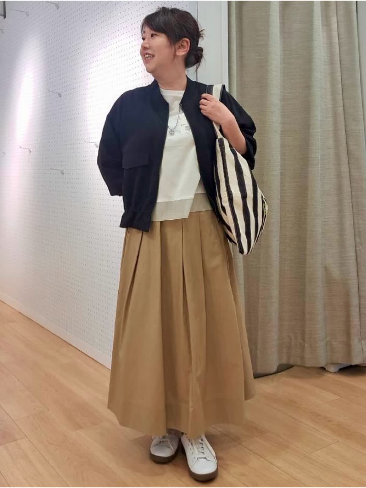 【着用カラー/着用サイズ】ブルゾン:ブラック:フリー/カットソー:ホワイト:フリー/スカート:ベージュ:9号 春のお出かけスタイリング 薄いアウターはシワにもなりにくく着丈も長すぎないのでスカートと合わせてもバランスも良く着られます。
