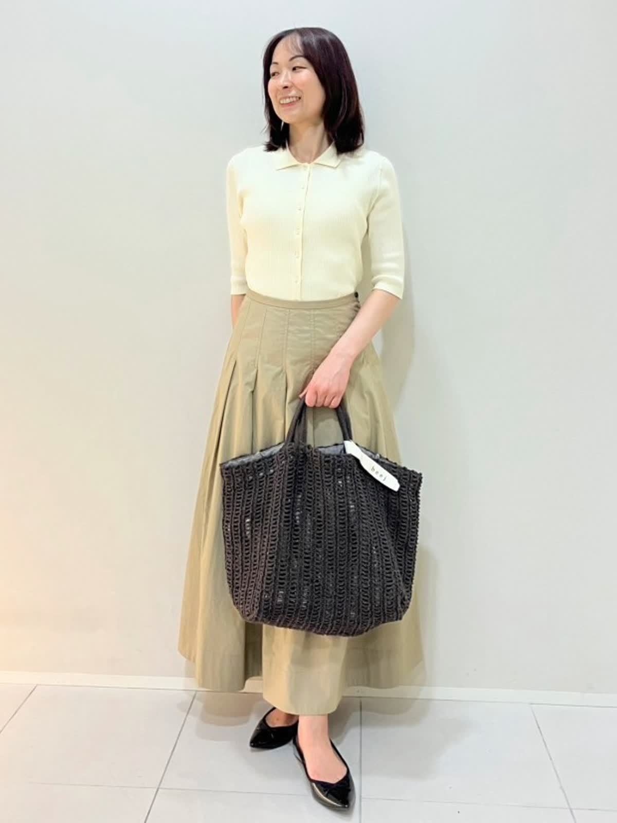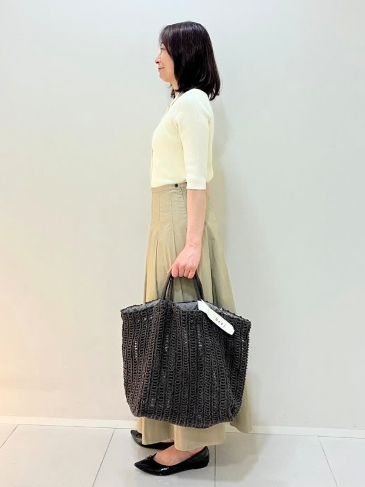【着用サイズ】ニット:フリー スカート:7号【着用カラー】ニット:イエロー スカート:ベージュ 休日のお買い物スタイル 襟付のニットは伸縮性があり、サラッとした肌触り。適度なフィット感でスッキリ見えます。スカートは、しなやかなハリ感があり綿素材ですが、カジュアルすきず上品な印象になります。
