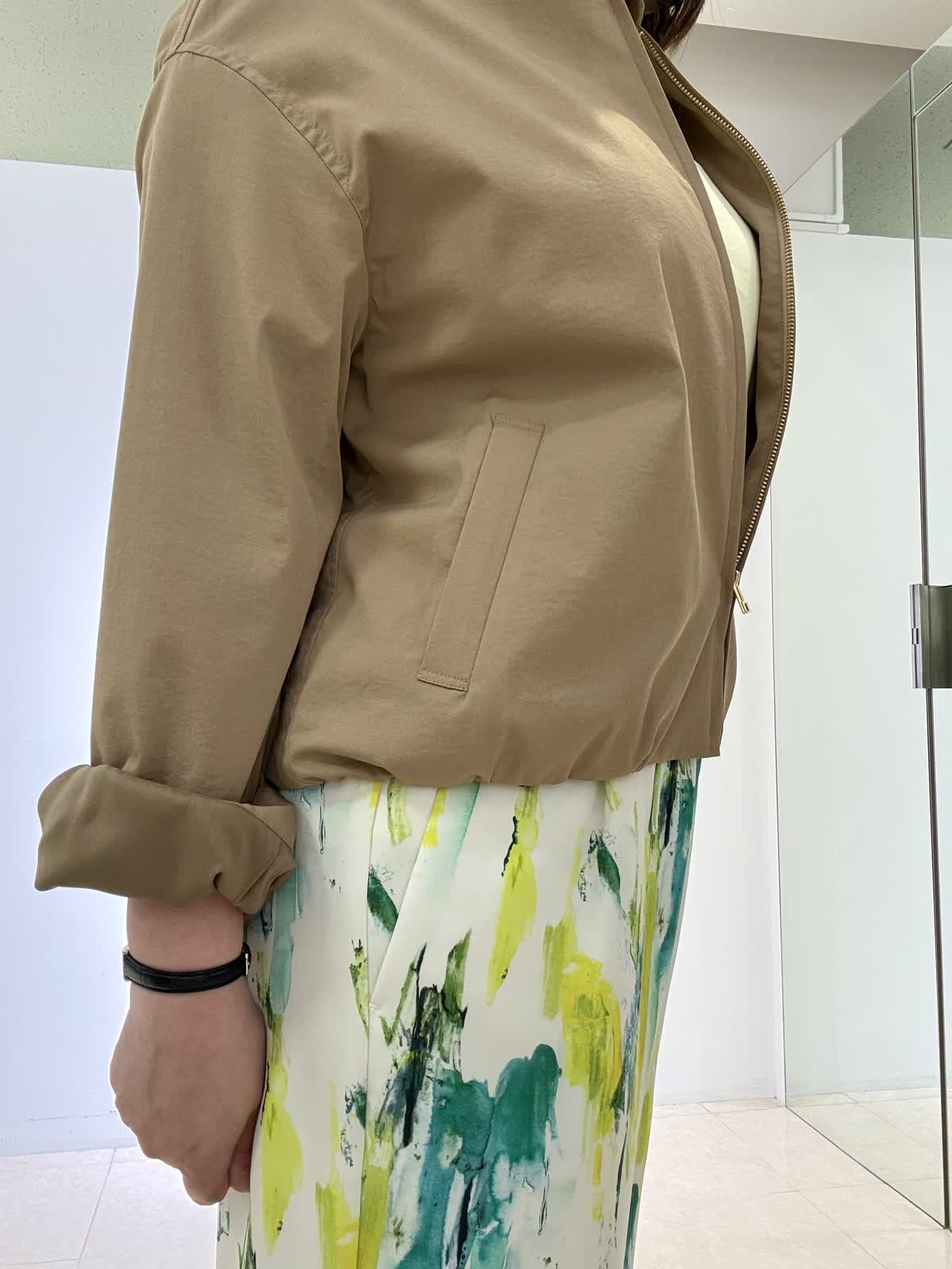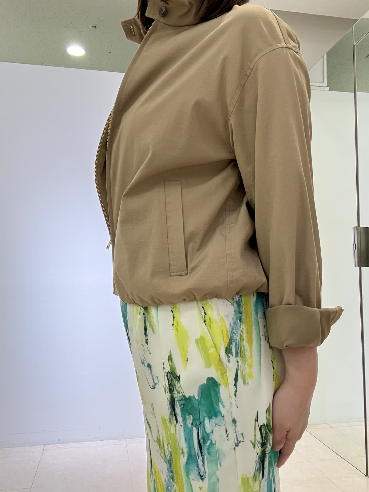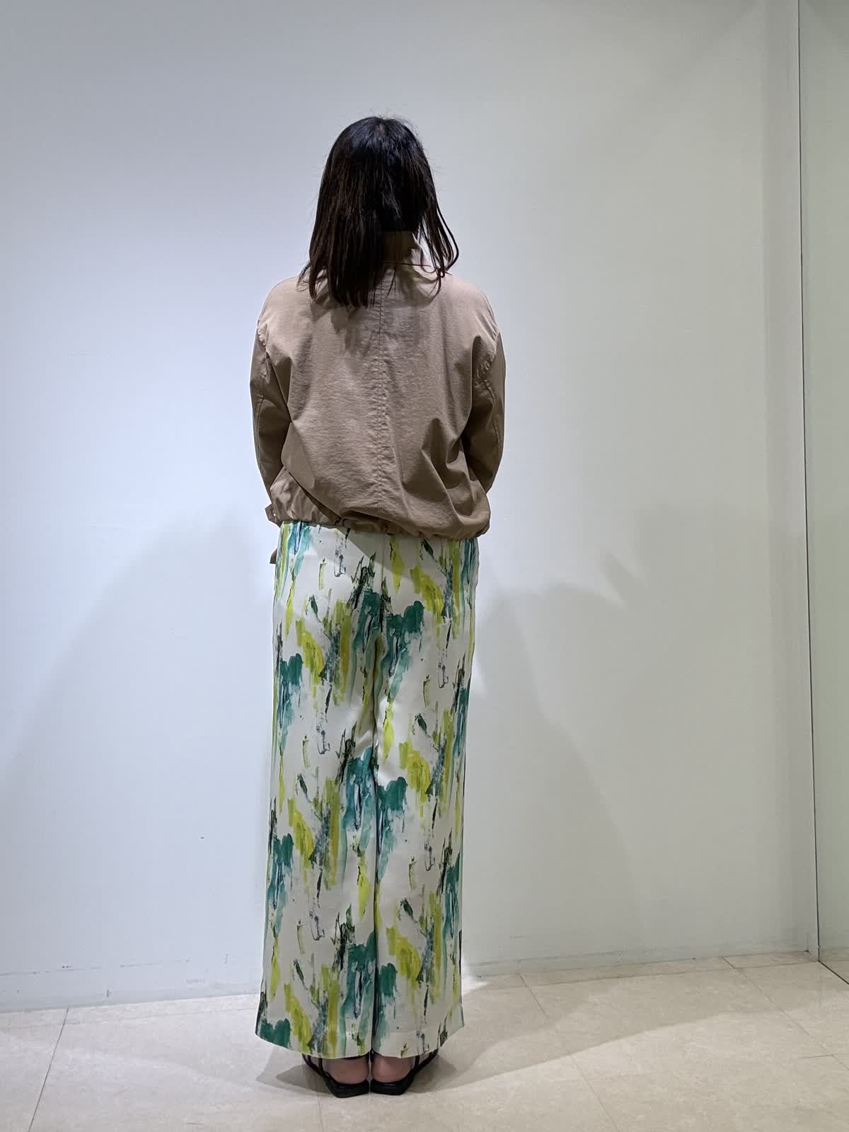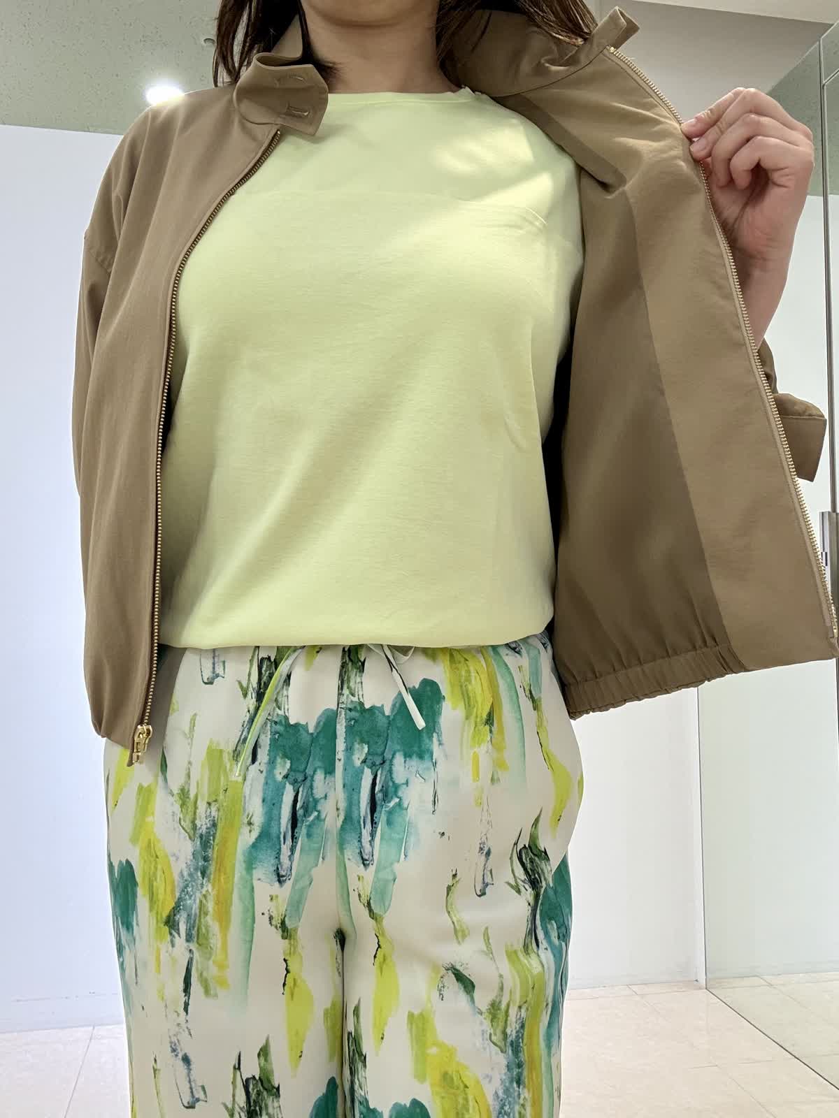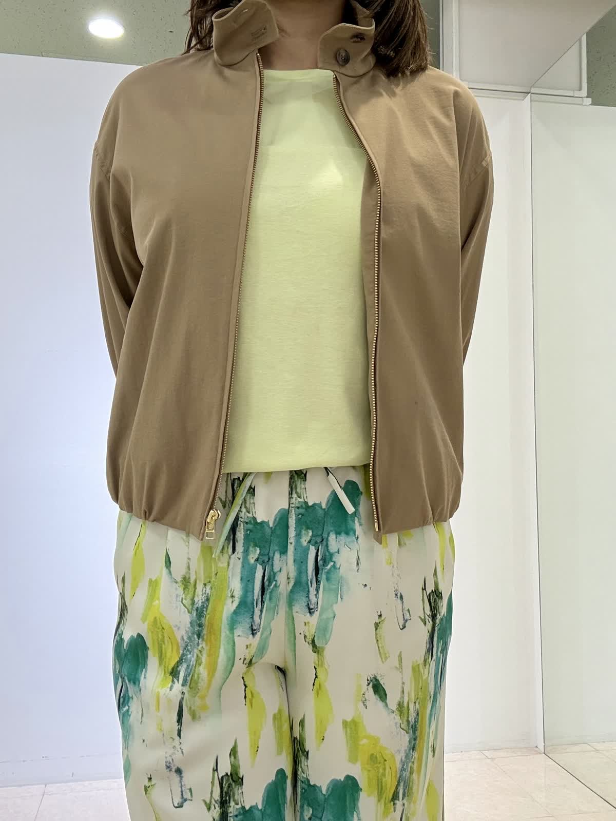 ブルゾン着用サイズ 11号 スタンドカラーのショートブルゾンになります。腕周りなどゆとりもあり、肌寒い日は厚手のニットを入れても大丈夫です!サッと羽織れます。裏地付き。 パンツ着用サイズ 9号 鮮やかな色が目を引くワイドパンツです。サラサラしてるので旅行などでも大活躍です。ウエストはゴムで楽ちんです。 カットソー着用サイズ フリー サテン切替のカットソーです。身体のラインが出ないので安心して着用できます。
