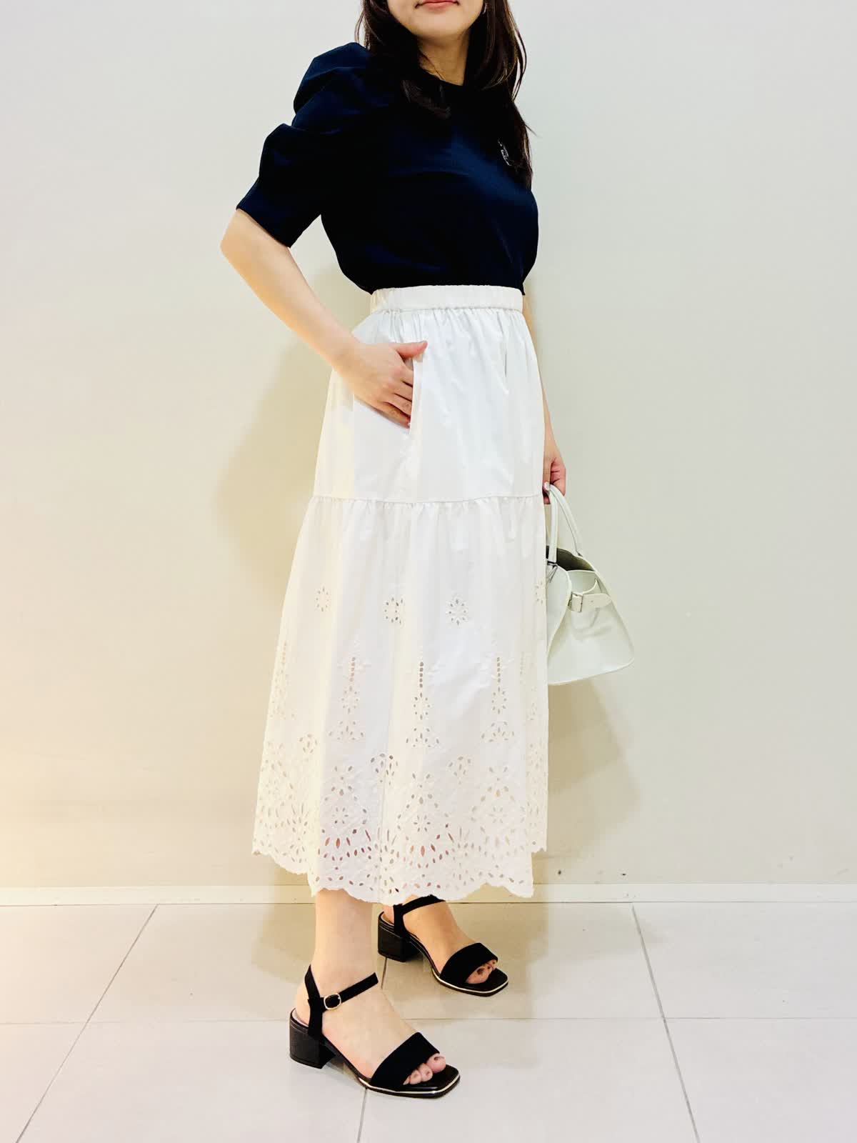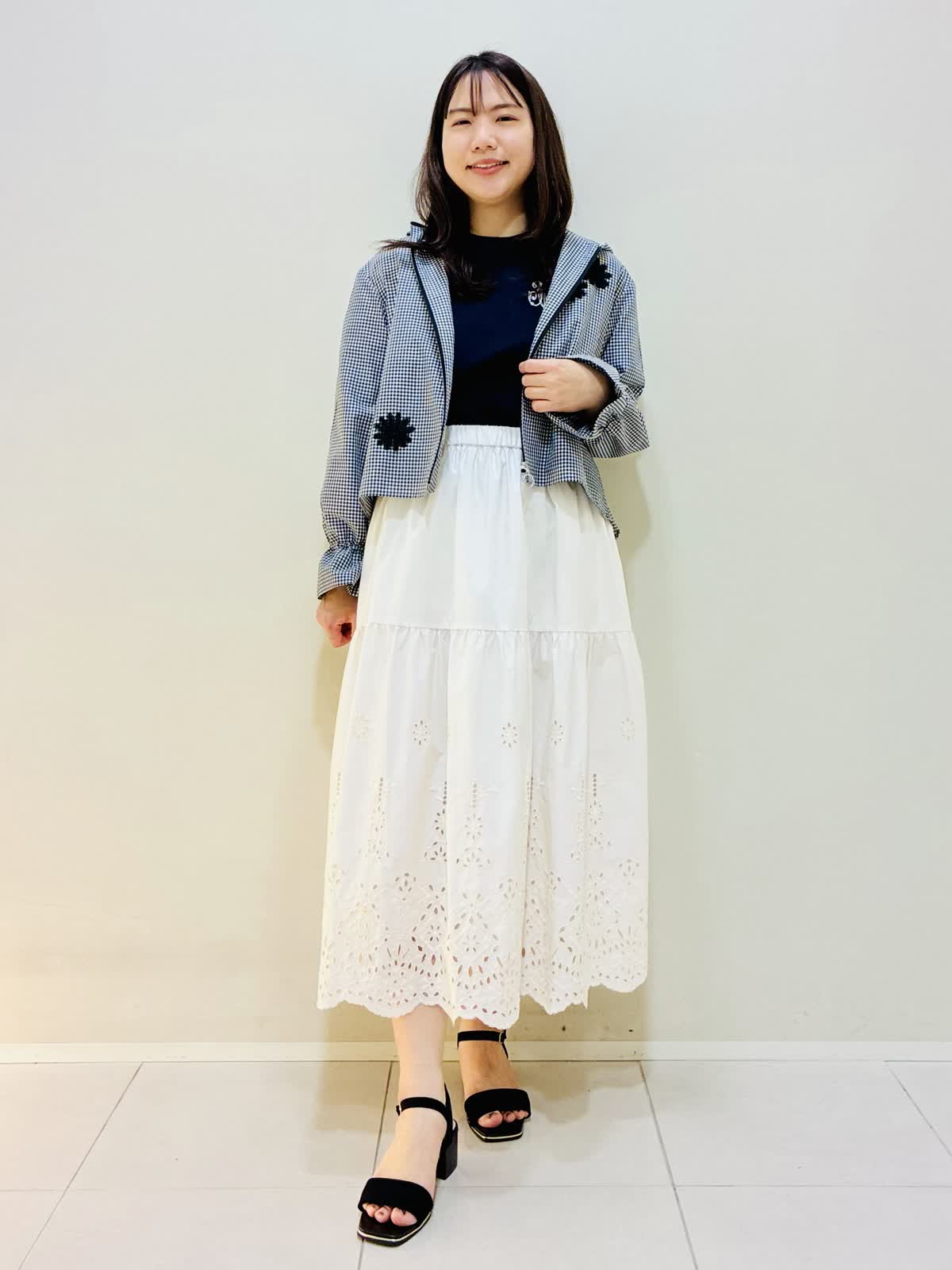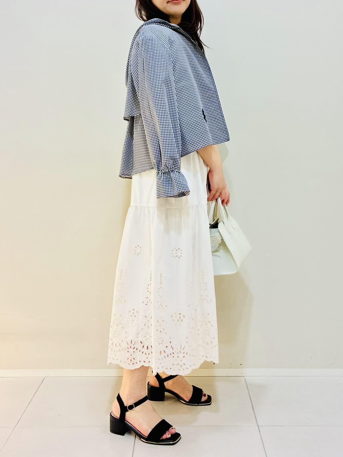 【着用サイズ】 パーカー:格子:9号サイズ カットソー:ネイビー:9号サイズ スカート:アイボリー:9号サイズ バッグ:オフホワイト 『お出かけコーデ』 軽い羽織でワンピースやスカートに相性バッチリです。 カットソーは後ろファスナーでスッキリしたラインなのでウエストアウトもおすすめです。 スカートは総ゴムで着心地も良く裾のレースがかわいいです。 バッグはショルダーにもなるタイプです。